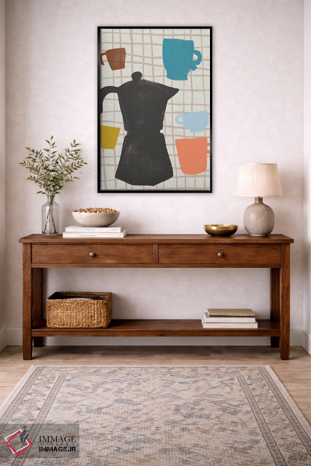 براساس پالت ترکیبی اثر، قاب تیک گرم (چوبی) پیشنهاد اول است و مشکی مات (فریم متوسط) مکمل. برای سفارشهای پروژهای با ابعاد و قابهای اختصاصی با ایماژ در تماس باشید.