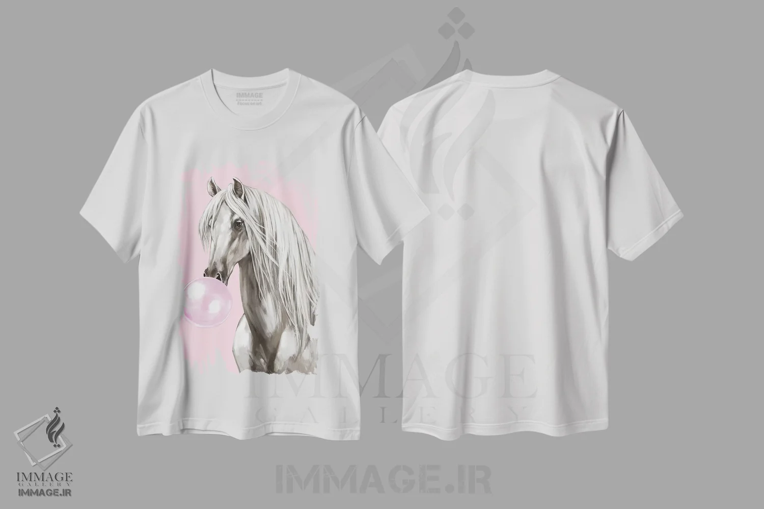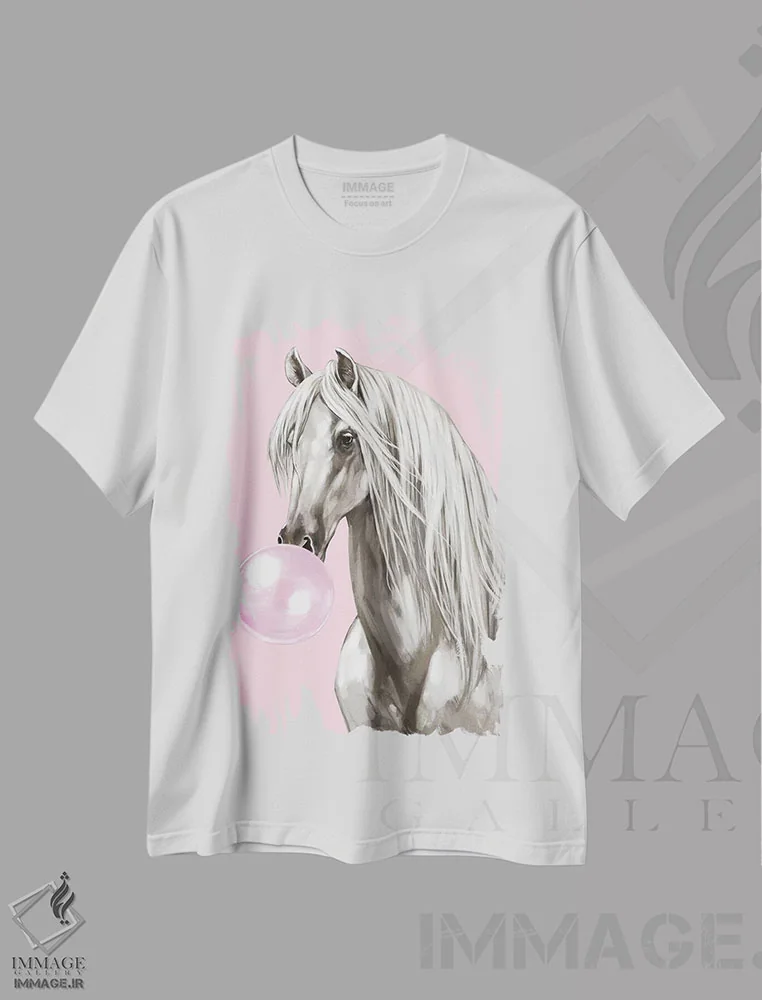 تیشرت طرح دار اسب سفید با آدامس بادکنکی در رنگ صورتی اثر بگ نوز ورک