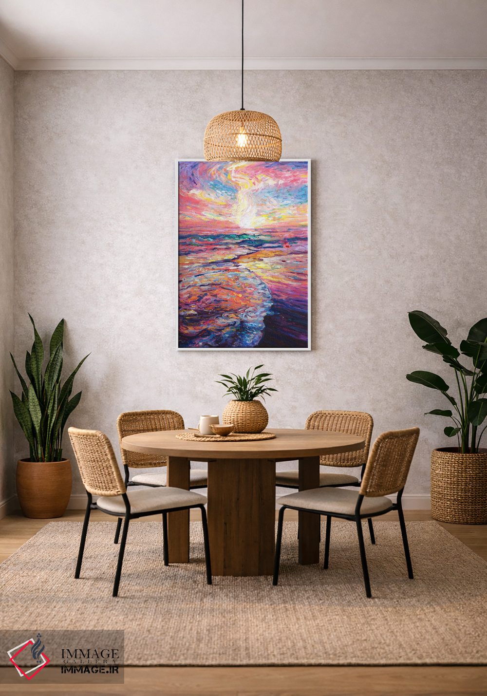 براساس پالت ترکیبی اثر، قاب تیک گرم (چوبی) پیشنهاد اول است و مشکی مات (فریم متوسط) مکمل. برای سفارشهای پروژهای با ابعاد و قابهای اختصاصی با ایماژ در تماس باشید.