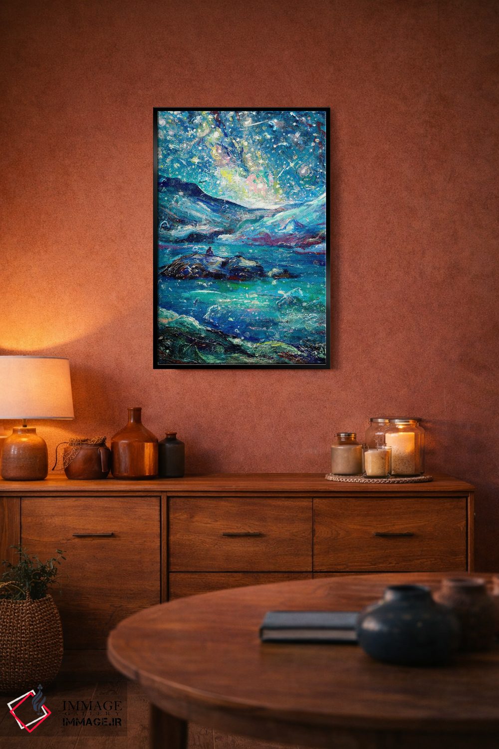 براساس پالت ترکیبی اثر، قاب تیک گرم (چوبی) پیشنهاد اول است و مشکی مات (فریم متوسط) مکمل. برای سفارشهای پروژهای با ابعاد و قابهای اختصاصی با ایماژ در تماس باشید.