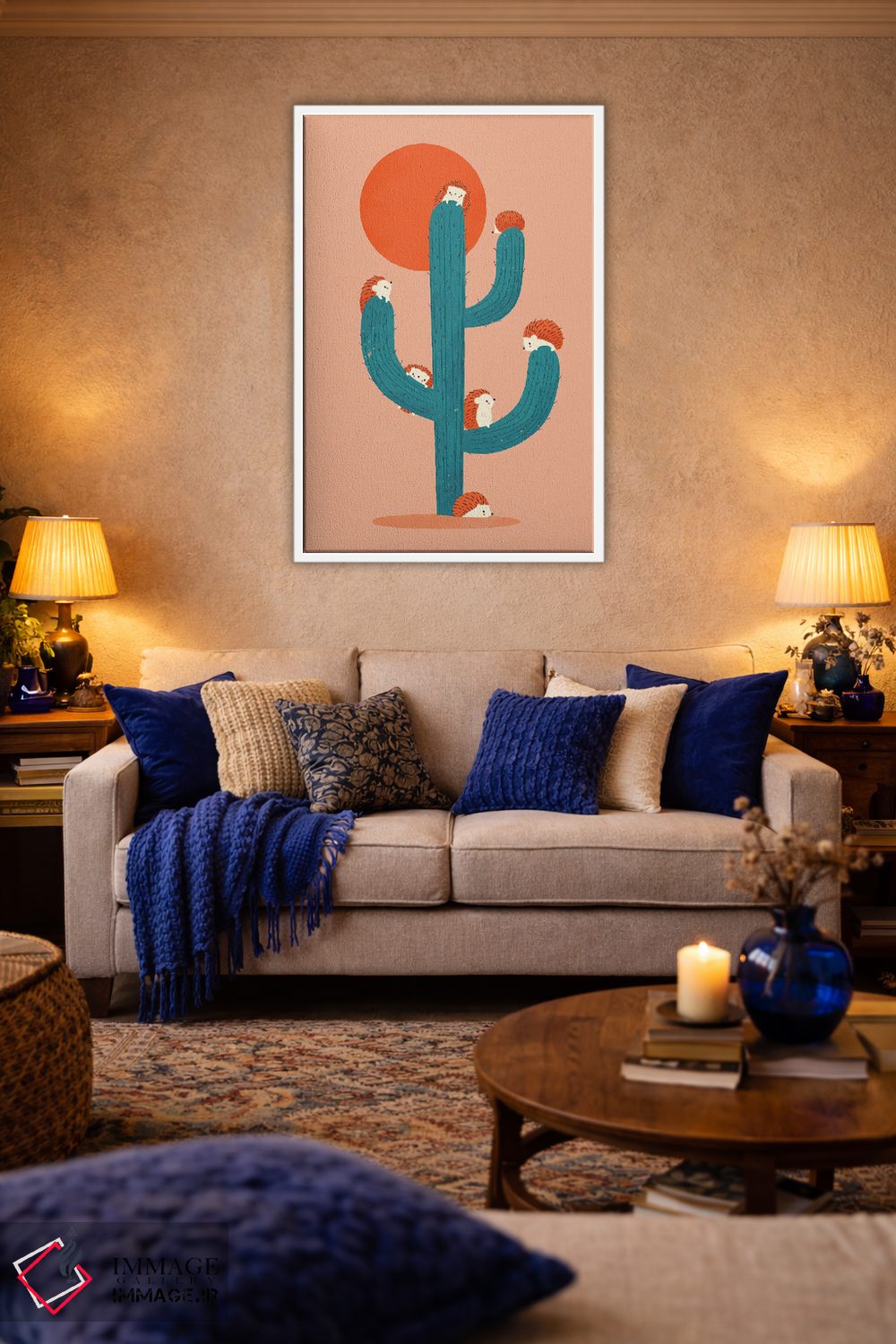 براساس پالت ترکیبی اثر، قاب تیک گرم (چوبی) پیشنهاد اول است و مشکی مات (فریم متوسط) مکمل. برای سفارشهای پروژهای با ابعاد و قابهای اختصاصی با ایماژ در تماس باشید.