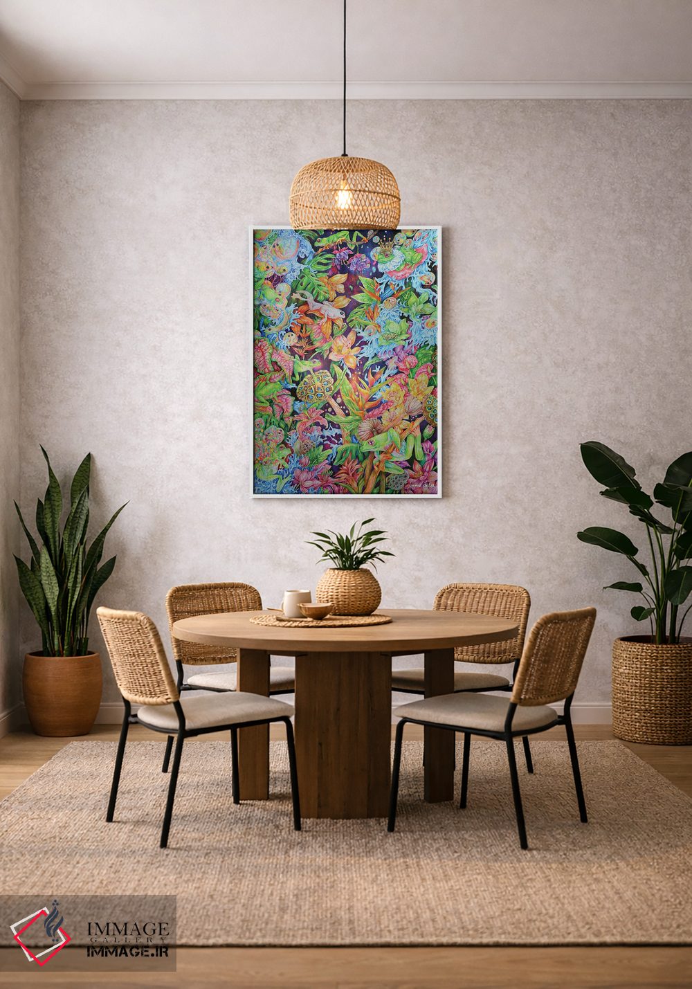 بوم گالری ایماژ طوری طراحی شده که اثر روی دیوار «پرداختشده» و حرفهای دیده شود—نه پرزرقوبرقِ بیپایه؛ بلکه دقیق و خوشپرداخت. بافت ظریف کنواس باعث میشود حس اثر هنری را در نگاه نزدیک نگه میدارد. با کنترل تونها، کمک میکند رنگها روی دیوار واقعیتر بنشینند بدون اغراق؛ فقط دقیقتر. این کیفیت برای دکورهای دقیقتر و پروژههای حرفهای خودش را بهتر نشان میدهد؛ و اگر بخواهید، میتوان چیدمان را برای گالریوال هم پیشنهاد داد.