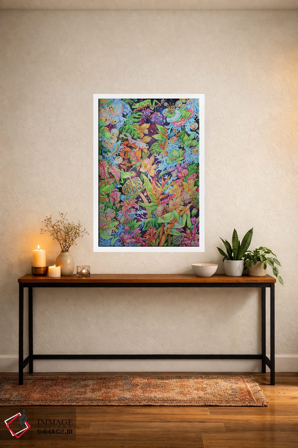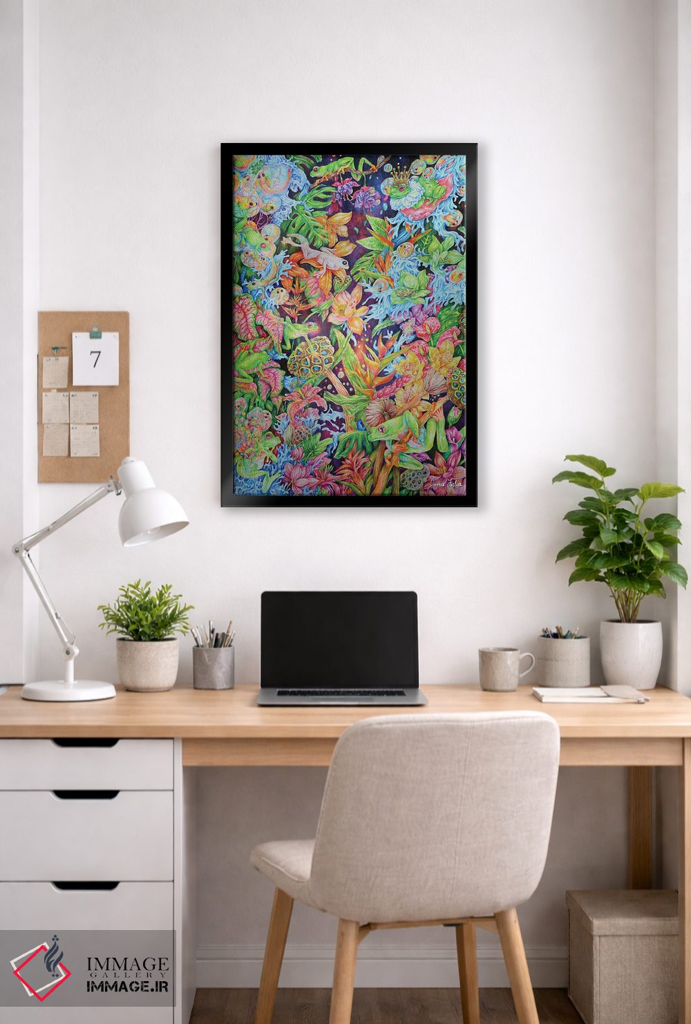 براساس پالت ترکیبی اثر، قاب تیک گرم (چوبی) پیشنهاد اول است و مشکی مات (فریم متوسط) مکمل. برای سفارشهای پروژهای با ابعاد و قابهای اختصاصی با ایماژ در تماس باشید.