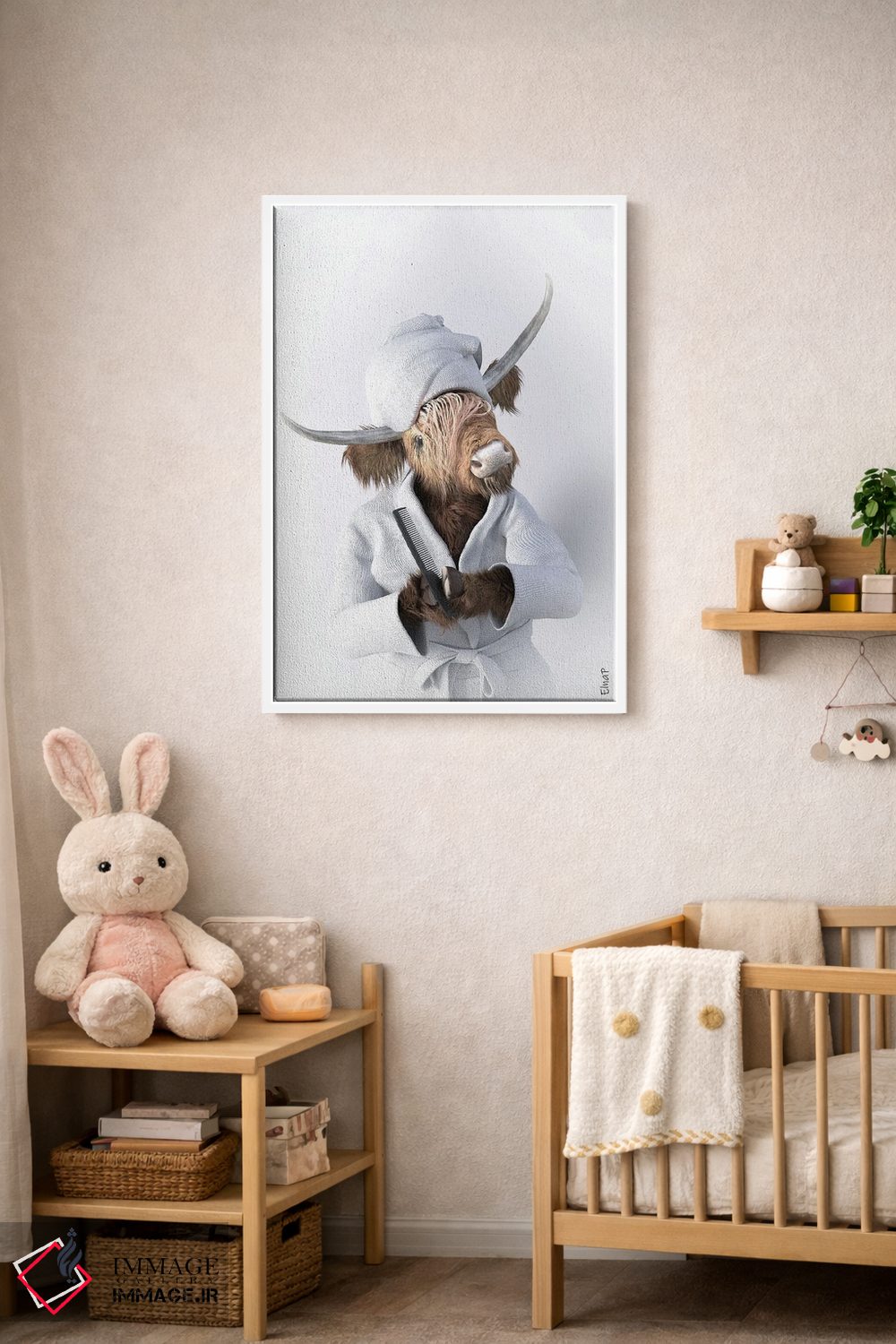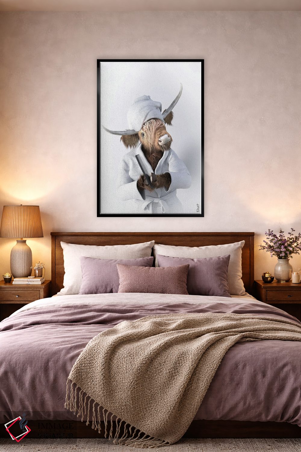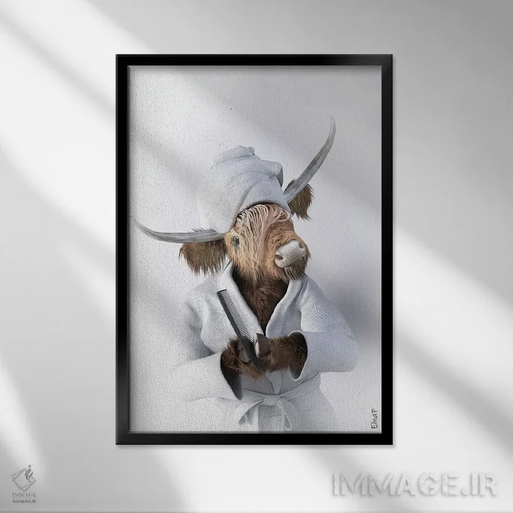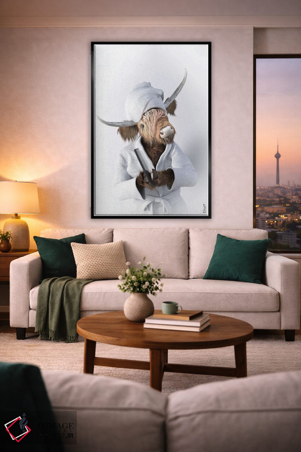 اگر میخواهید دیوار کمی سرزندگیِ محترمانه داشته باشد، «طرح گاو کوهستانی برای حمام» اثرِ «جوفری فیلیپ» به دیوار، انرژیِ نرم و زنده میدهد، برای دکورهایی با رنگهای خنثی گزینهٔ مناسبیست. هم فضا را گرم میکند، هم شلوغش نمیکند.