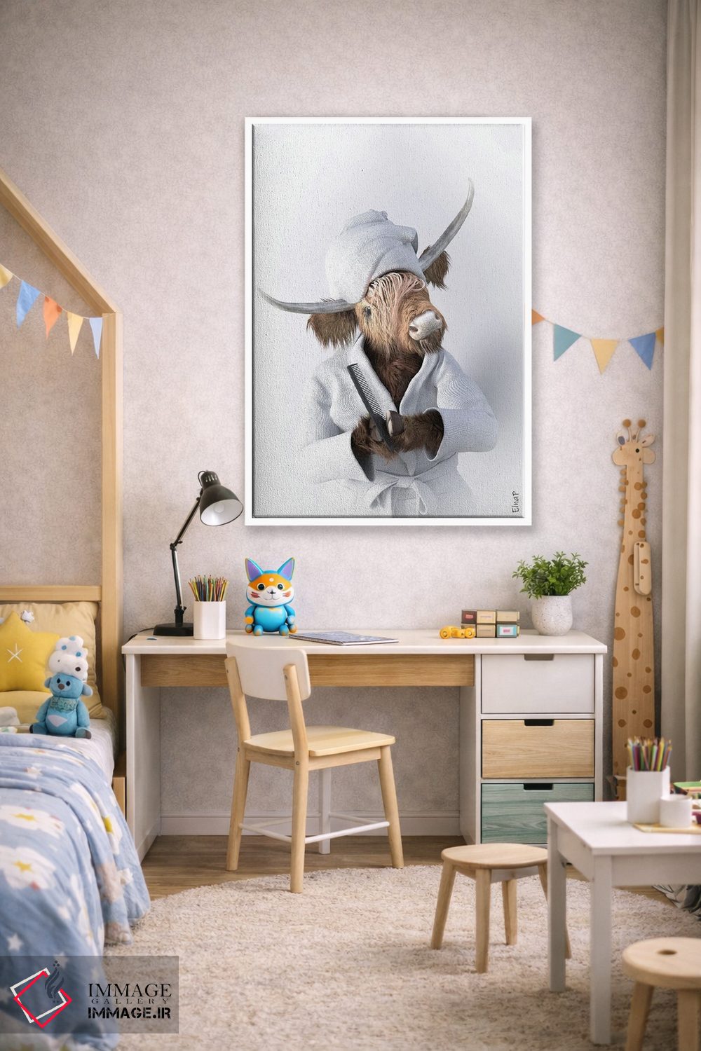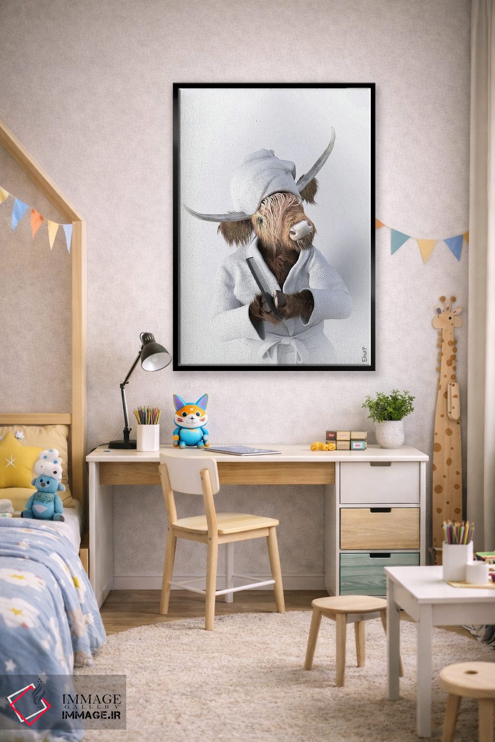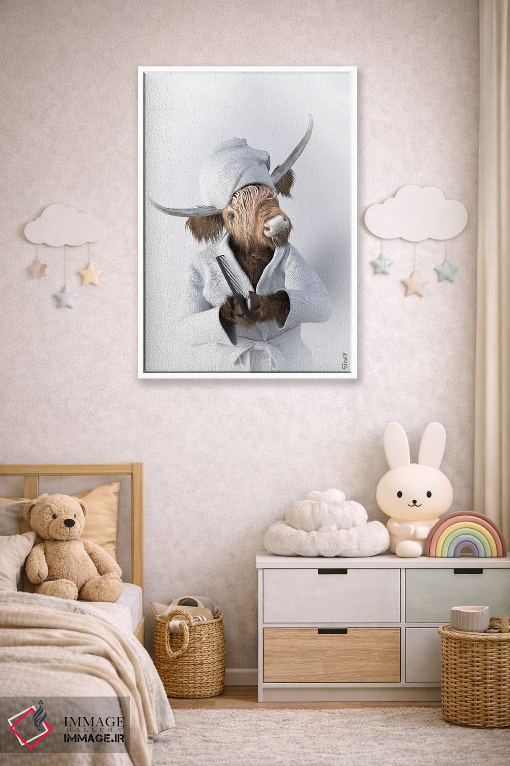 اگر میخواهید دیوار کمی سرزندگیِ محترمانه داشته باشد، «طرح گاو کوهستانی برای حمام» اثرِ «جوفری فیلیپ» به دیوار، انرژیِ نرم و زنده میدهد، برای دکورهایی با رنگهای خنثی گزینهٔ مناسبیست. هم فضا را گرم میکند، هم شلوغش نمیکند.