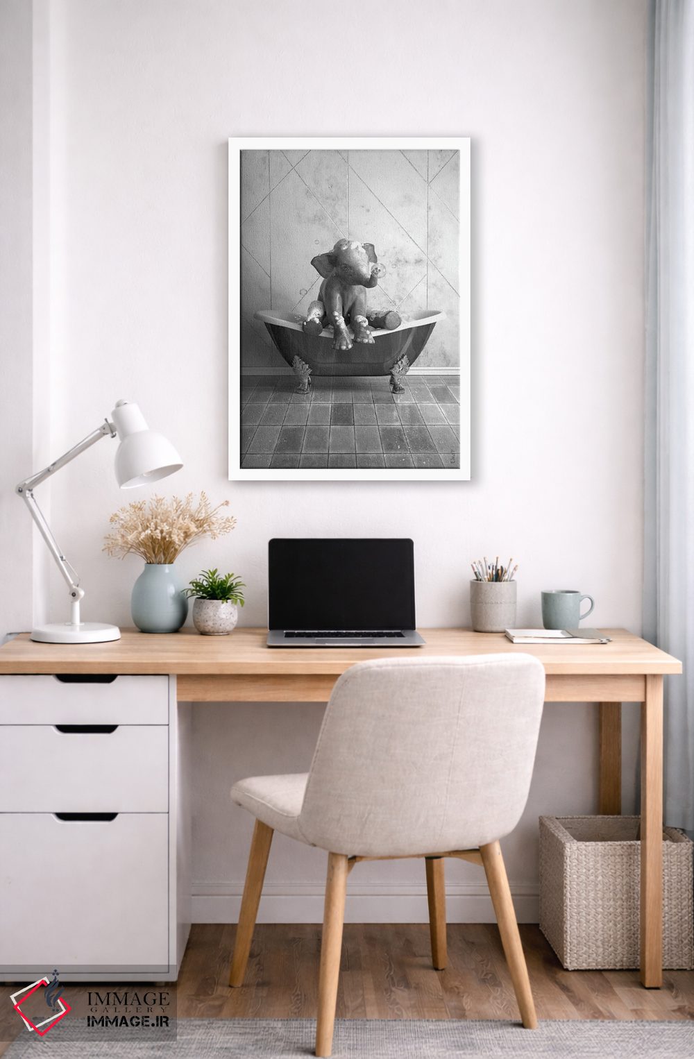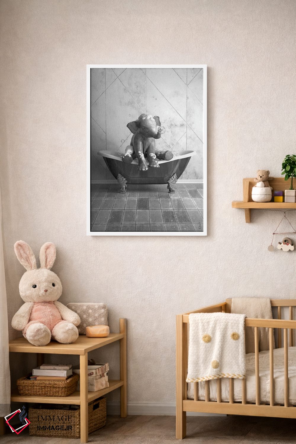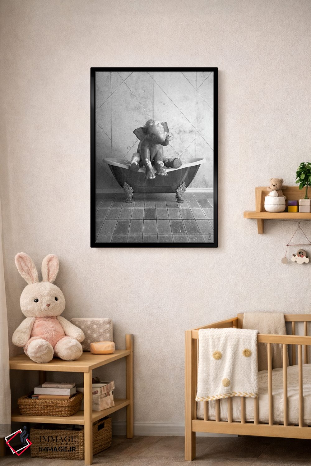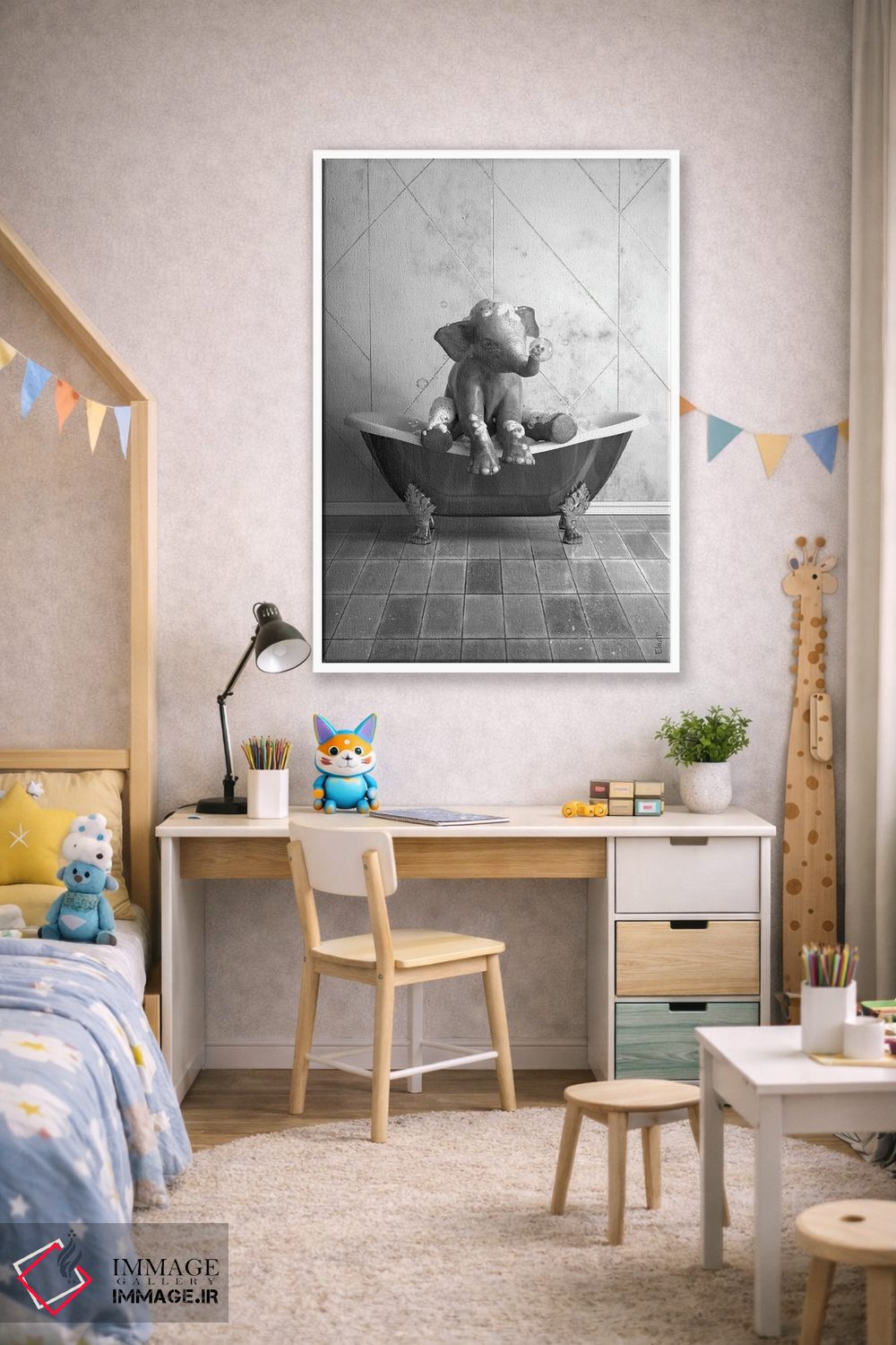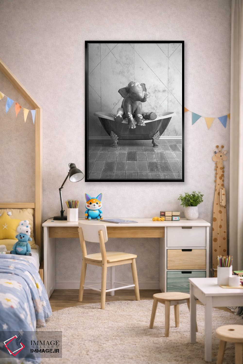«طرح فیل برای حمام، پوستر بامزه فیل» اثرِ «جوفری فیلیپ» با زبانِ هنری و موضوعِ این اثر، انتخابی مناسب برای فضاهای مدرن و چیدمانهای امروزی است.