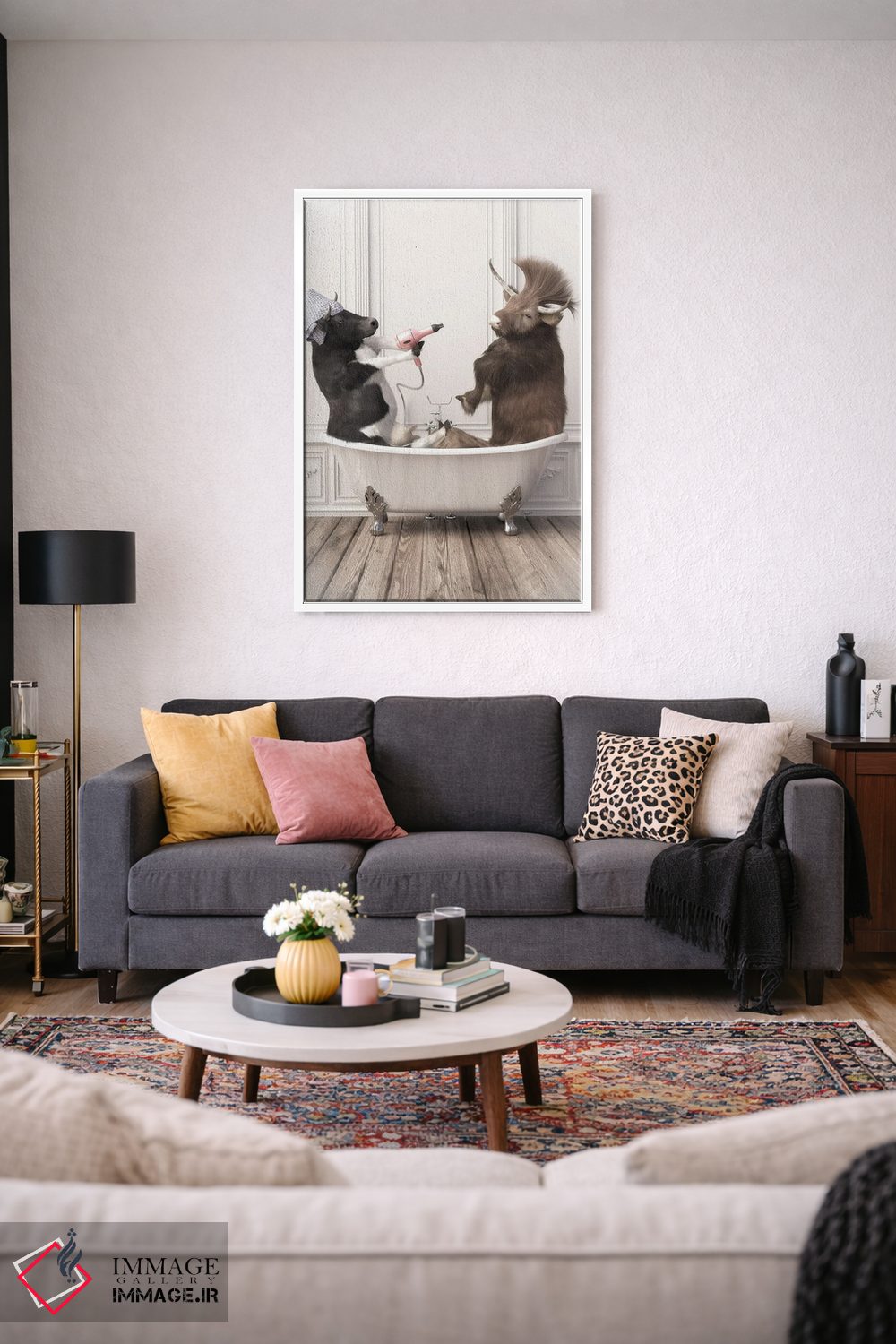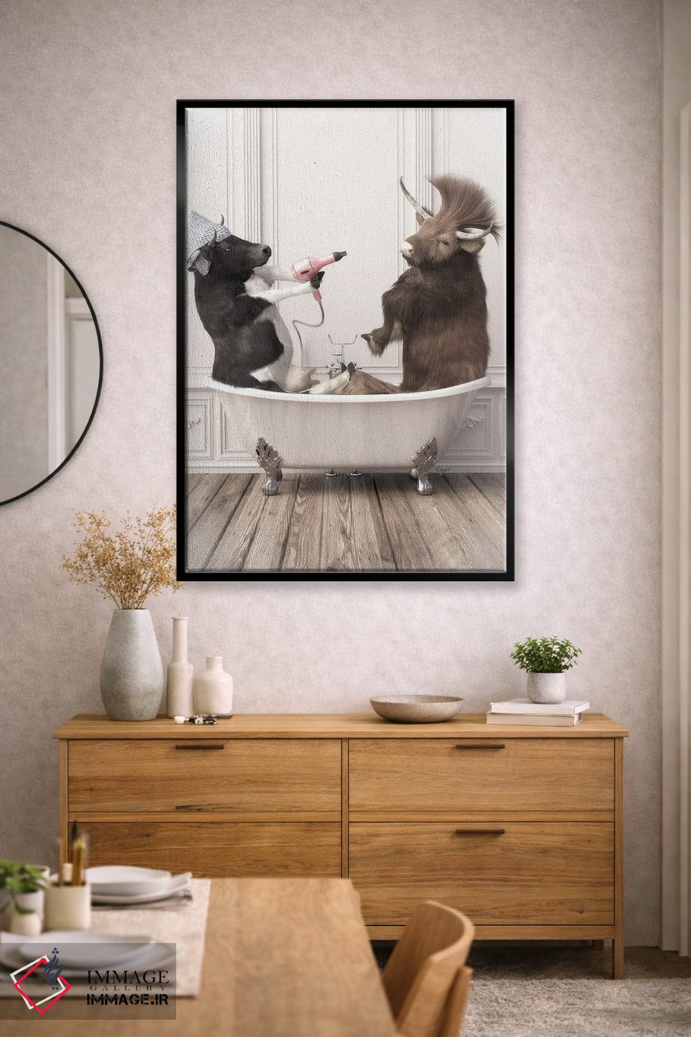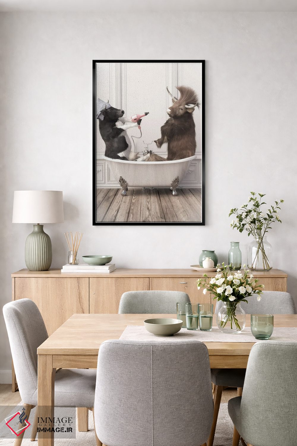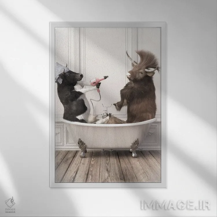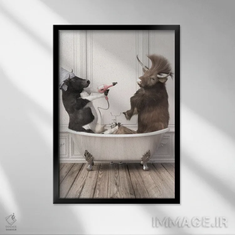 «گاوها در حمام» اثرِ «جوفری فیلیپ» از آن کارهاییست که مثل یک امضای بامزه اما متین عمل میکند؛ برای دکورهایی با رنگهای خنثی انتخاب خوبیست. هم فضا را گرم میکند، هم شلوغش نمیکند.