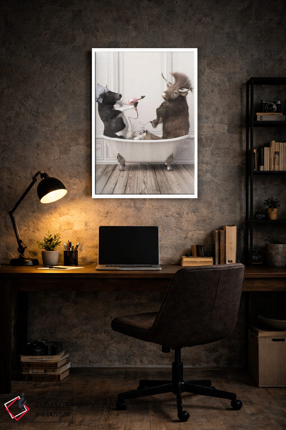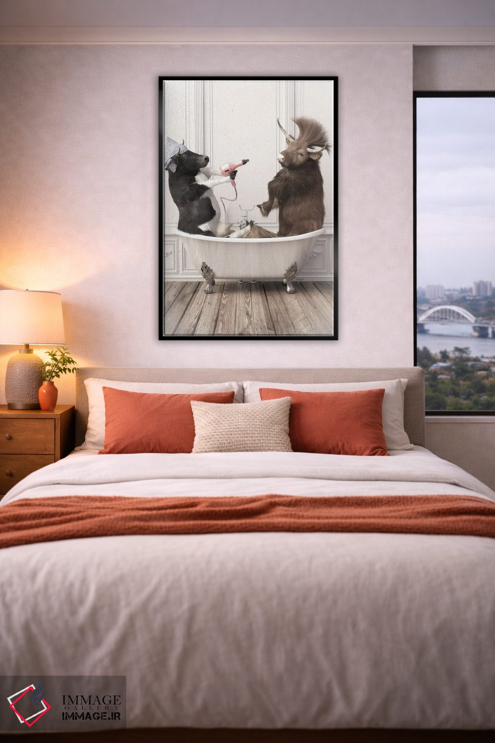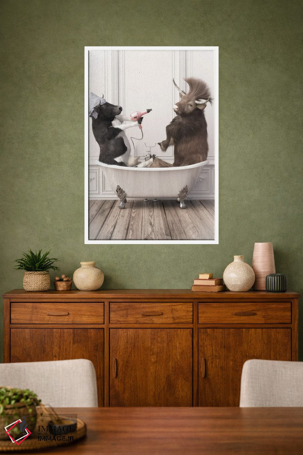«گاوها در حمام» اثرِ «جوفری فیلیپ» از آن کارهاییست که مثل یک امضای بامزه اما متین عمل میکند؛ برای دکورهایی با رنگهای خنثی انتخاب خوبیست. هم فضا را گرم میکند، هم شلوغش نمیکند.