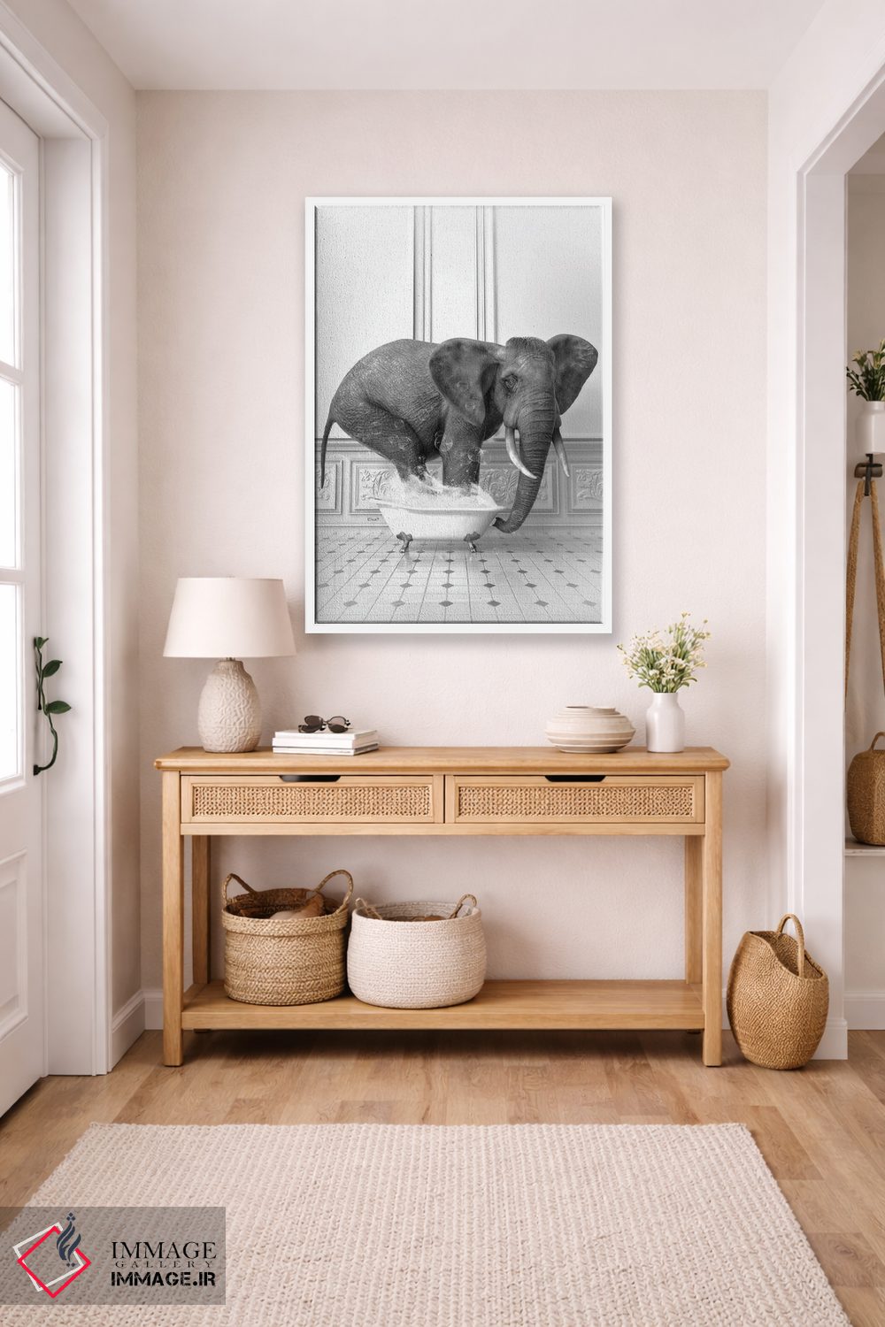 اگر میخواهید دیوار کمی سرزندگیِ محترمانه داشته باشد، «فیل در حمام سیاه و سفید» اثرِ «جوفری فیلیپ» به فضا، گرمیِ ملایم اضافه میکند، برای خانههایی با چوب و پارچههای گرم گزینهٔ مناسبیست. در کنار گیاهان و نور طبیعی، جذابتر هم میشود.