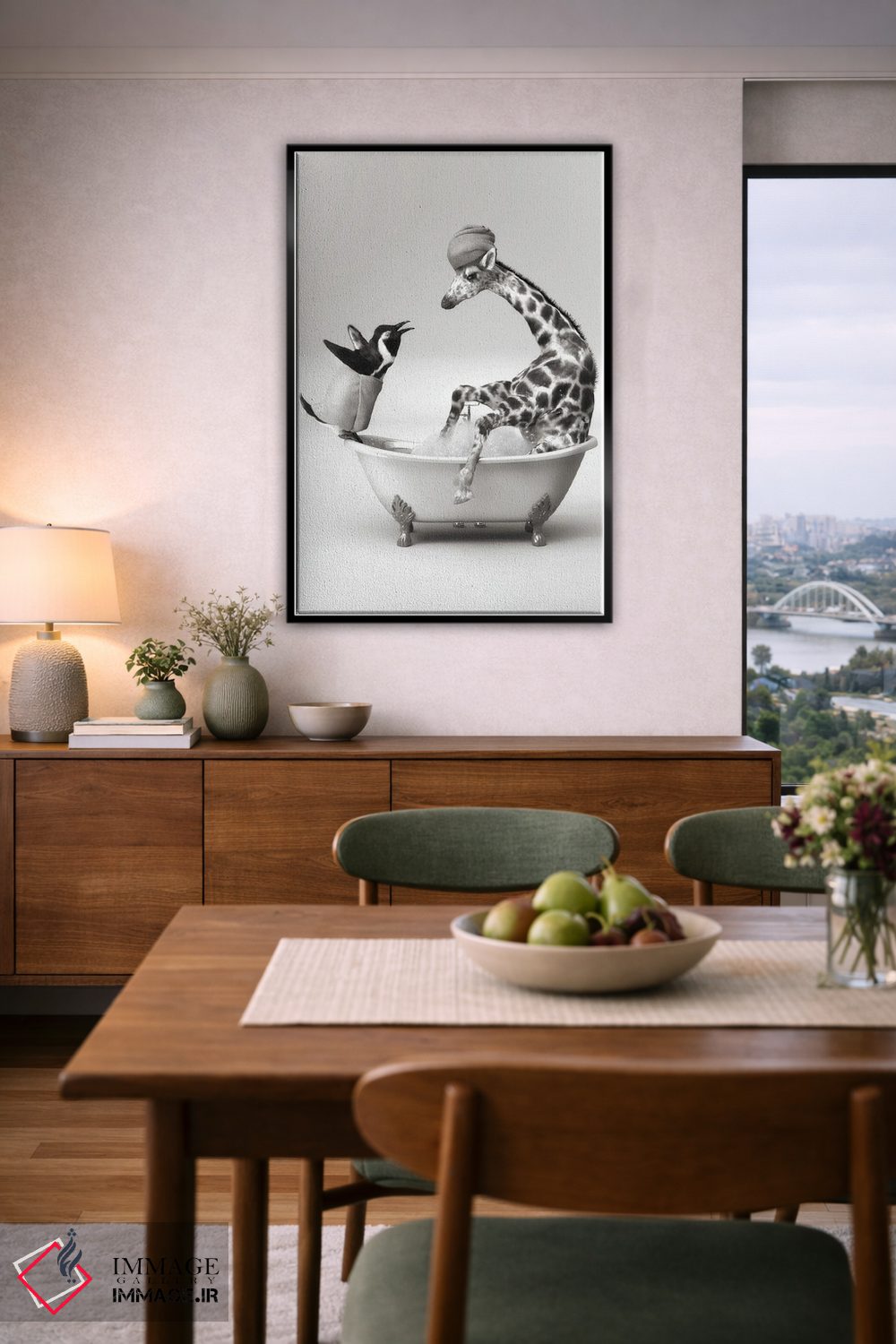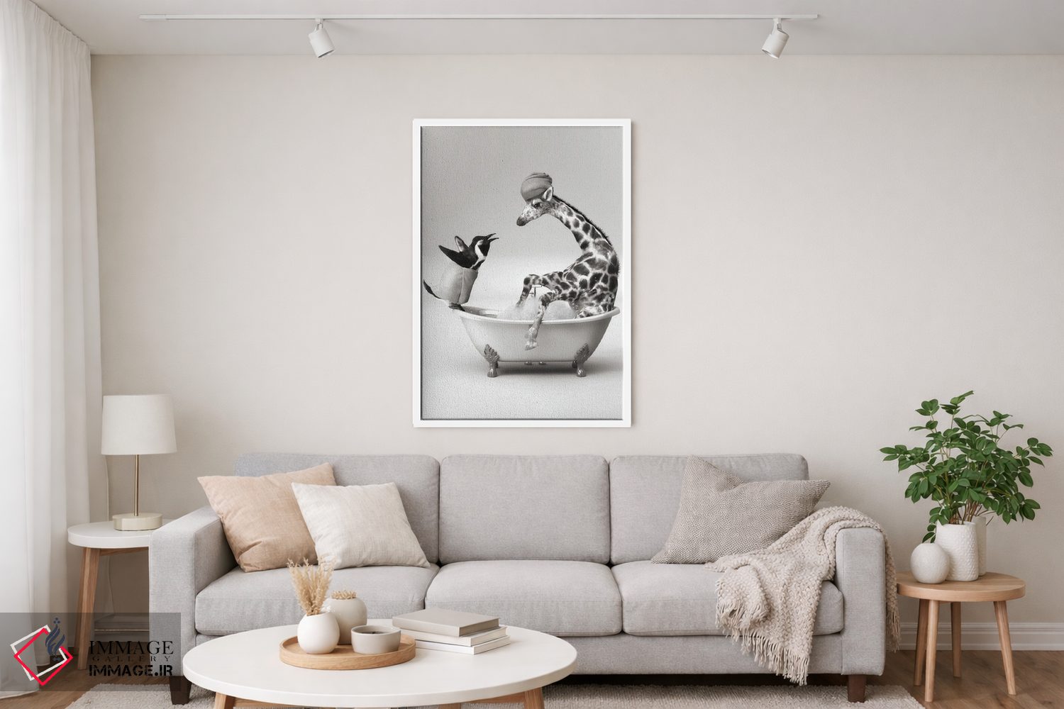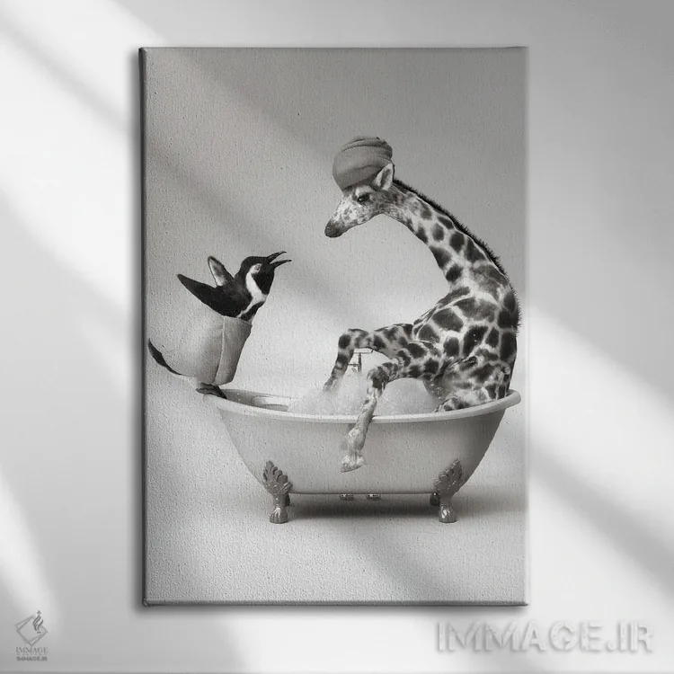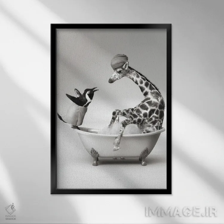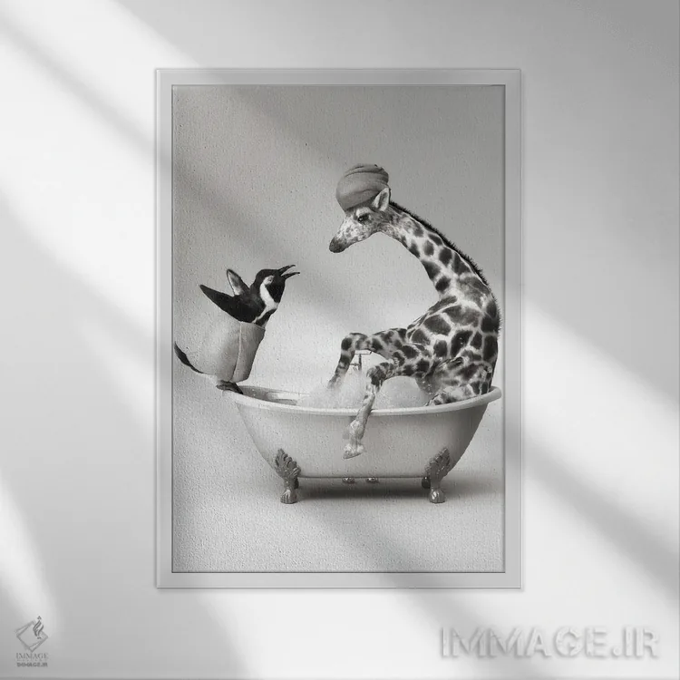 در «پنگوئن و زرافه در حمام» اثرِ «جوفری فیلیپ»، حضور حیوانات مثل یک امضای بامزه اما متین عمل میکند؛ برای دکورهایی با رنگهای خنثی انتخابی خوشسلیقه است. هم فضا را گرم میکند، هم شلوغش نمیکند.