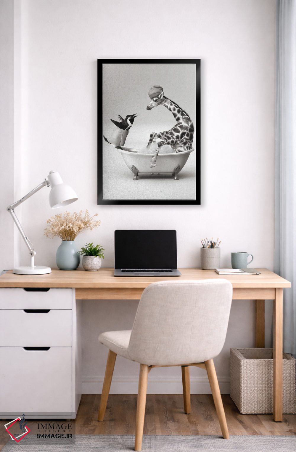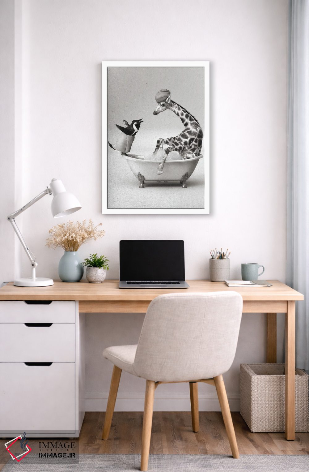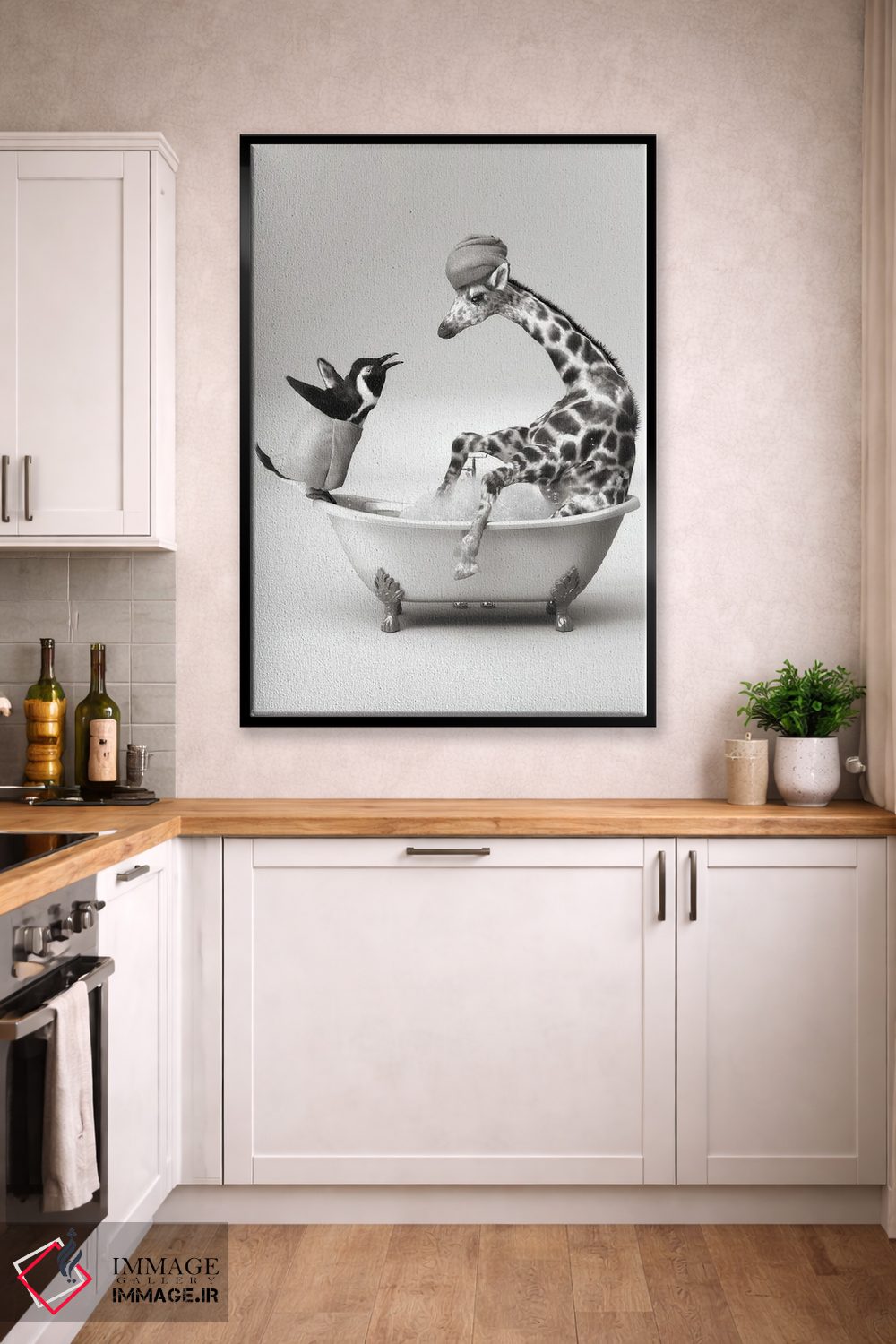 در «پنگوئن و زرافه در حمام» اثرِ «جوفری فیلیپ»، حضور حیوانات مثل یک امضای بامزه اما متین عمل میکند؛ برای دکورهایی با رنگهای خنثی انتخابی خوشسلیقه است. هم فضا را گرم میکند، هم شلوغش نمیکند.