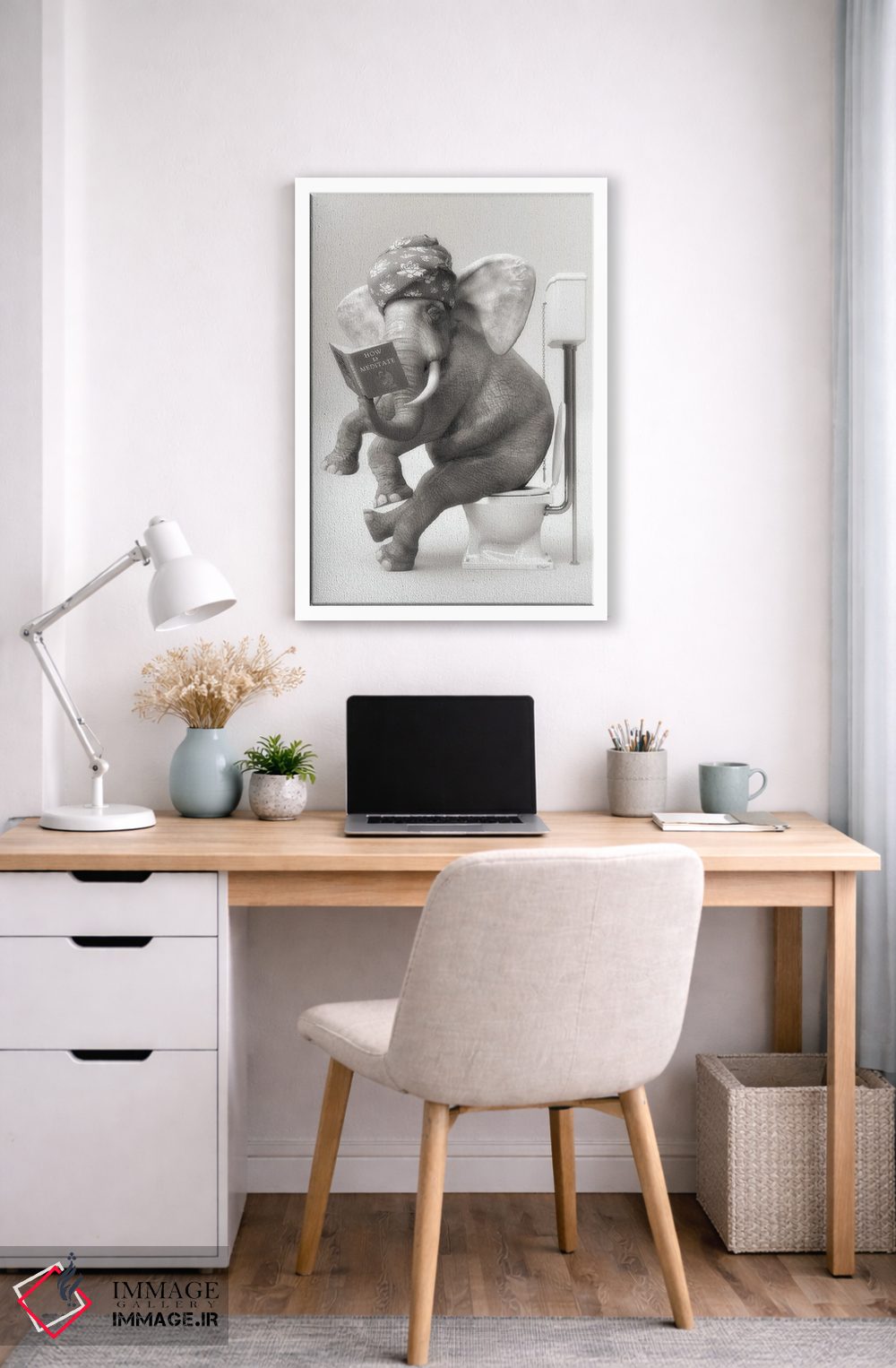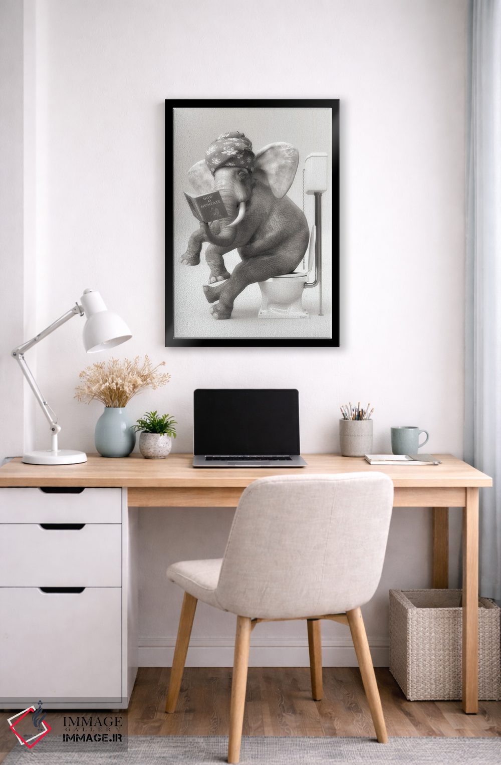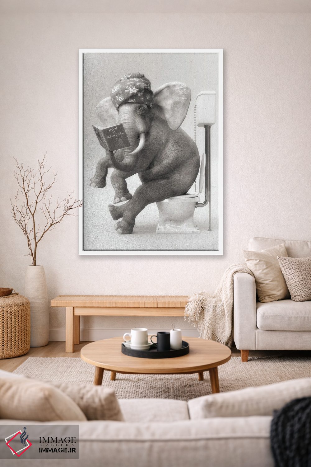 اگر دکور شما مدرن و کمرنگ است، «فیل در توالت با یک کتاب» اثرِ «جوفری فیلیپ» با موضوعِ این اثر در فضای دیجیتال سیاهوسفید گزینهی خوبی است.