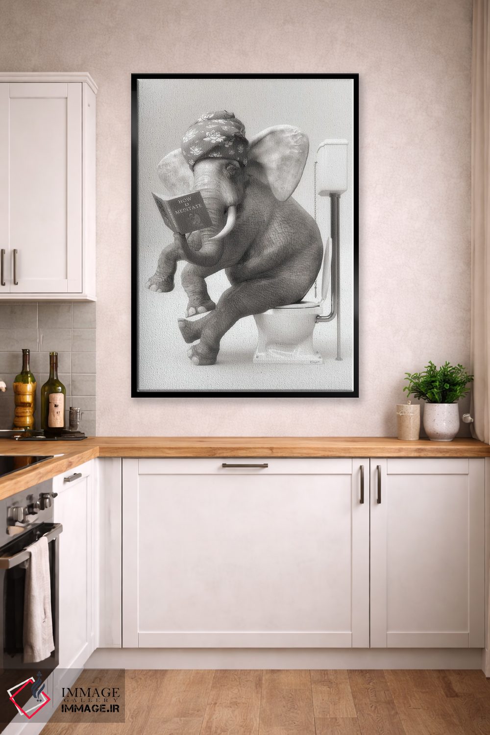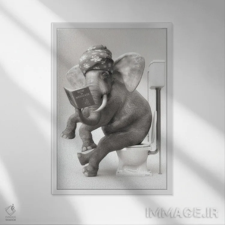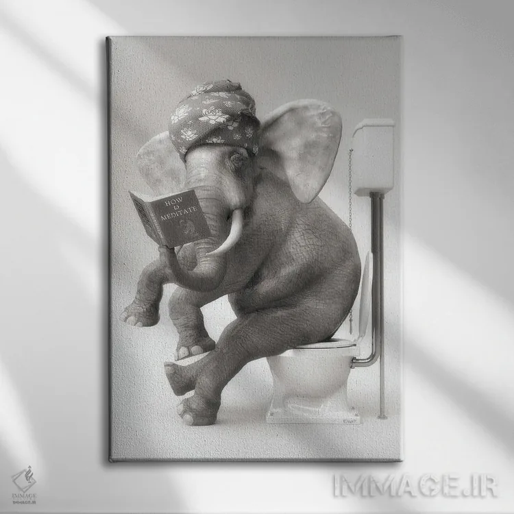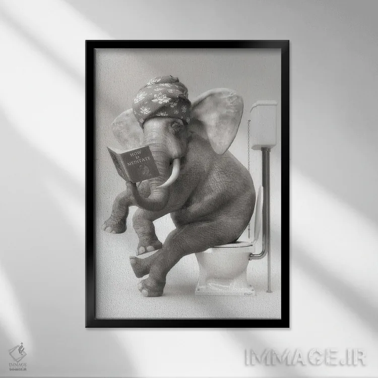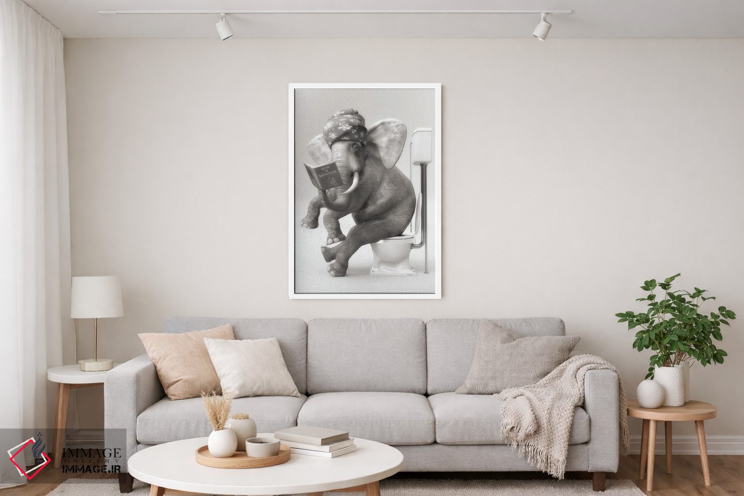 اگر دکور شما مدرن و کمرنگ است، «فیل در توالت با یک کتاب» اثرِ «جوفری فیلیپ» با موضوعِ این اثر در فضای دیجیتال سیاهوسفید گزینهی خوبی است.
