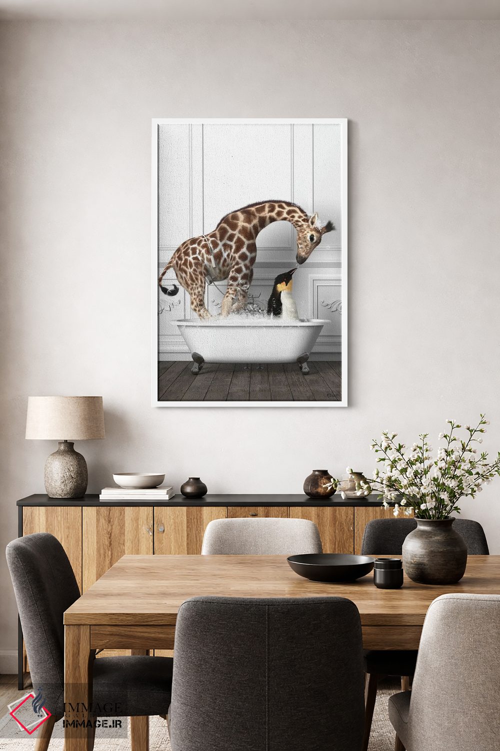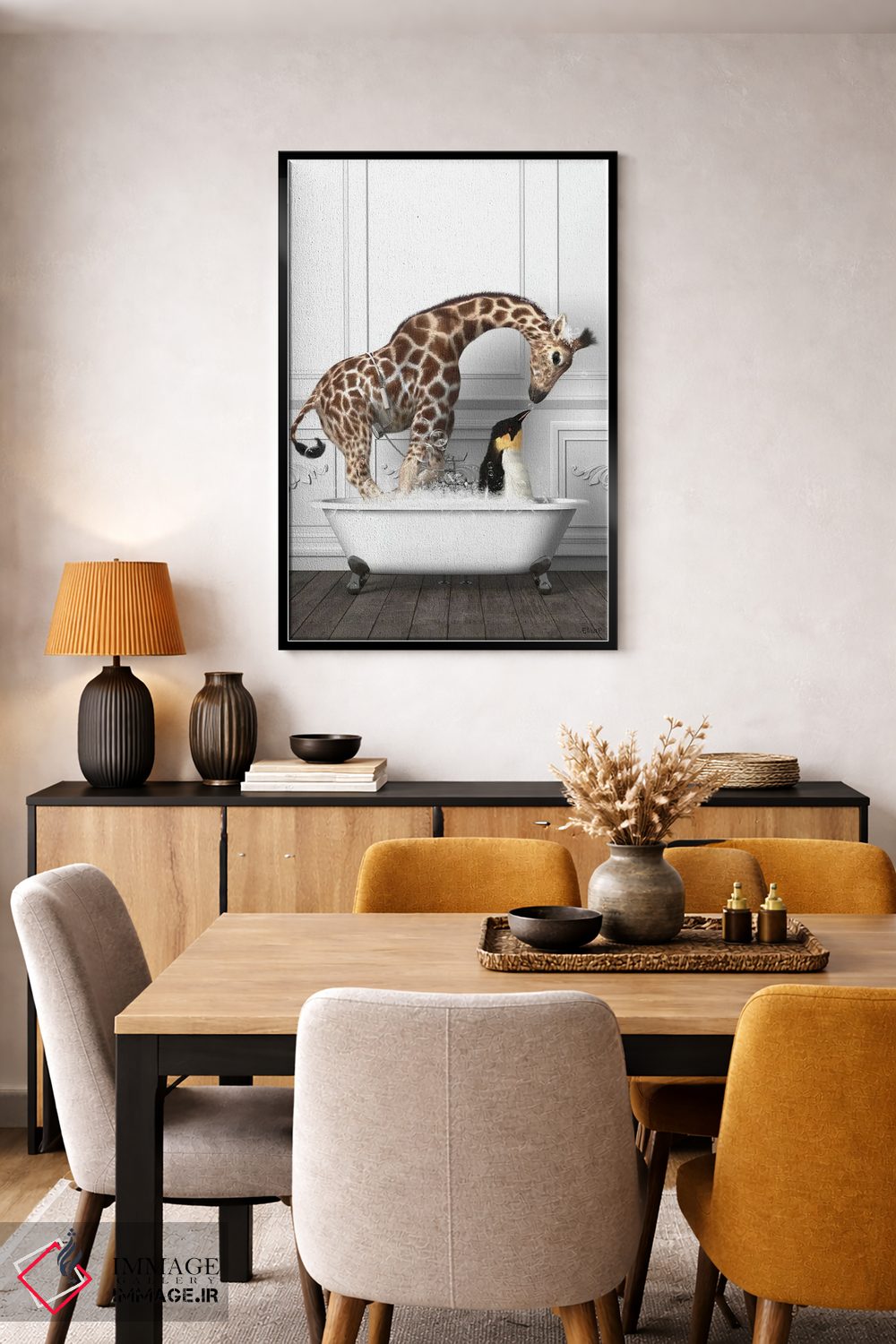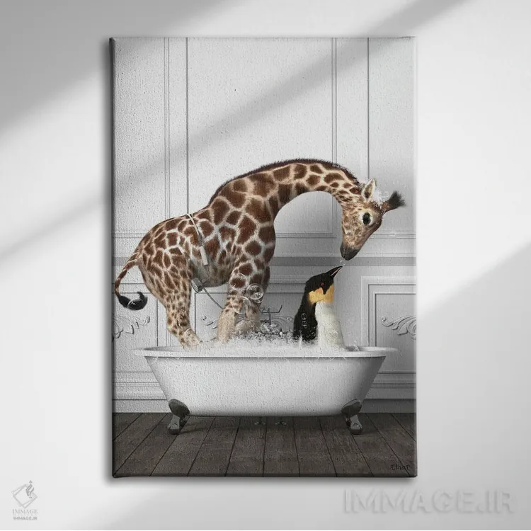 این اثر با عنوان «پنگوئنها و زرافه در حمام در حال خوشگذرانی» اثرِ «جوفری فیلیپ» حس طبیعت را بیدغدغه وارد خانه میکند؛ برای دکورهایی با رنگهای خنثی انتخابی خوشسلیقه است. در کنار گیاهان و نور طبیعی، جذابتر هم میشود.