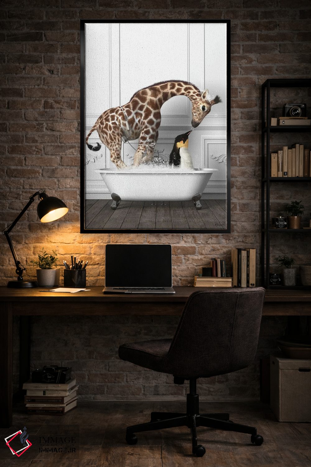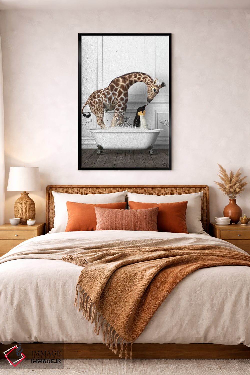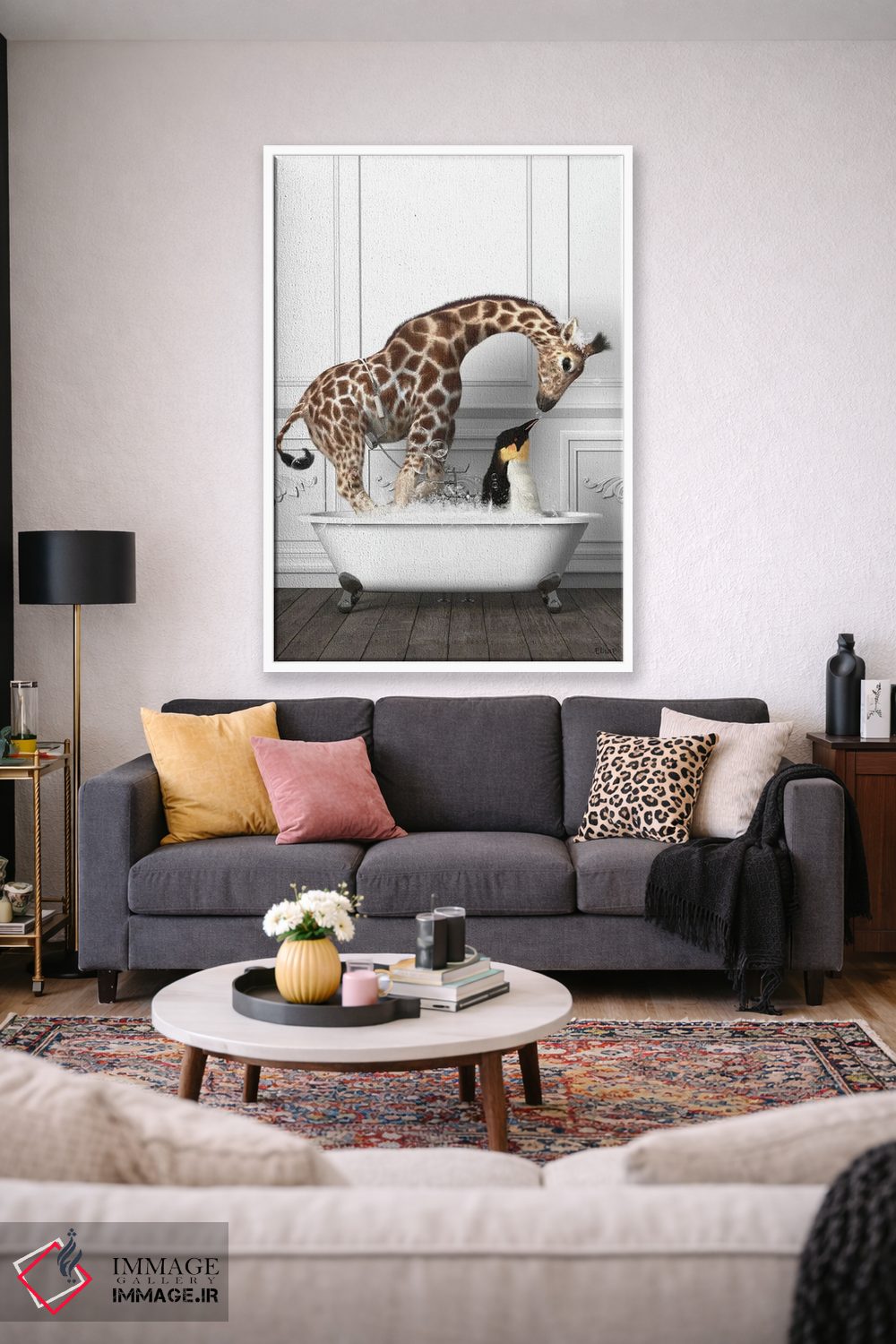 این اثر با عنوان «پنگوئنها و زرافه در حمام در حال خوشگذرانی» اثرِ «جوفری فیلیپ» حس طبیعت را بیدغدغه وارد خانه میکند؛ برای دکورهایی با رنگهای خنثی انتخابی خوشسلیقه است. در کنار گیاهان و نور طبیعی، جذابتر هم میشود.