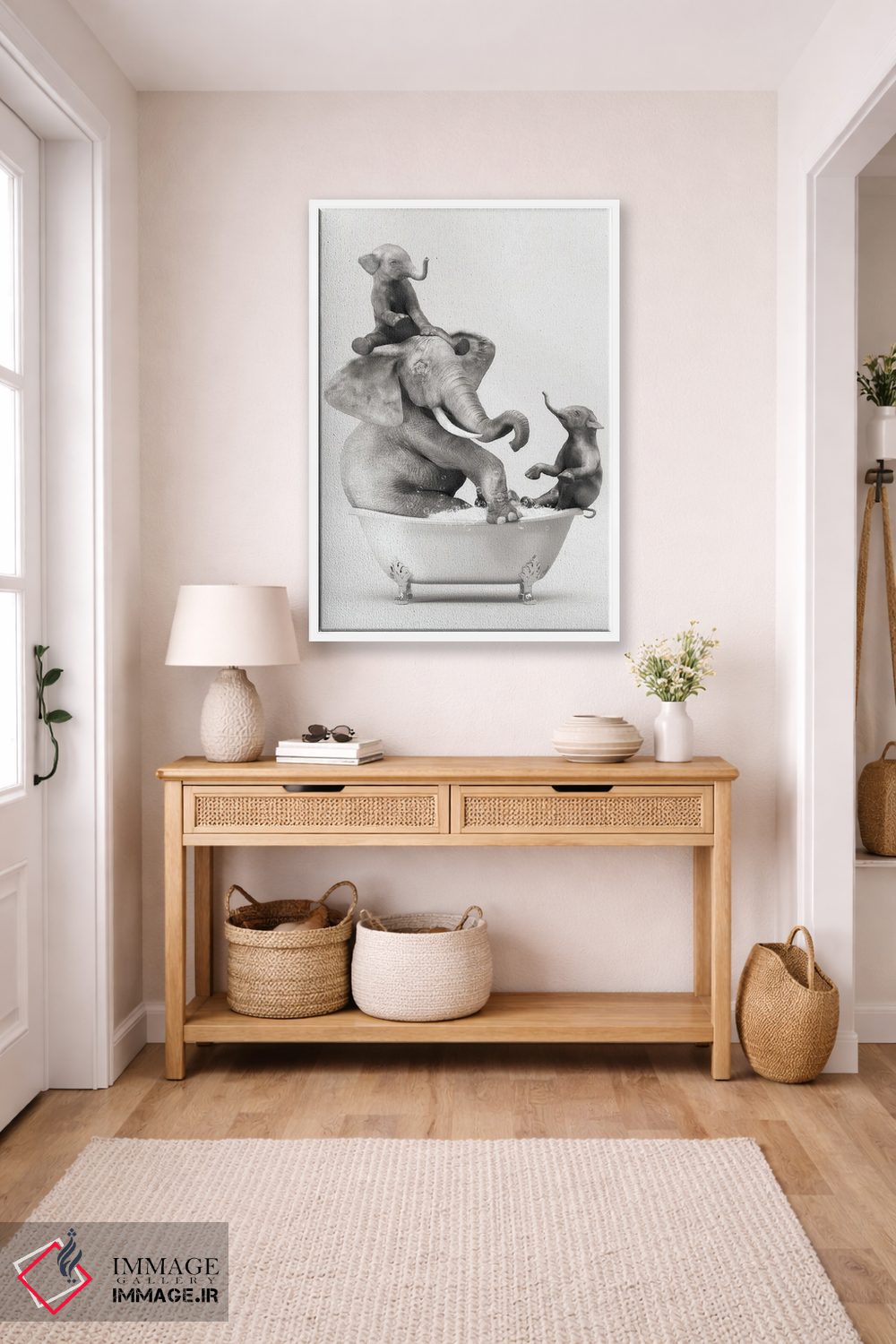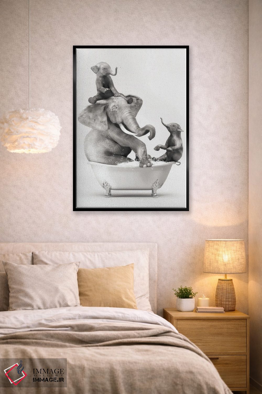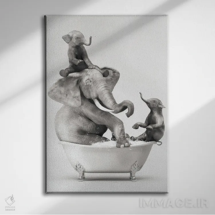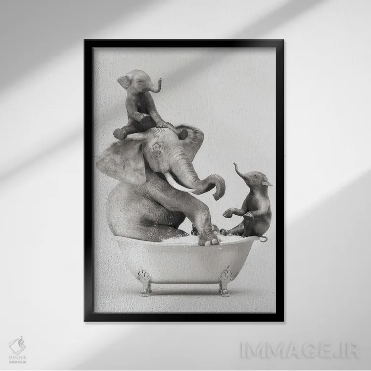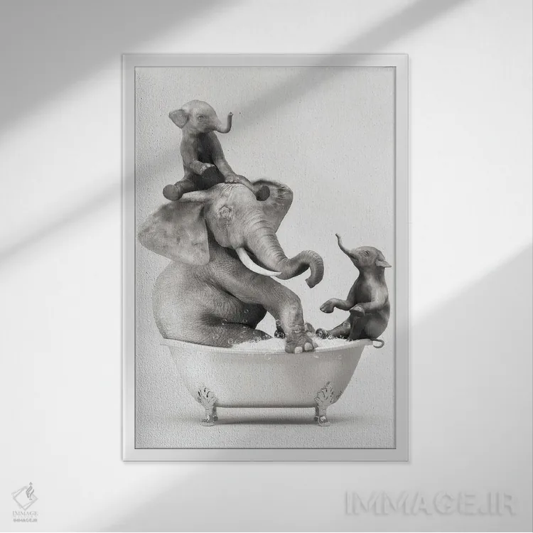 در «فیل و بچه در حمام در حال خوشگذرانی» اثرِ «جوفری فیلیپ»، تاکید روی خوانایی و ریتم حروف است؛ مناسب برای فضاهای پررفتوآمد مثل راهرو و ورودی.