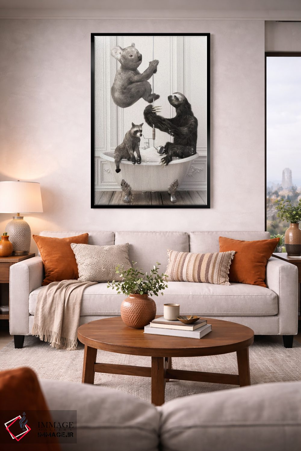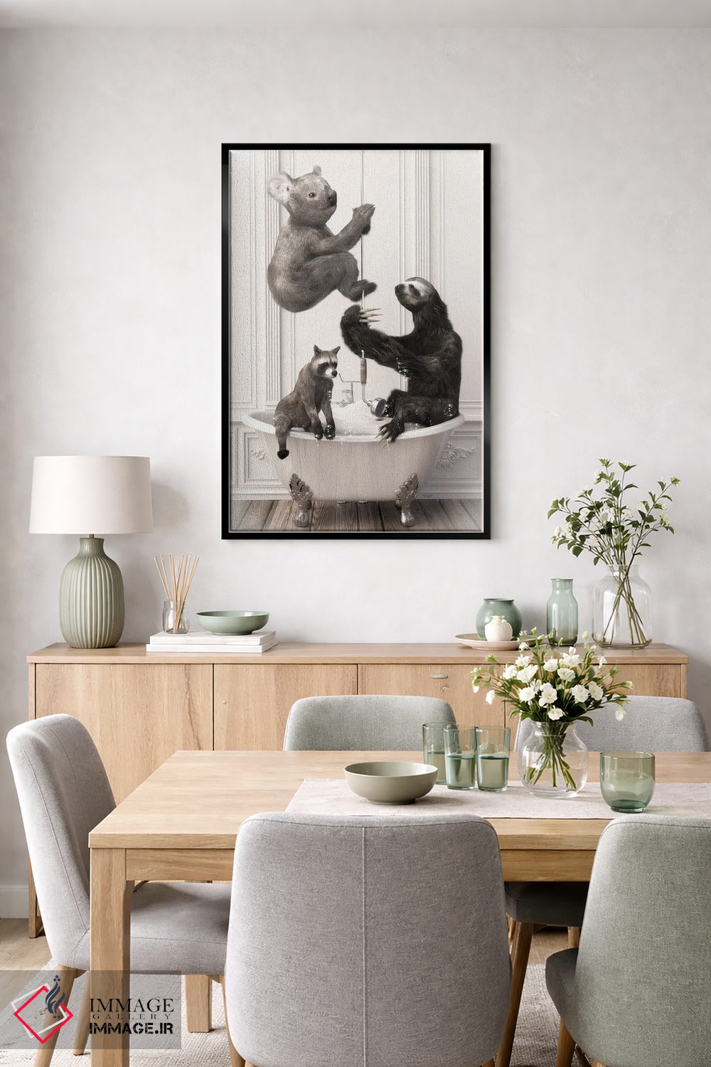 براساس پالت خنثی اثر، قاب بلوط روشن (چوبی) پیشنهاد اول است و استخوانی ملایم مکمل. برای سفارشهای پروژهای با ابعاد و قابهای اختصاصی با ایماژ در تماس باشید.