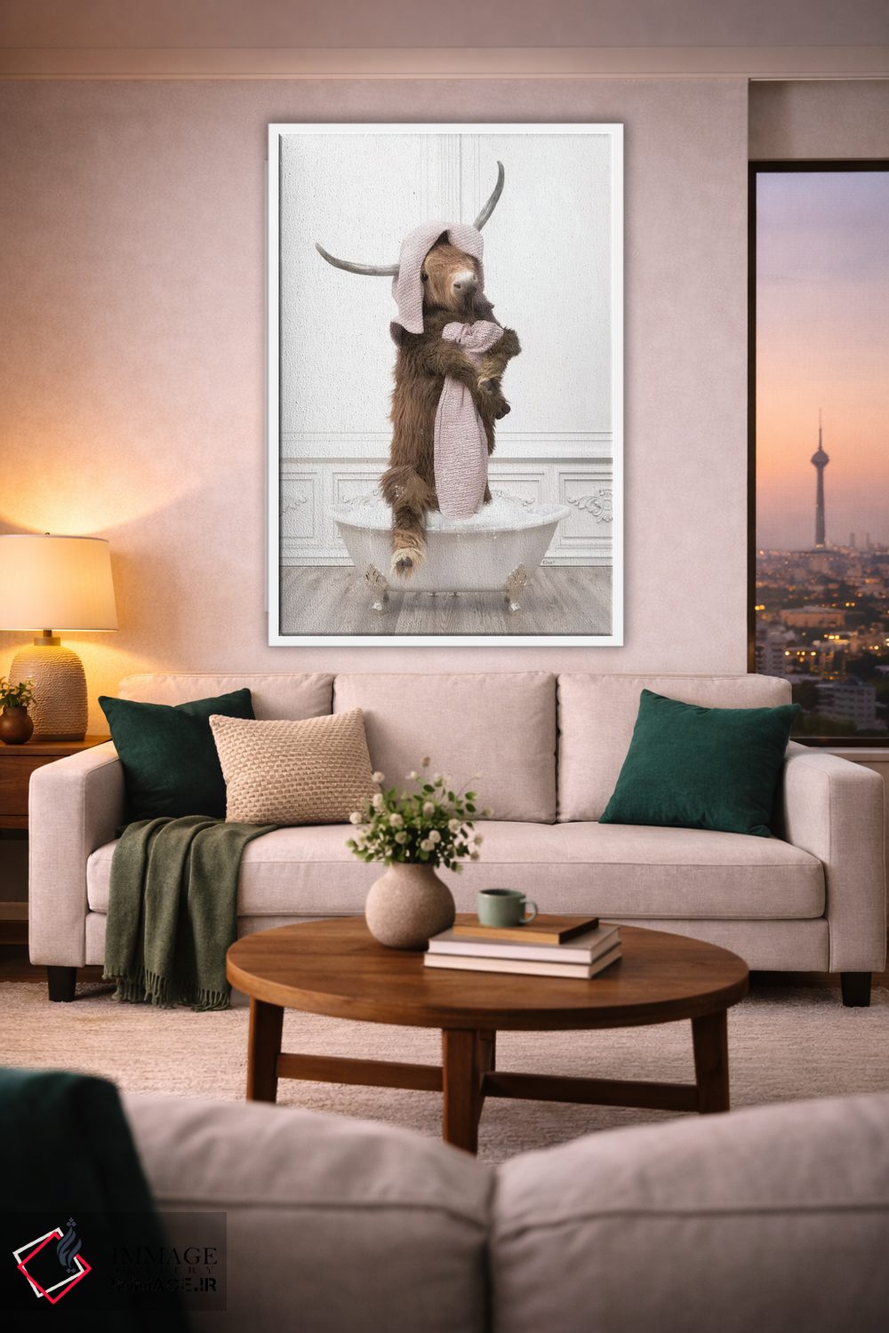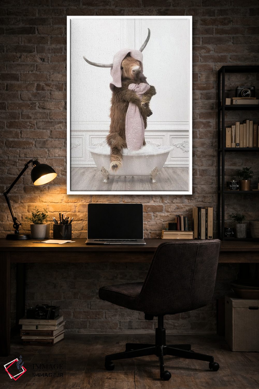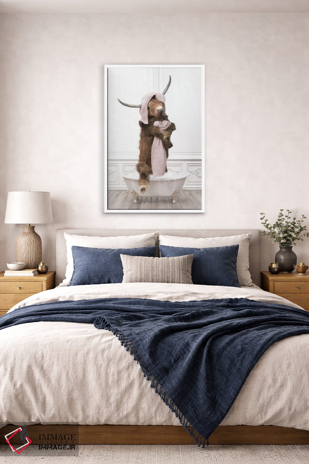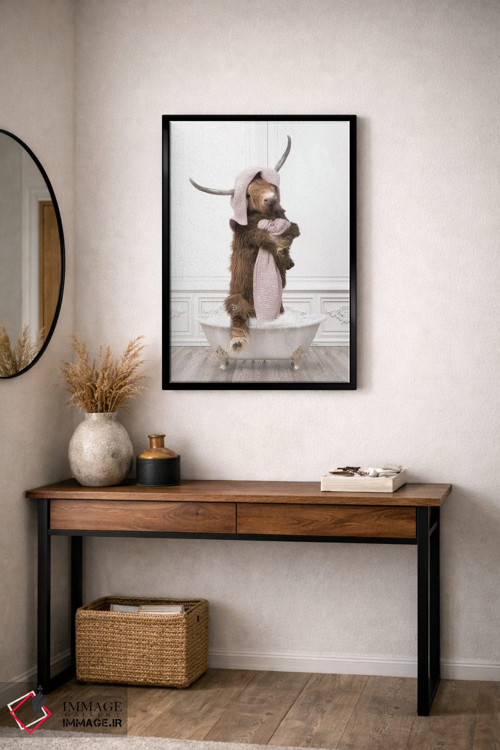 اگر به آثار حیوانات علاقه دارید، «گاو کوهستانی در حمام با حوله حمامی» اثرِ «جوفری فیلیپ» گرما و شخصیت به فضا اضافه میکند، برای اتاق بازی یا گوشهٔ مطالعه گزینهٔ مناسبیست. برای دیوار گالریوار هم گزینهٔ خوبیست.
