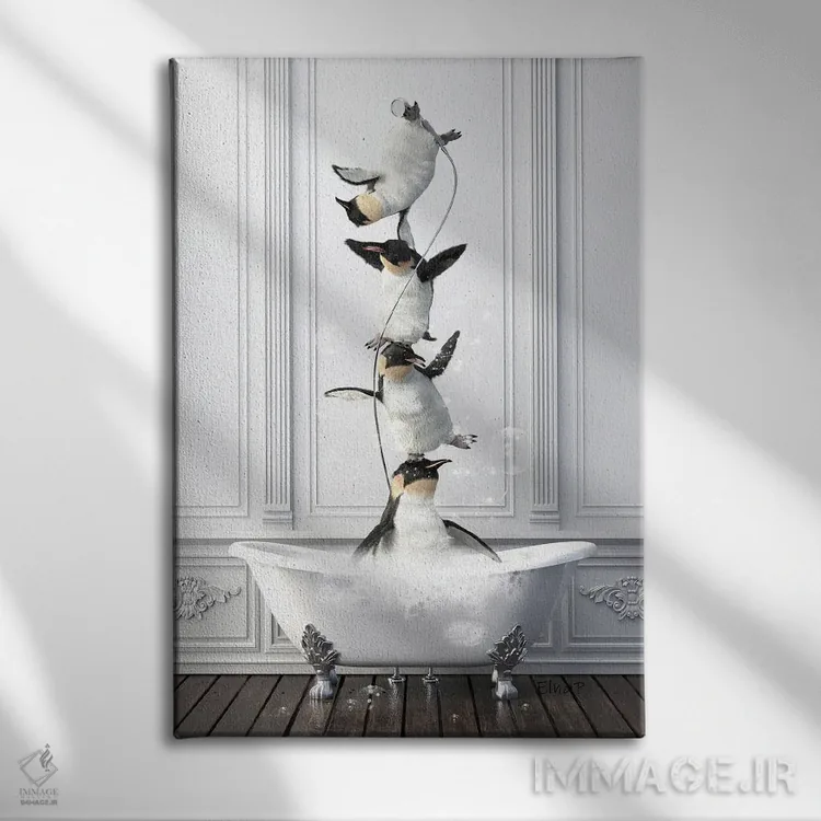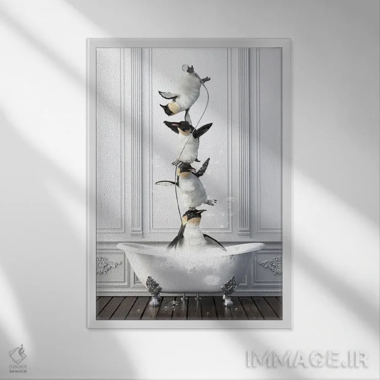 تابلو دکوراتیو خانواده پنگوئن آکروبات در حمام اثر جوفری فیلیپ