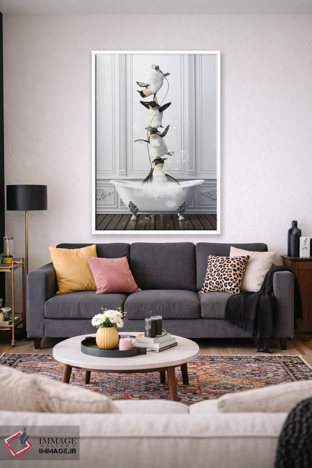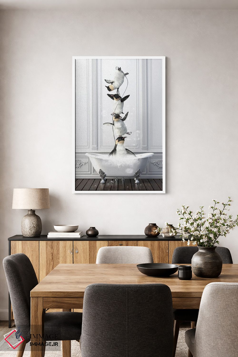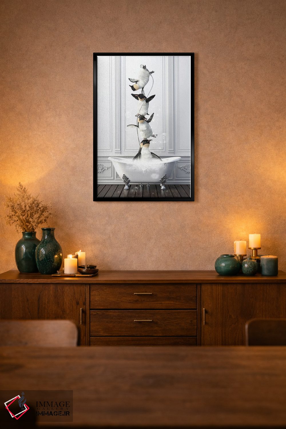 برای دکورهای صمیمی، «خانواده پنگوئن آکروبات در حمام» اثرِ «جوفری فیلیپ» یک لبخند ریز به چیدمان میدهد؛ برای هدیهدادن به دوستداران حیوانات انتخابی خوشسلیقه است. هر بار نگاهش میکنید، یک جزئیات تازه به چشم میآید.