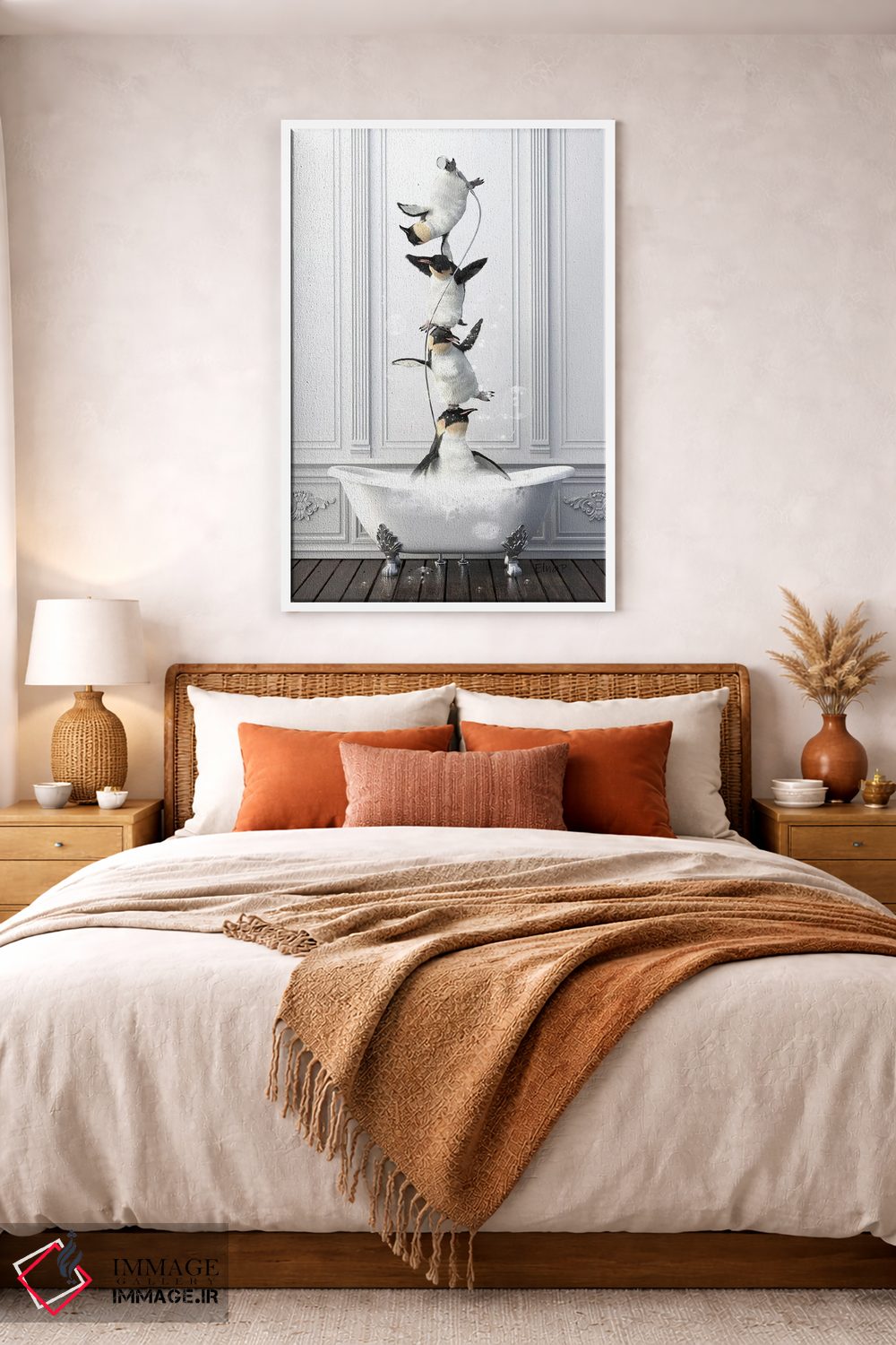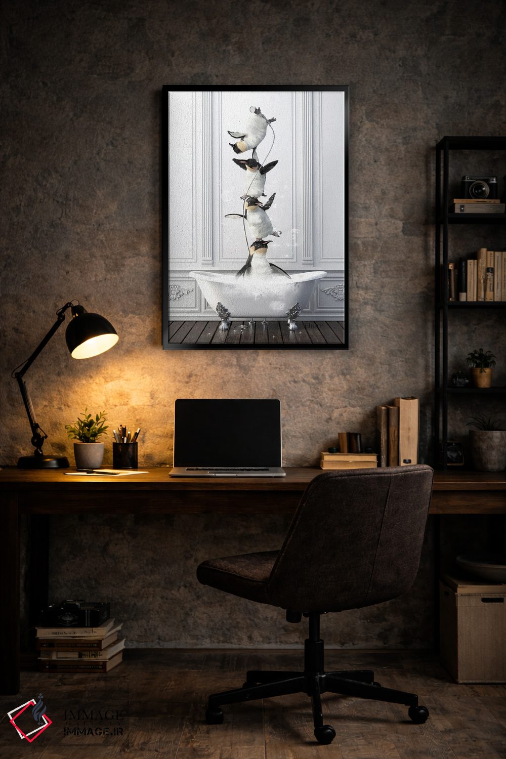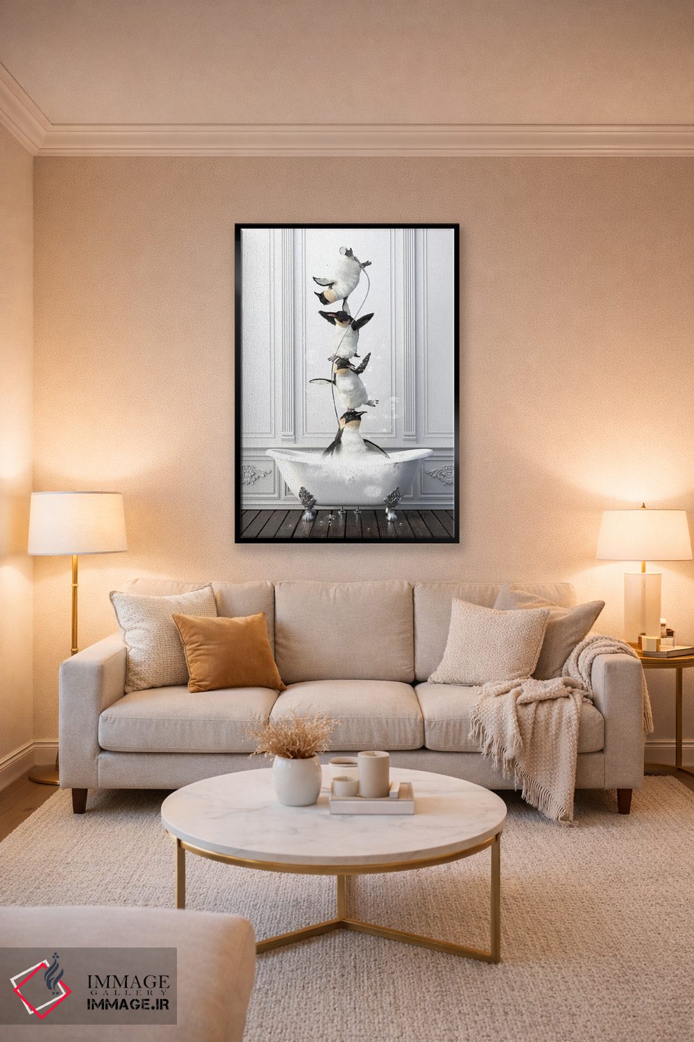 برای دکورهای صمیمی، «خانواده پنگوئن آکروبات در حمام» اثرِ «جوفری فیلیپ» یک لبخند ریز به چیدمان میدهد؛ برای هدیهدادن به دوستداران حیوانات انتخابی خوشسلیقه است. هر بار نگاهش میکنید، یک جزئیات تازه به چشم میآید.