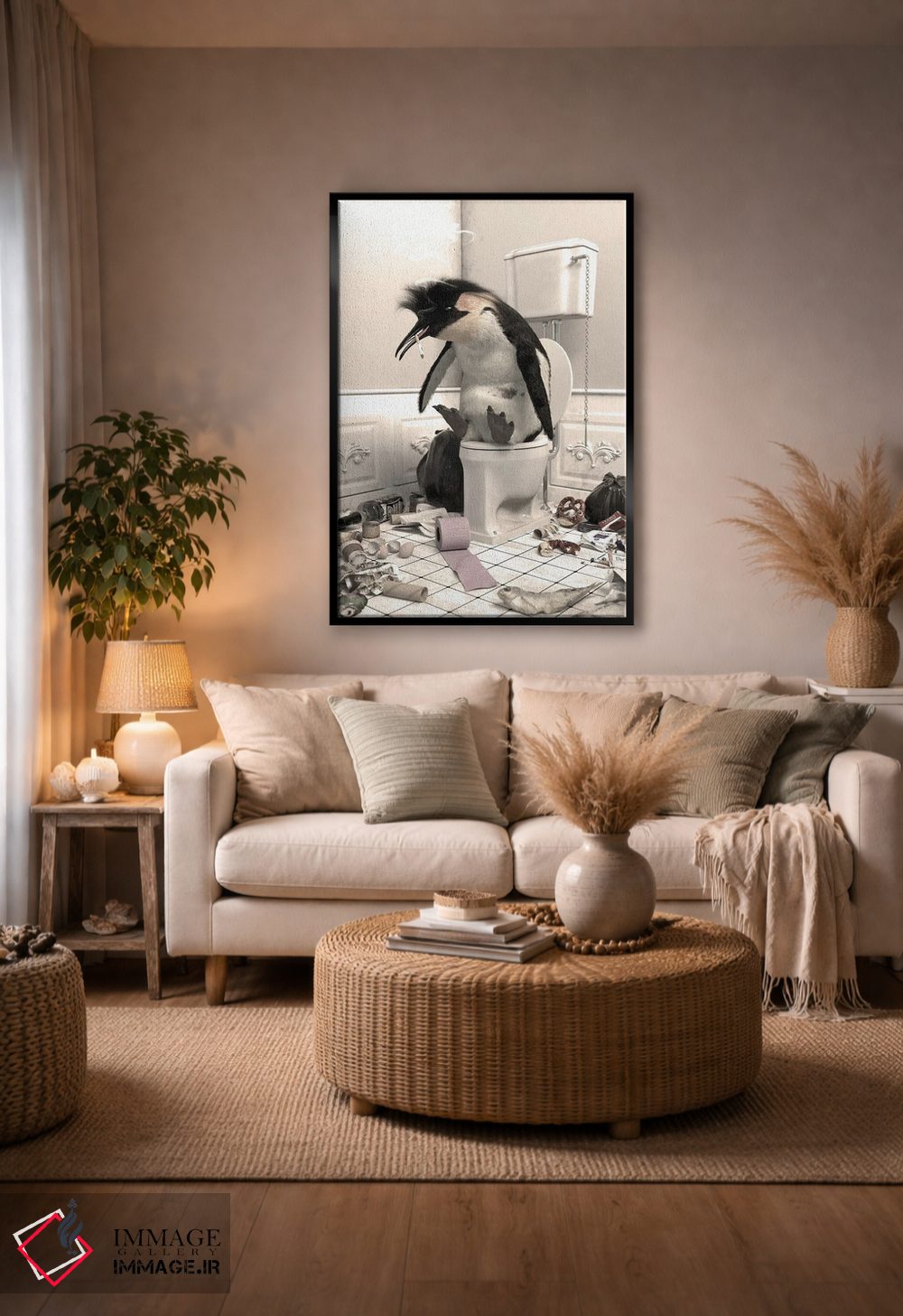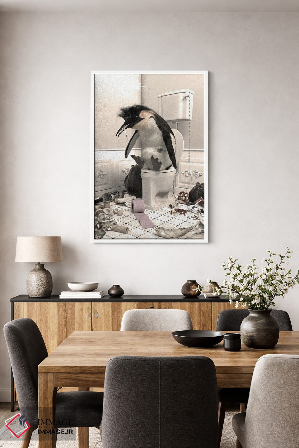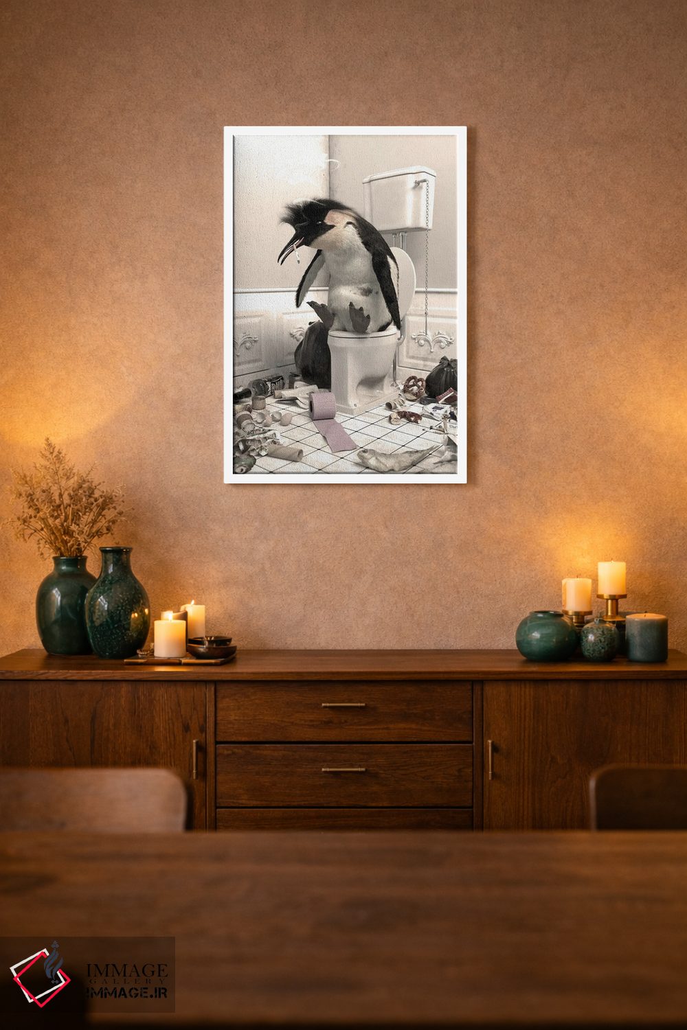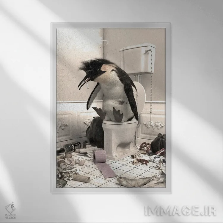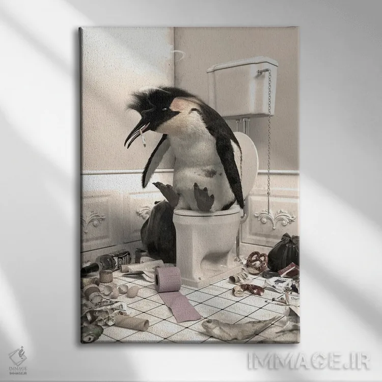 اگر به آثار حیوانات علاقه دارید، «پنگوئن نابود شده در دستشویی» اثرِ «جوفری فیلیپ» به فضا، گرمیِ ملایم اضافه میکند، برای فضاهای روستیک یا بوهو گزینهٔ مناسبیست. هم فضا را گرم میکند، هم شلوغش نمیکند.