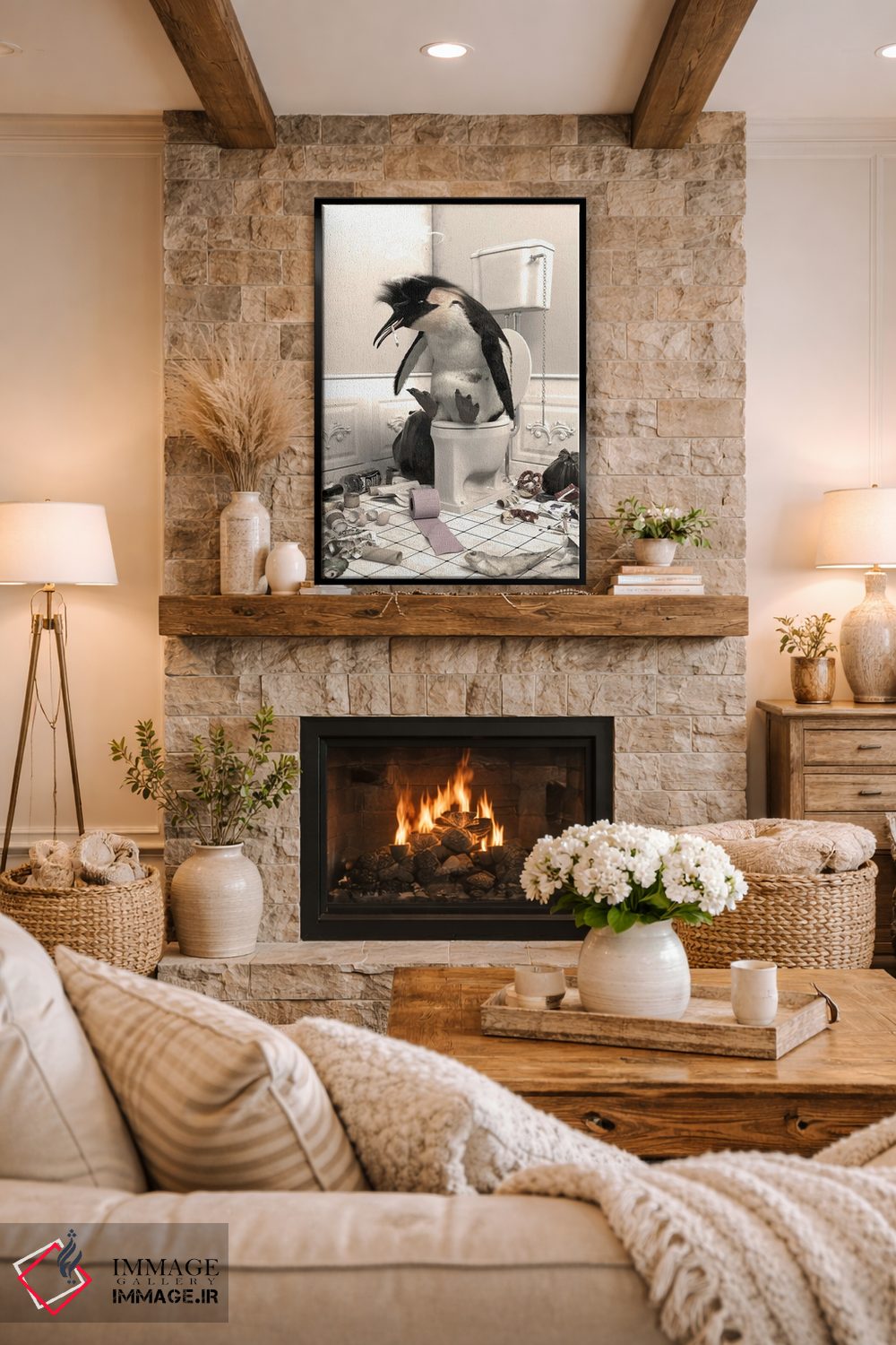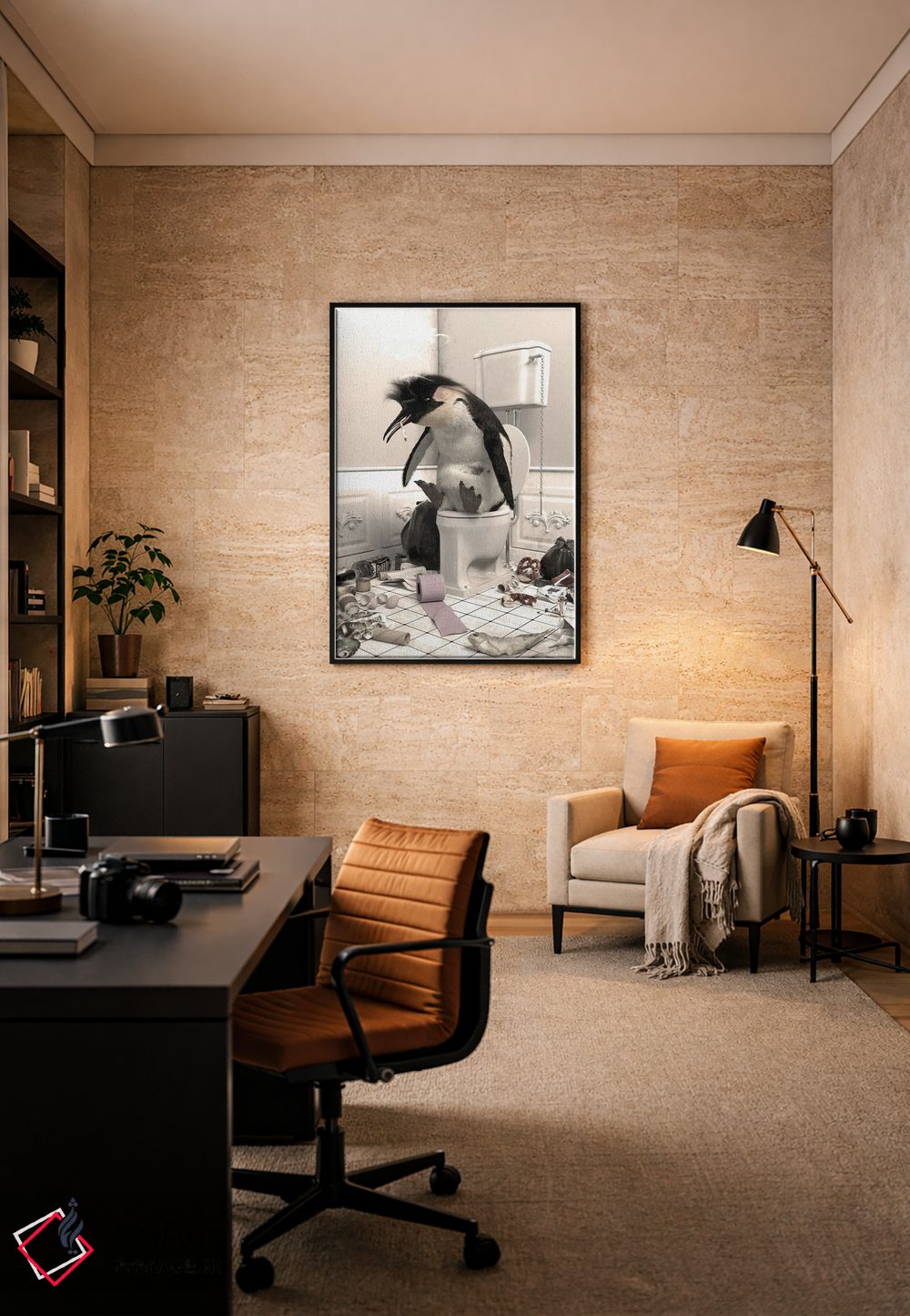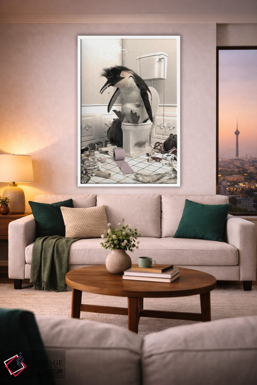 اگر به آثار حیوانات علاقه دارید، «پنگوئن نابود شده در دستشویی» اثرِ «جوفری فیلیپ» به فضا، گرمیِ ملایم اضافه میکند، برای فضاهای روستیک یا بوهو گزینهٔ مناسبیست. هم فضا را گرم میکند، هم شلوغش نمیکند.