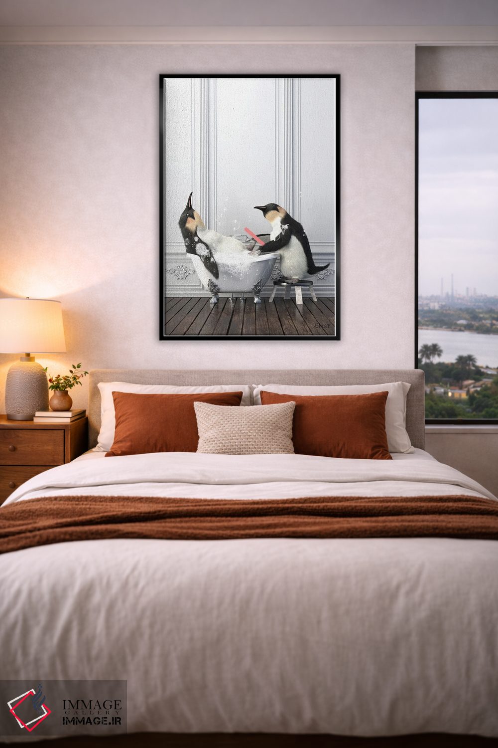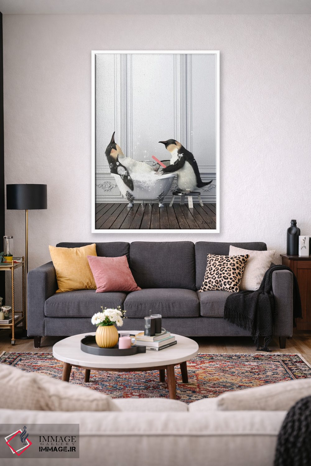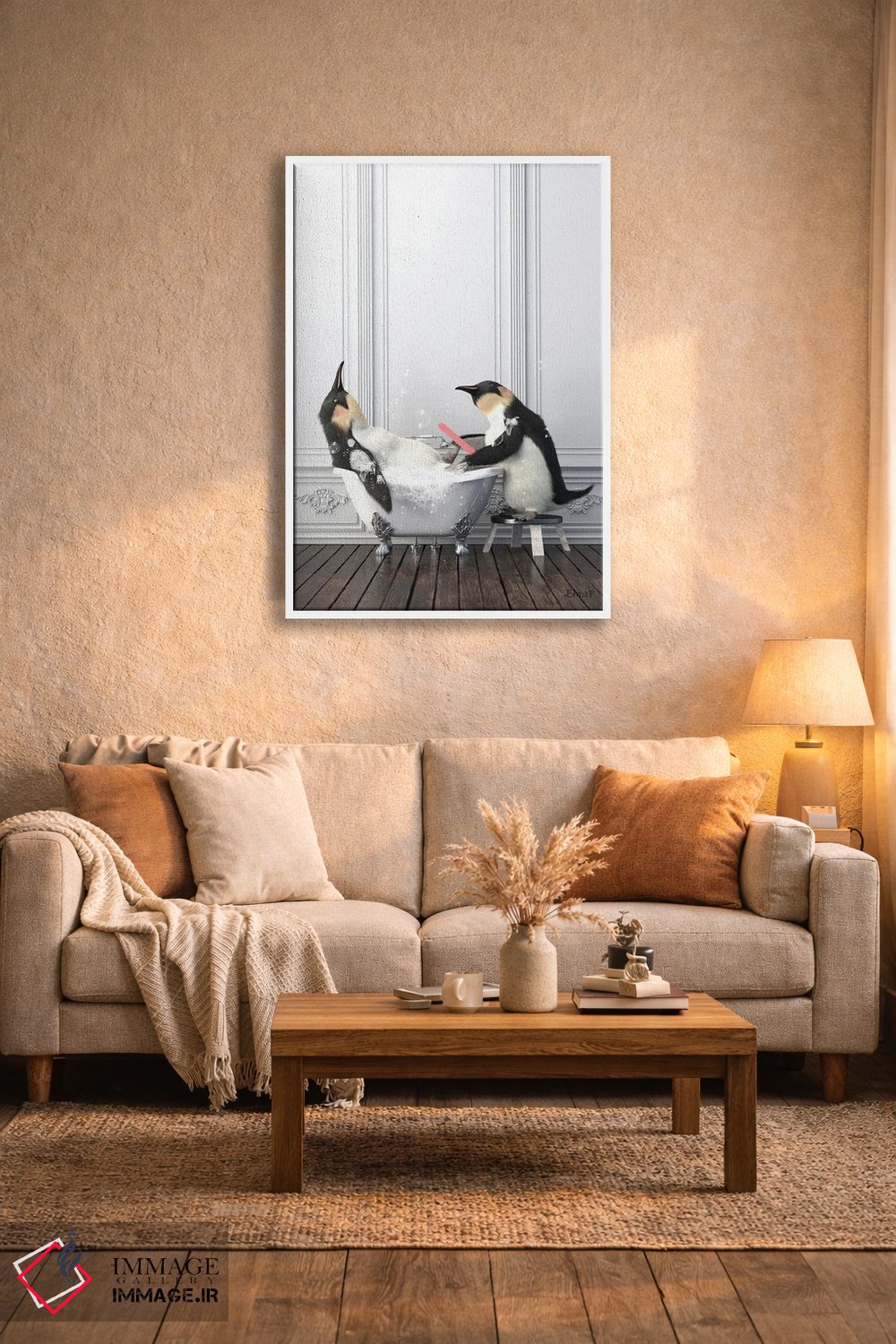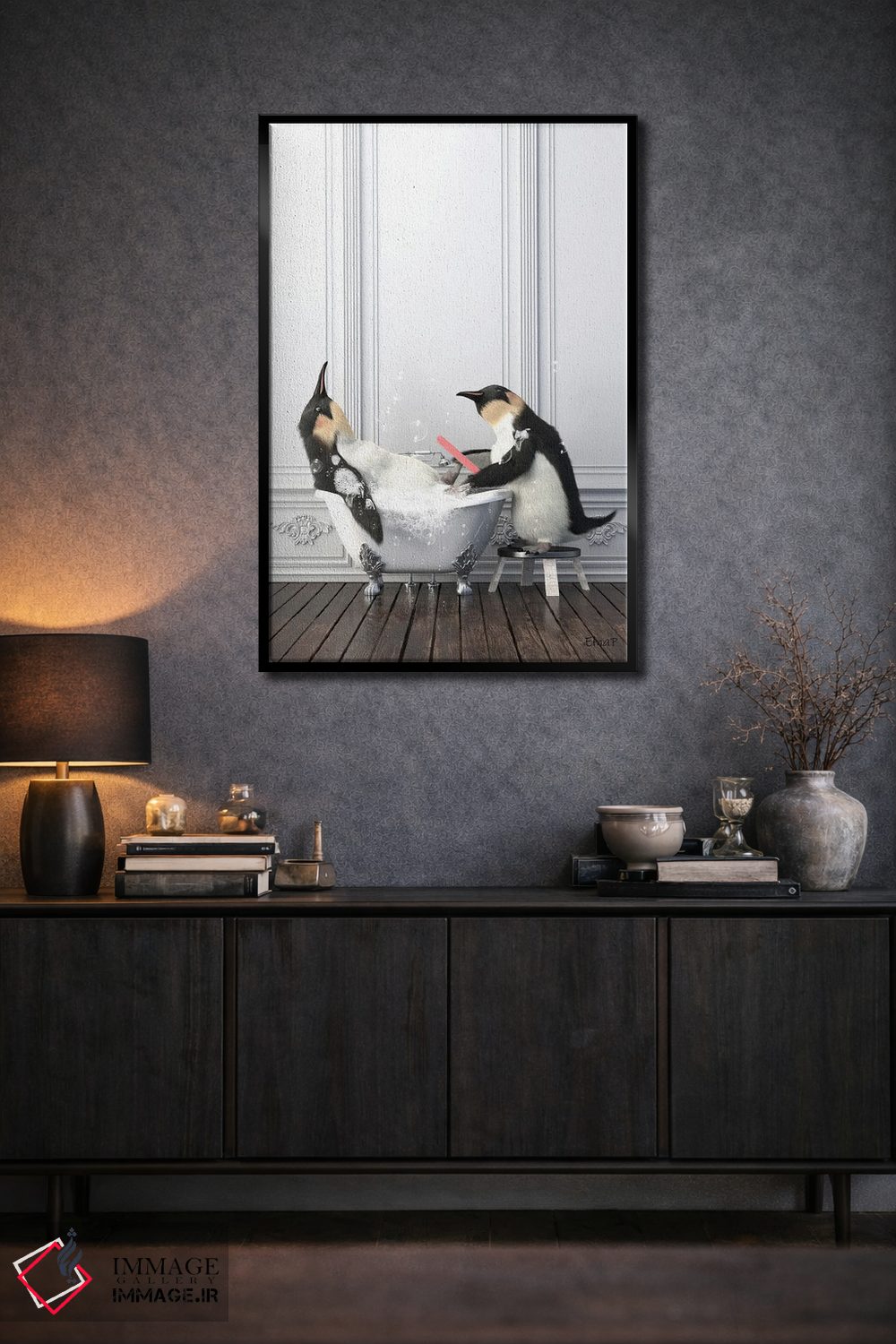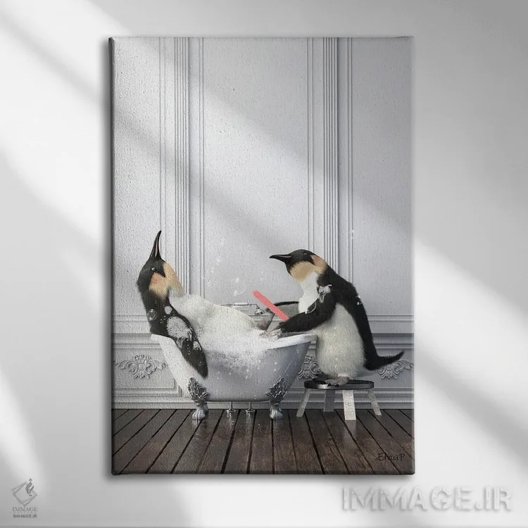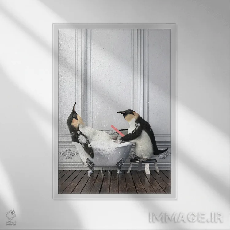 تابلو دکوراتیو پنگوئن در حال مانیکور ناخن در حمام اثر جوفری فیلیپ