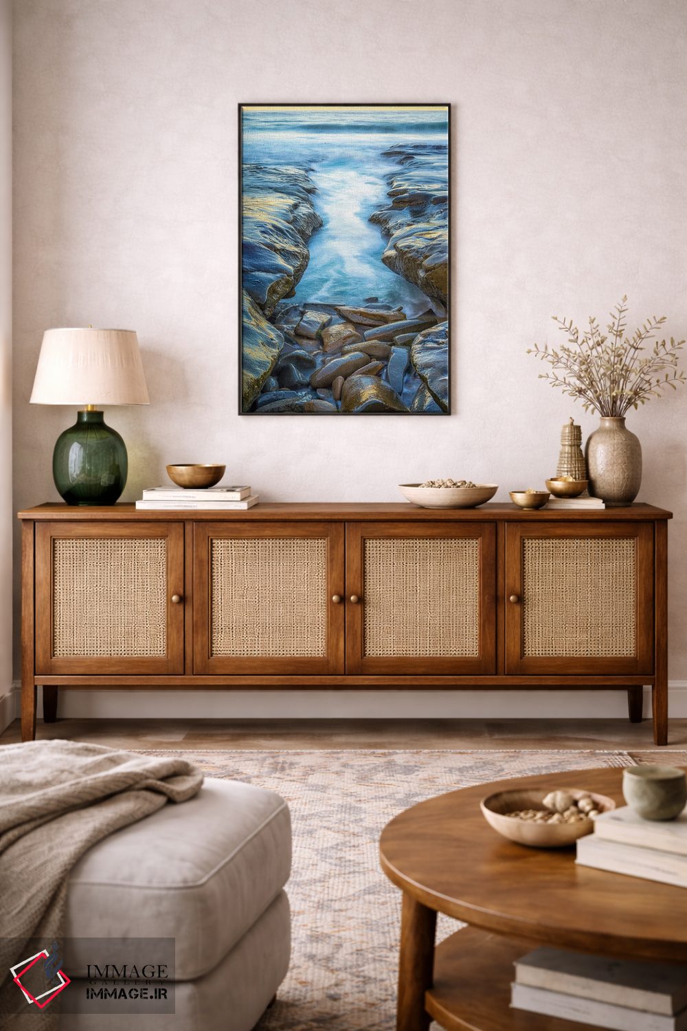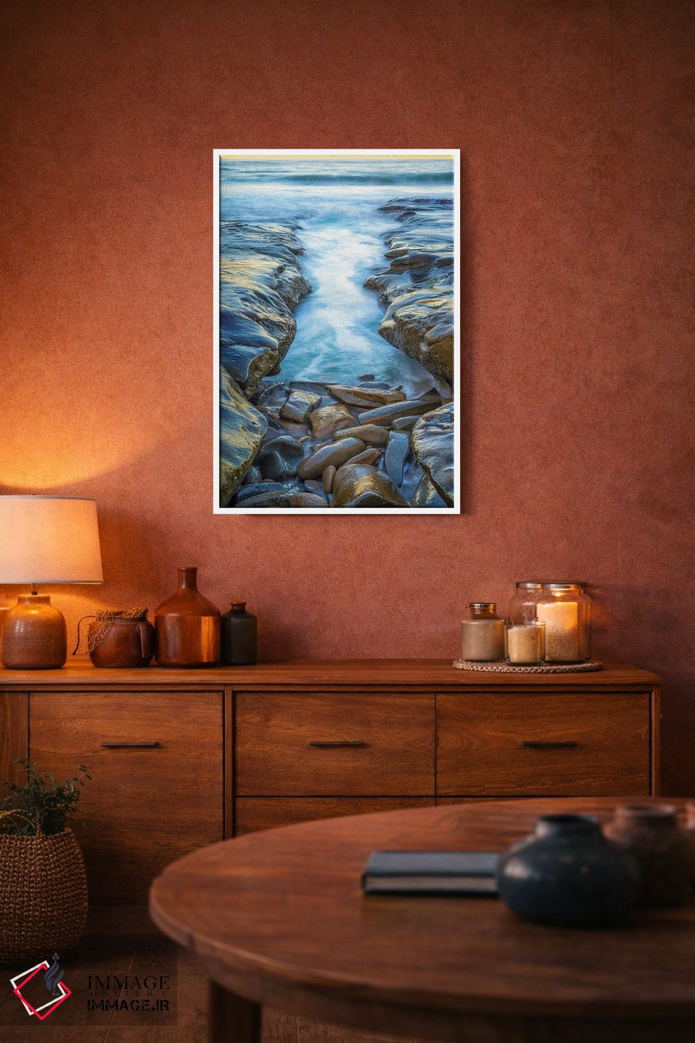 در نگاه اول، «کانال به سوی دریا» اثرِ «جوزف اس. جیاکالونه» جلوهٔ دیوار را منسجمتر میکند؛ برای فضاهایی با نور طبیعی پیشنهاد میشود. روی دیوار، طبیعی و متعادل دیده میشود—بیاغراق و درست.