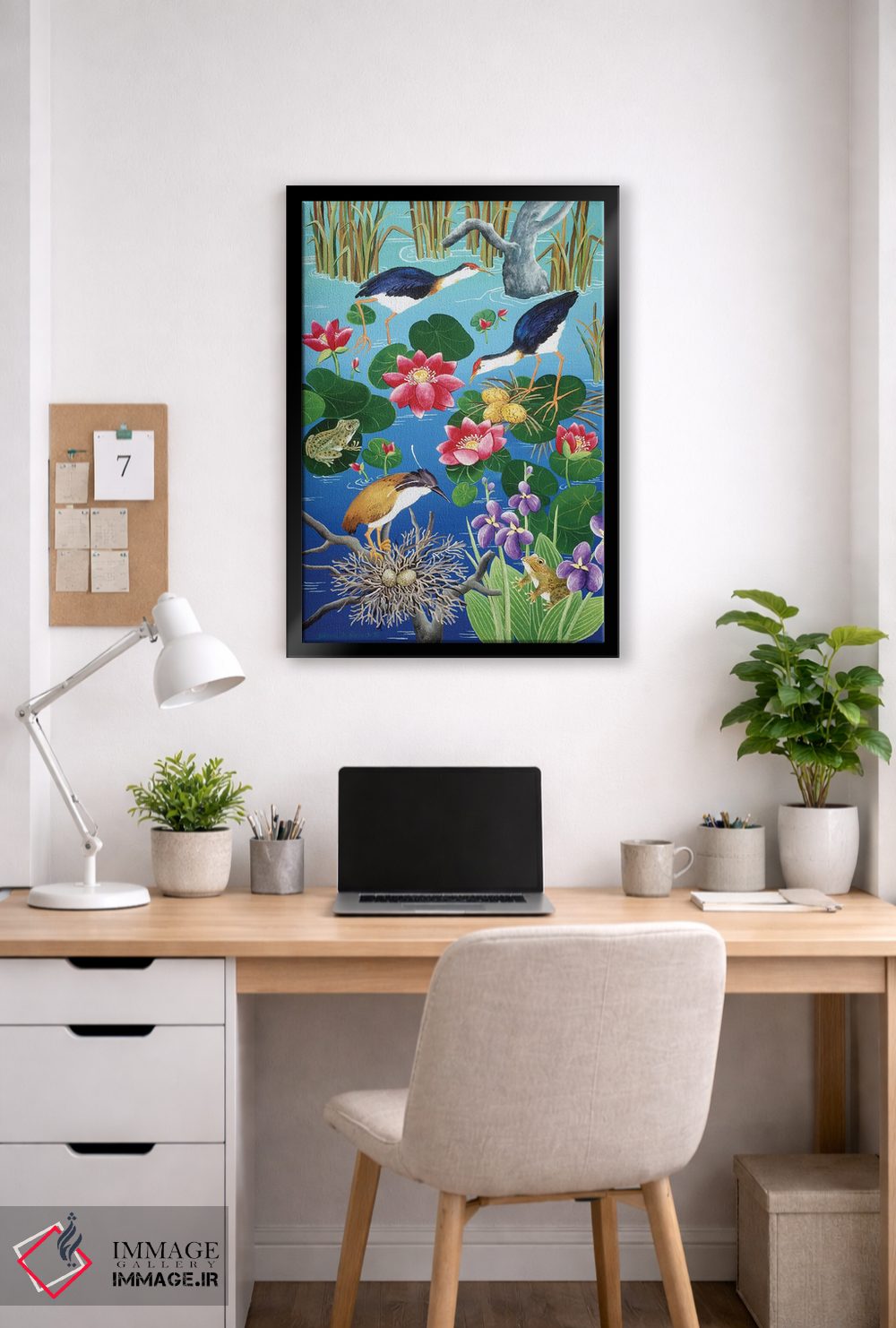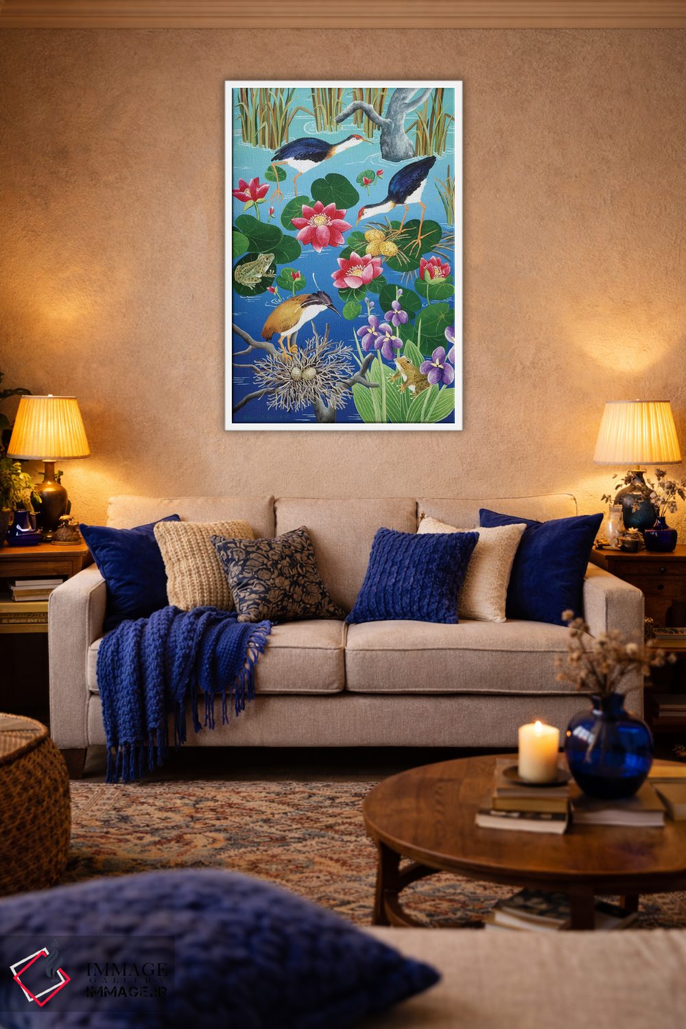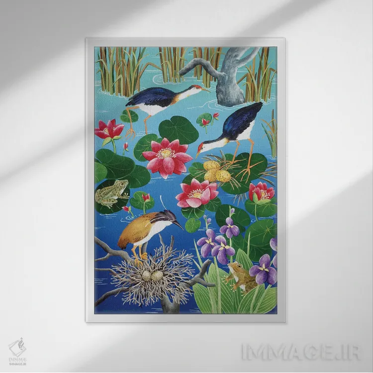 «مرغابیان آبی در حال لانهسازی» اثرِ «یوهانا هیلدبرانت» از آن کارهاییست که به دیوار، انرژیِ نرم و زنده میدهد؛ برای اتاق کودک (بدون لحن کودکانه) انتخاب خوبیست. به دیوار، قصه میدهد—اما قصهای آرام و شیک.