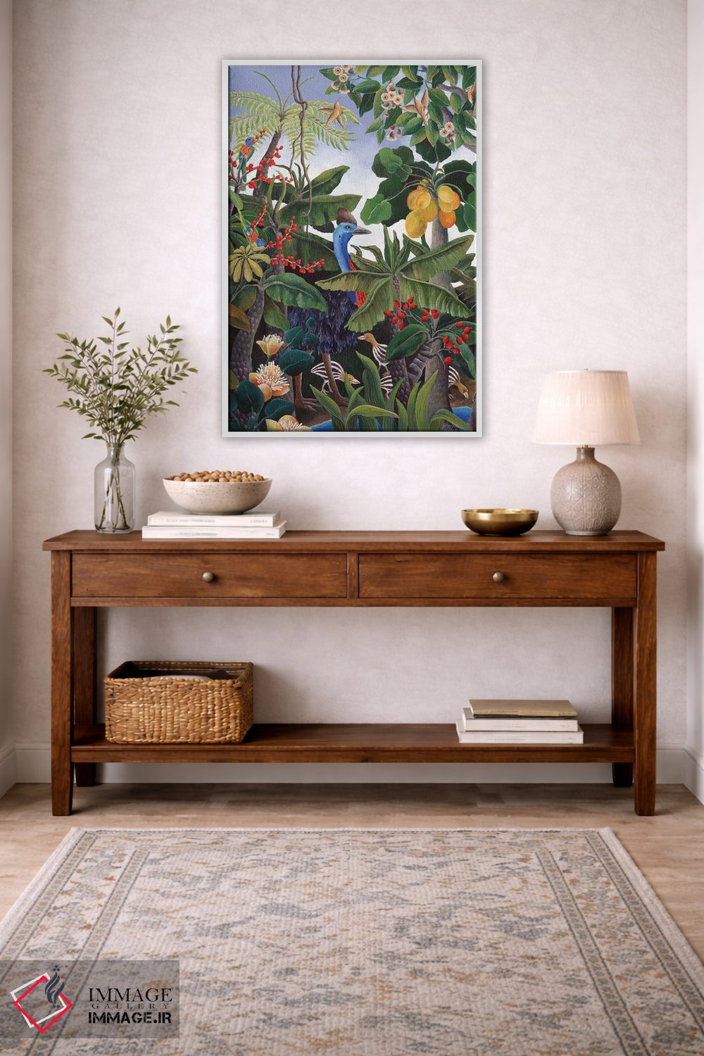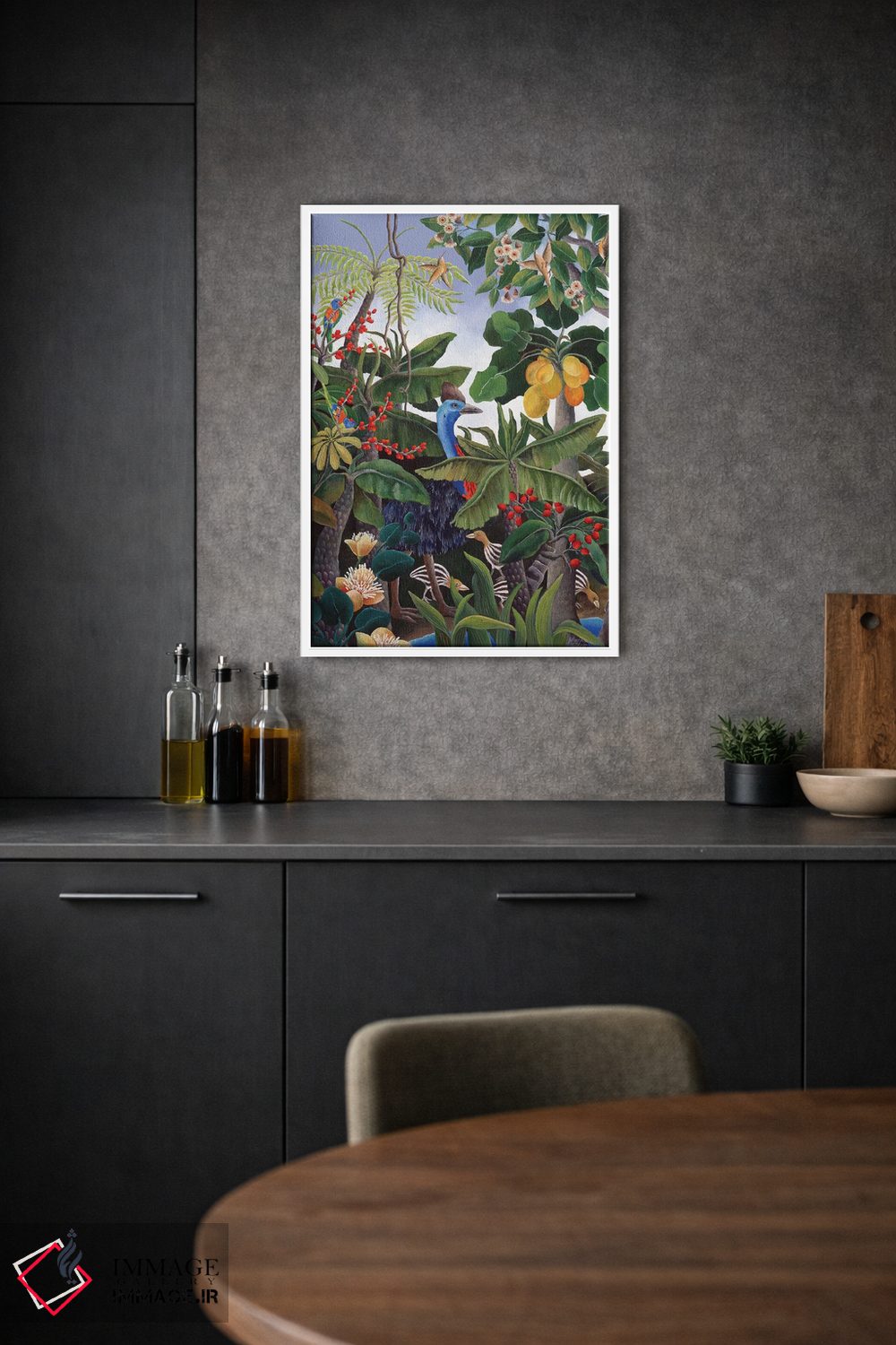 «کاسوآری و جوجههایش» اثرِ «یوهانا هیلدبرانت» در کنار مبلمان تیره یا روشن، خوب مینشیند؛ چون تاکیدش روی فرم و کیفیت بصری است.