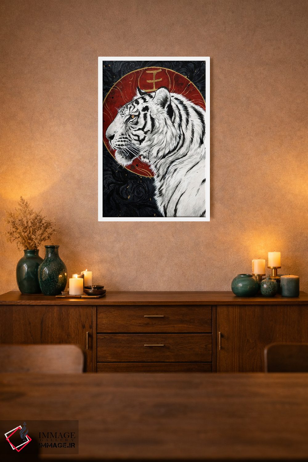 این اثر با عنوان «بیاکو (ببر سفید افسانهای ژاپن)» اثرِ «جونّا هیتینن» در کنار رنگهای خنثی، تضاد دلچسبی میسازد؛ برای خانههایی با چوب و پارچههای گرم انتخابی خوشسلیقه است. به دیوار، قصه میدهد—اما قصهای آرام و شیک.