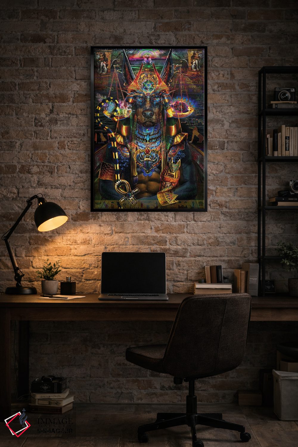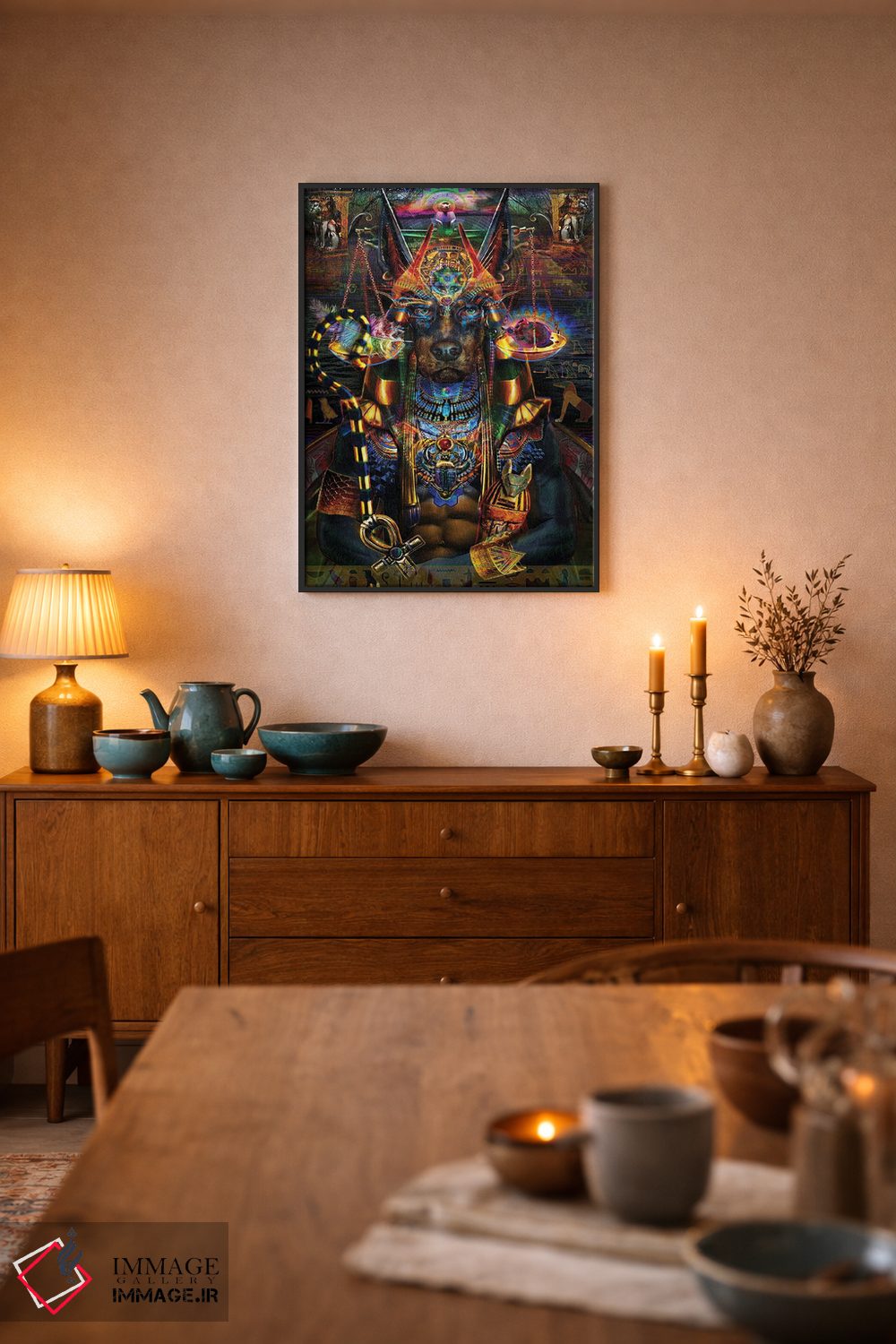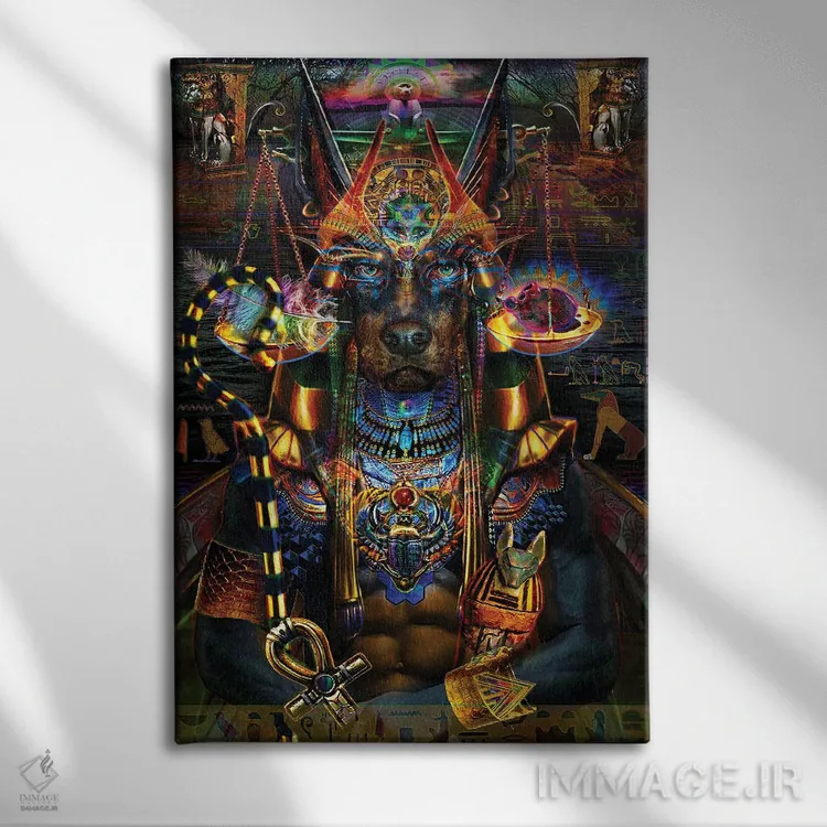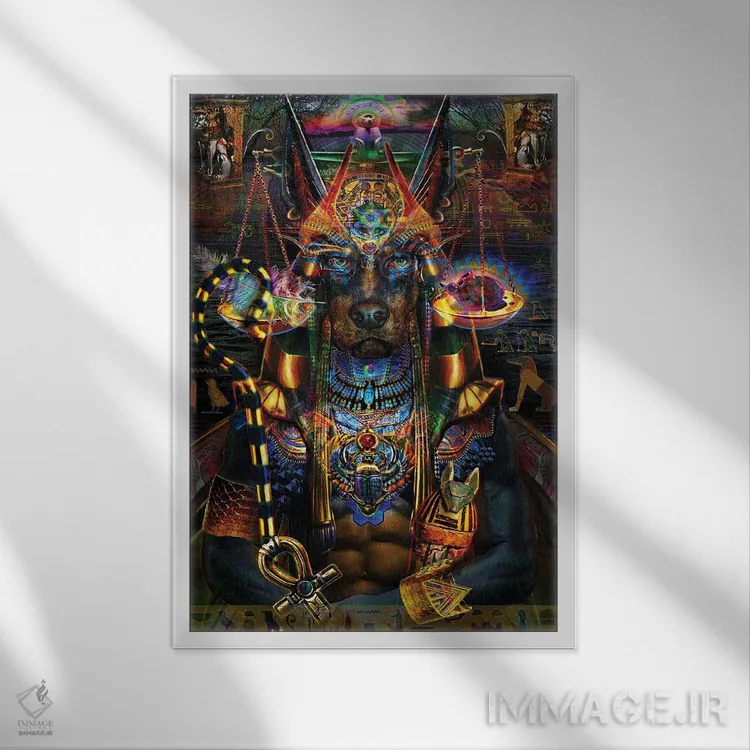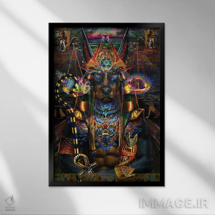 «آنوبیس (خدای مرگ مصر باستان)» اثرِ «جامبی (نام هنری/لقب)» با حالوهوای دکوراسیون جایگزین و موضوعِ این اثر، برای فضاهای خلاقانه و متفاوت انتخابی جسورانه اما مرتب است.