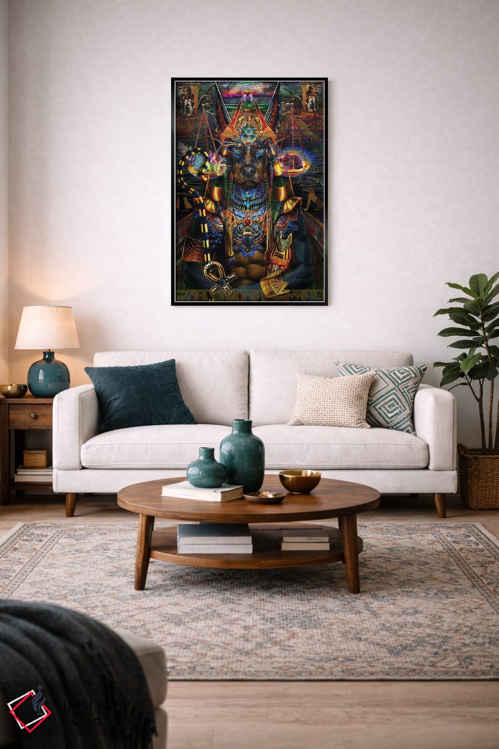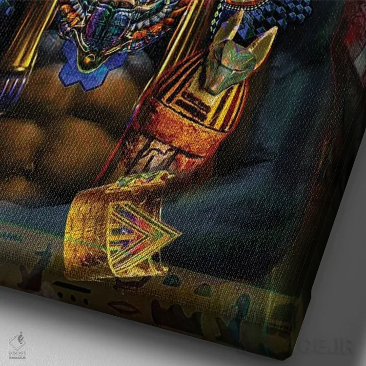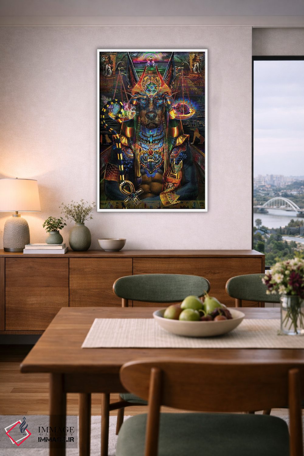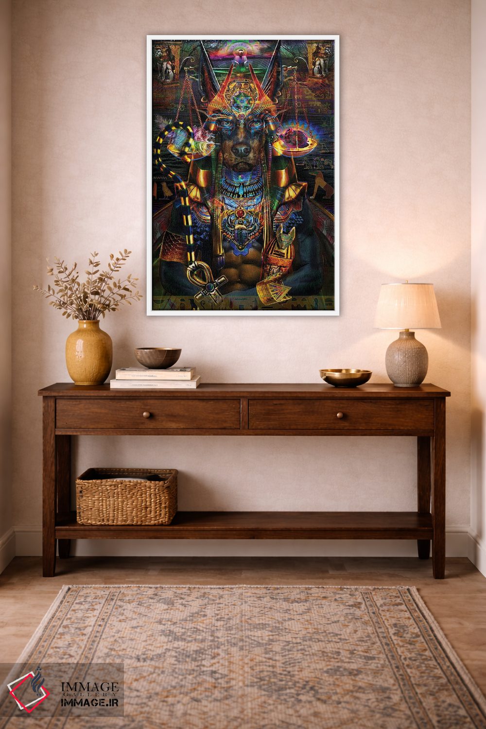 «آنوبیس (خدای مرگ مصر باستان)» اثرِ «جامبی (نام هنری/لقب)» با حالوهوای دکوراسیون جایگزین و موضوعِ این اثر، برای فضاهای خلاقانه و متفاوت انتخابی جسورانه اما مرتب است.