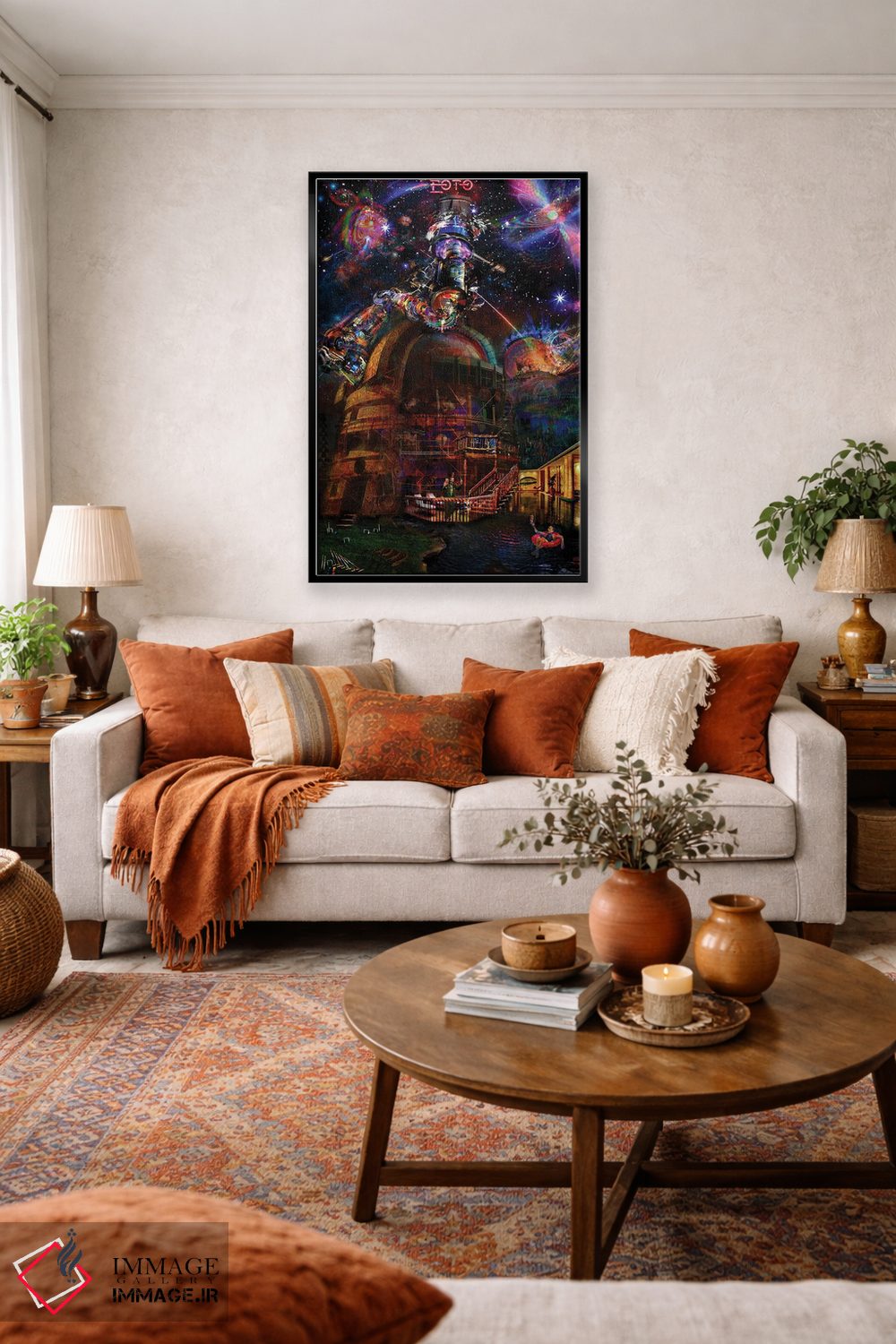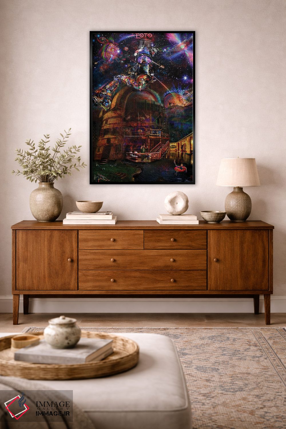 براساس پالت ترکیبی اثر، قاب تیک گرم (چوبی) پیشنهاد اول است و مشکی مات (فریم متوسط) مکمل. برای سفارشهای پروژهای با ابعاد و قابهای اختصاصی با ایماژ در تماس باشید.
