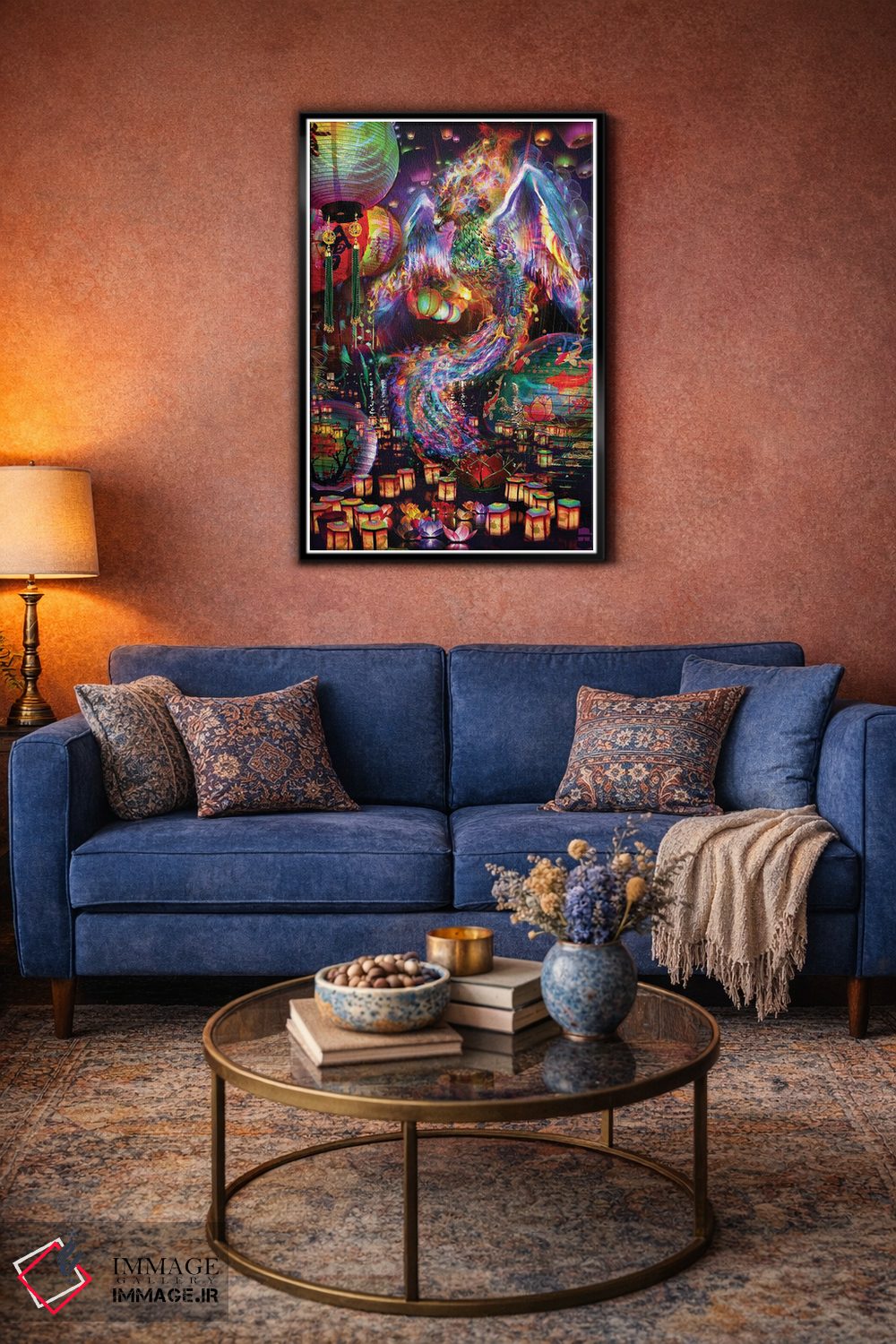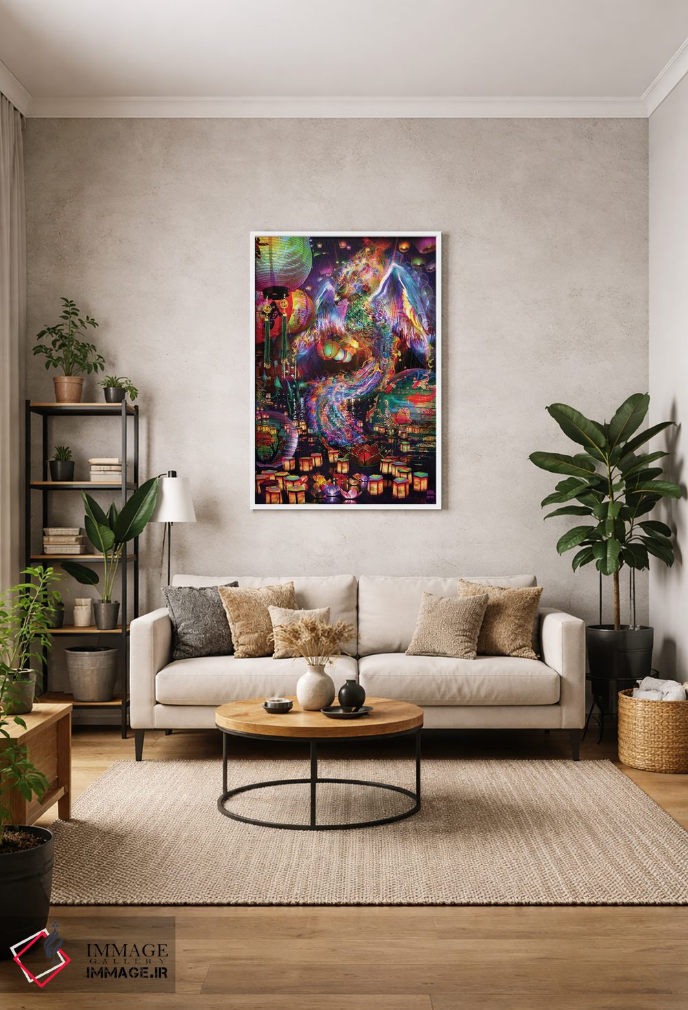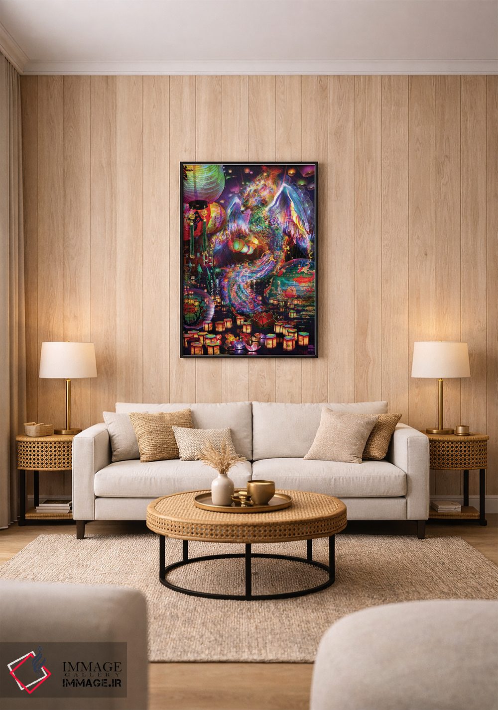 براساس پالت ترکیبی اثر، قاب تیک گرم (چوبی) پیشنهاد اول است و مشکی مات (فریم متوسط) مکمل. برای سفارشهای پروژهای با ابعاد و قابهای اختصاصی با ایماژ در تماس باشید.