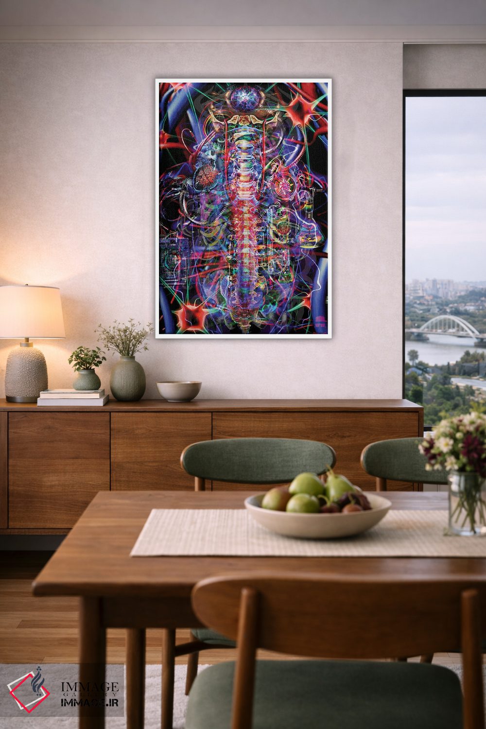 براساس پالت ترکیبی اثر، قاب تیک گرم (چوبی) پیشنهاد اول است و مشکی مات (فریم متوسط) مکمل. برای سفارشهای پروژهای با ابعاد و قابهای اختصاصی با ایماژ در تماس باشید.