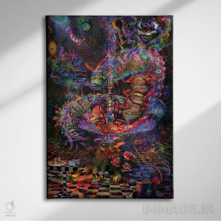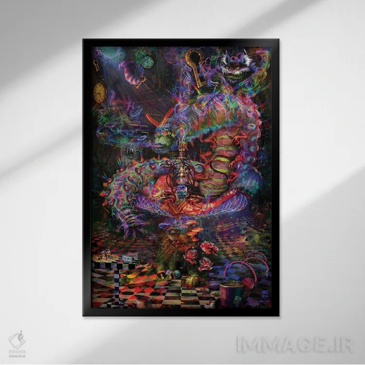 اگر میخواهید دیوار کمی سرزندگیِ محترمانه داشته باشد، «کرم ابریشم سرزمین عجایب (اشاره به داستان آلیس)» اثرِ «جامبی (نام هنری/لقب)» حس طبیعت را بیدغدغه وارد خانه میکند، برای دیوار کنار میز کار گزینهٔ مناسبیست. به دیوار، قصه میدهد—اما قصهای آرام و شیک.