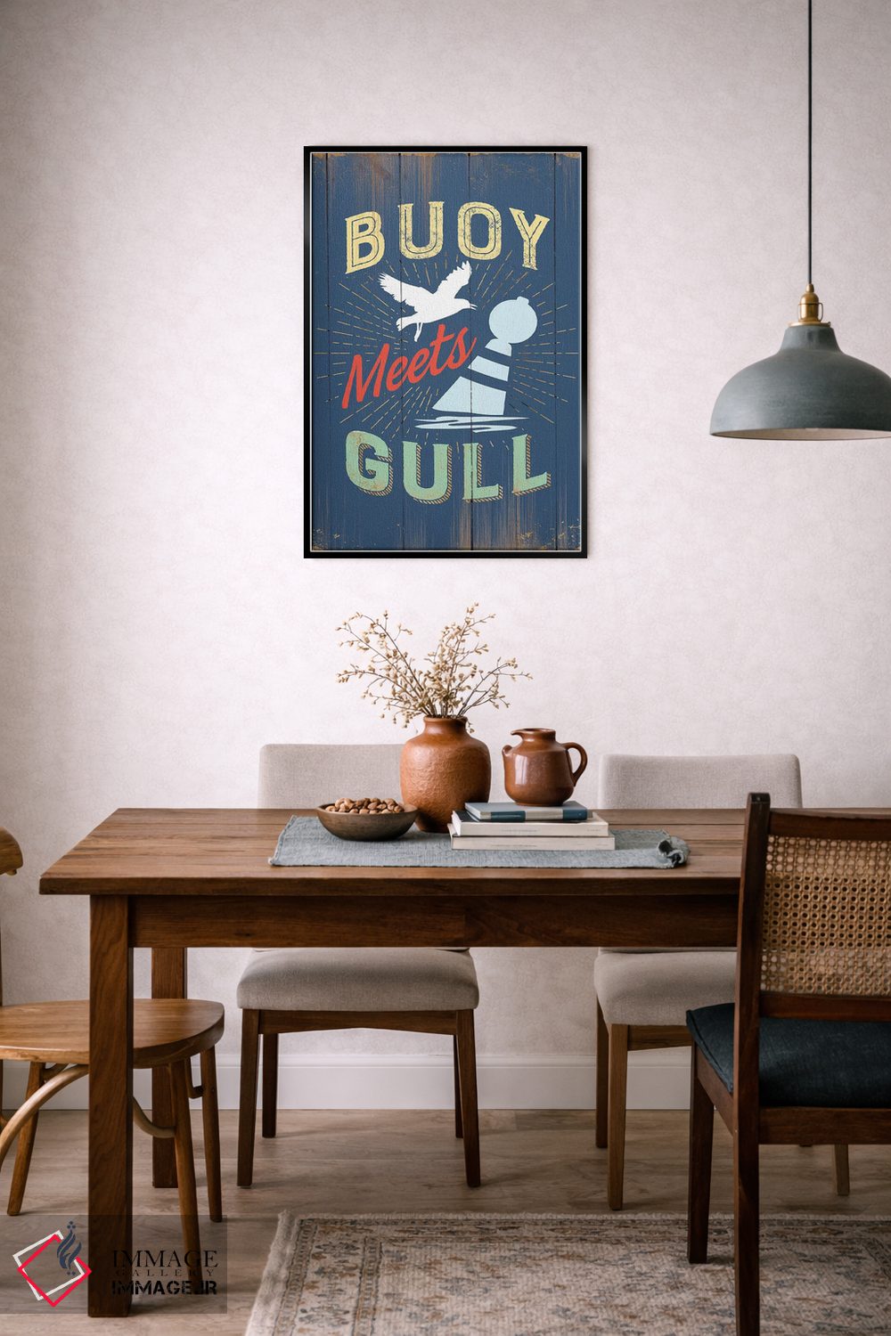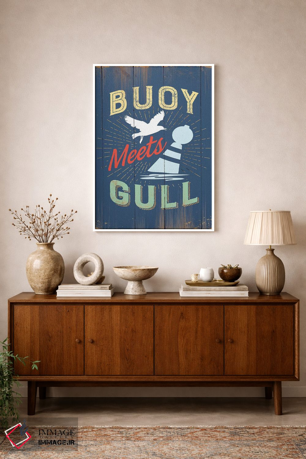 برای دکورهای صمیمی، «شناور و مرغ دریایی در آبی» اثرِ «جیجی براندو» یک لبخند ریز به چیدمان میدهد؛ برای نشیمنهای خانوادگی انتخابی خوشسلیقه است. هم فضا را گرم میکند، هم شلوغش نمیکند.