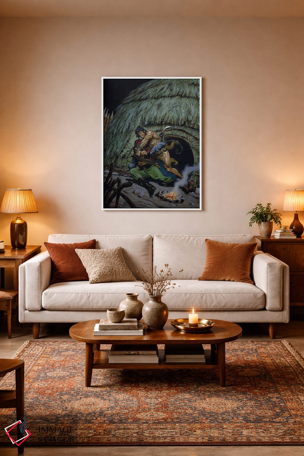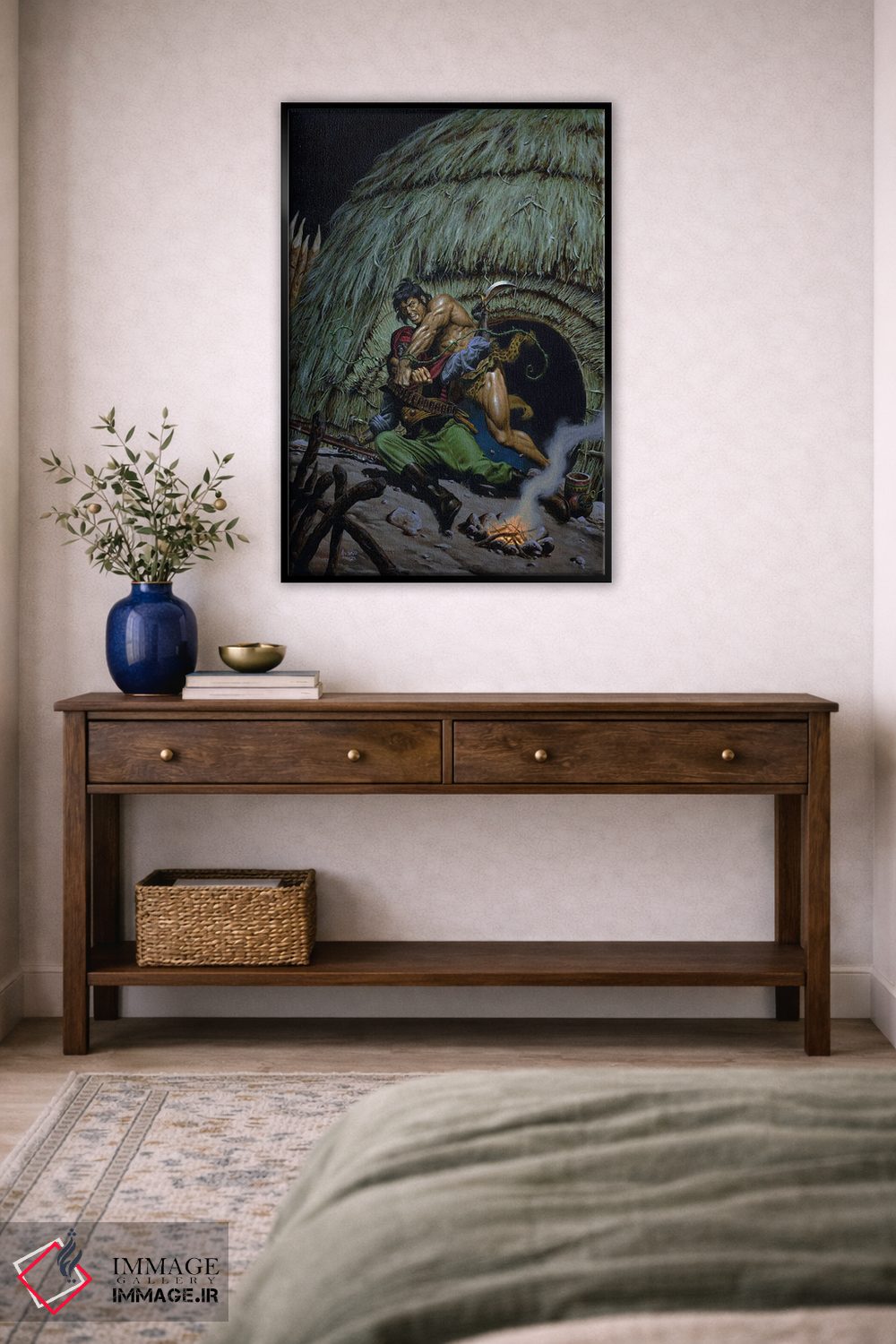 براساس پالت ترکیبی اثر، قاب تیک گرم (چوبی) پیشنهاد اول است و مشکی مات (فریم متوسط) مکمل. برای سفارشهای پروژهای با ابعاد و قابهای اختصاصی با ایماژ در تماس باشید.