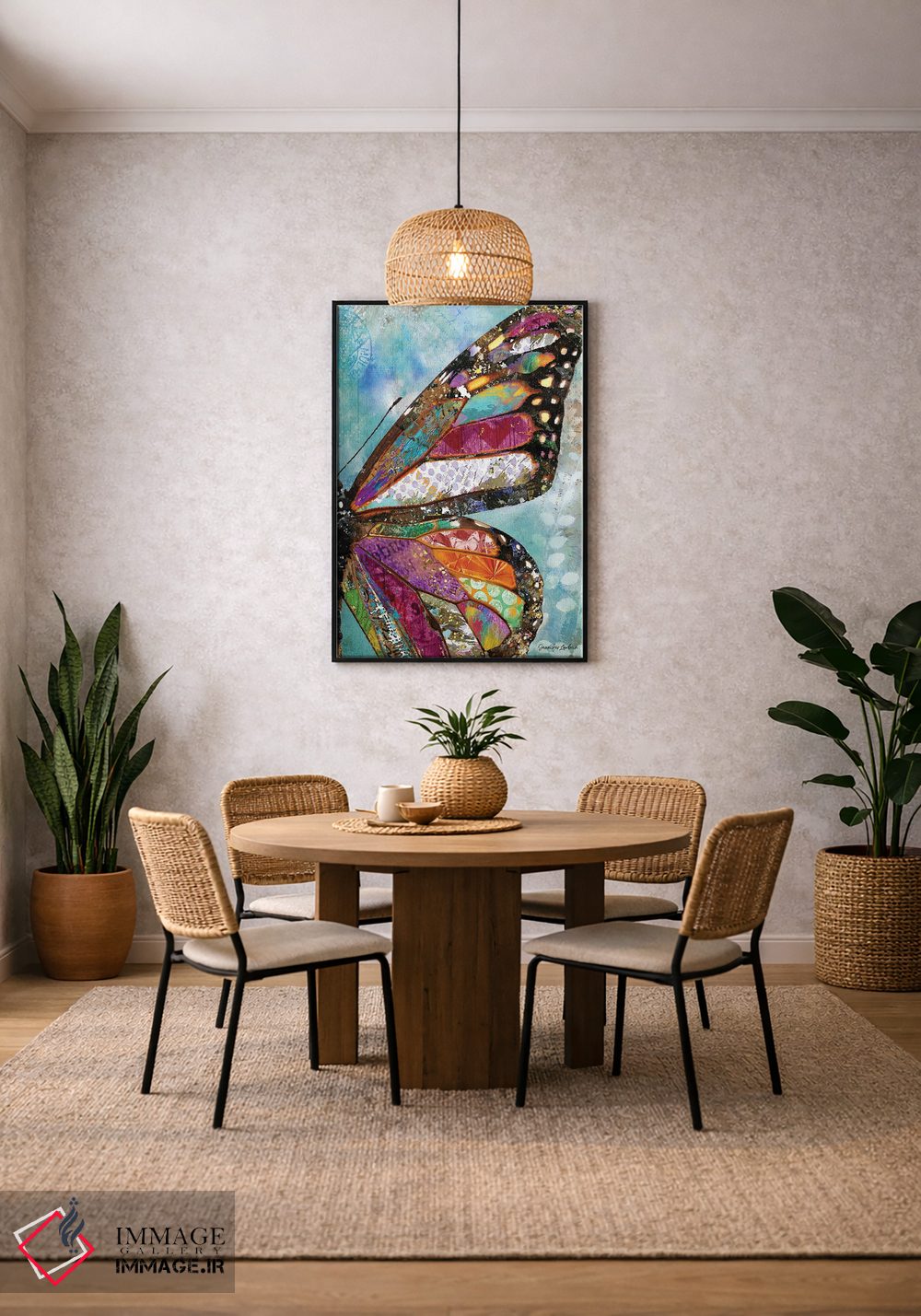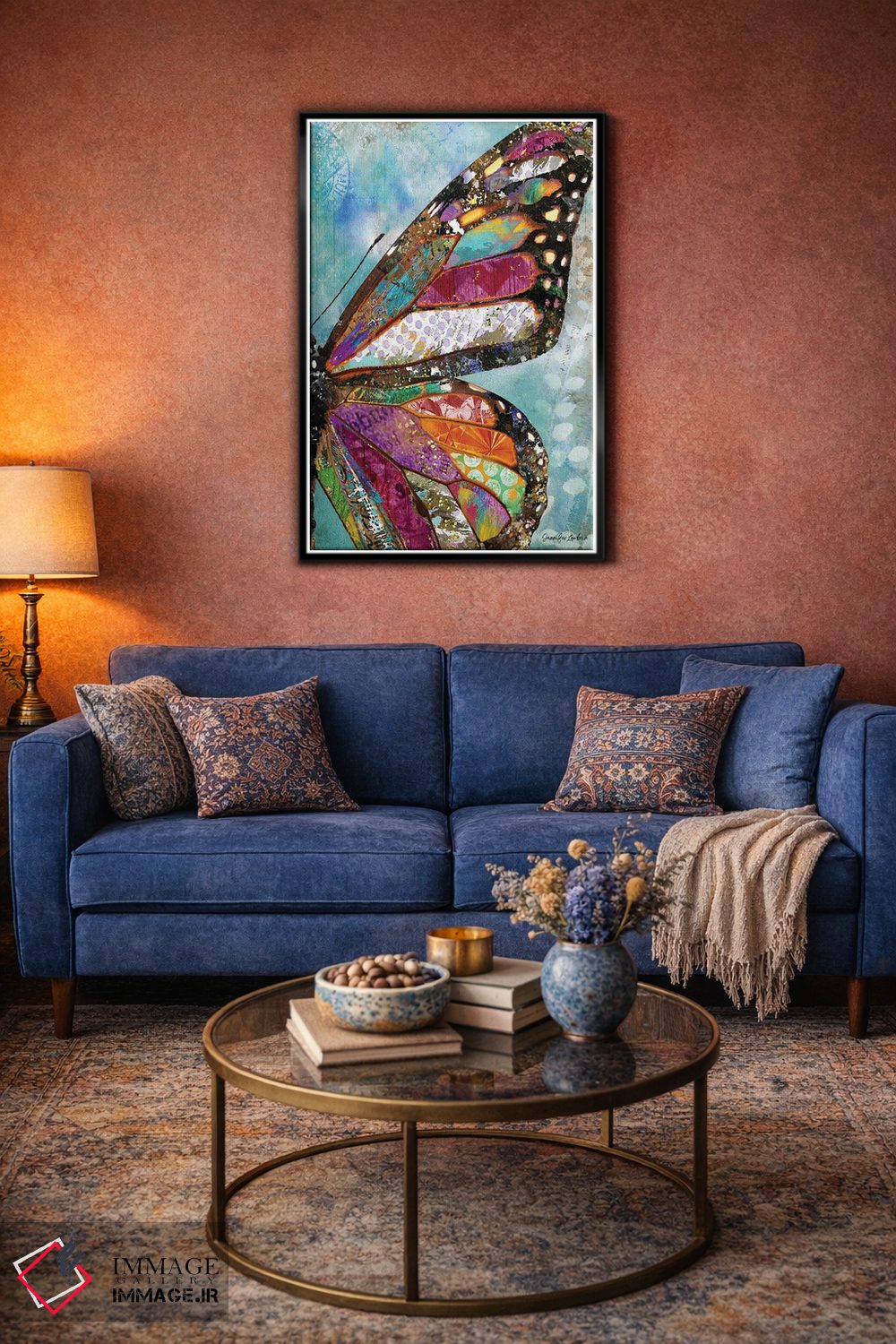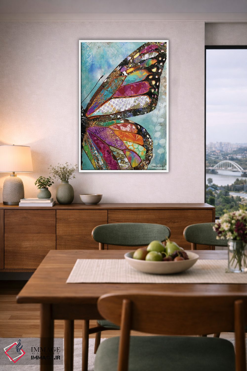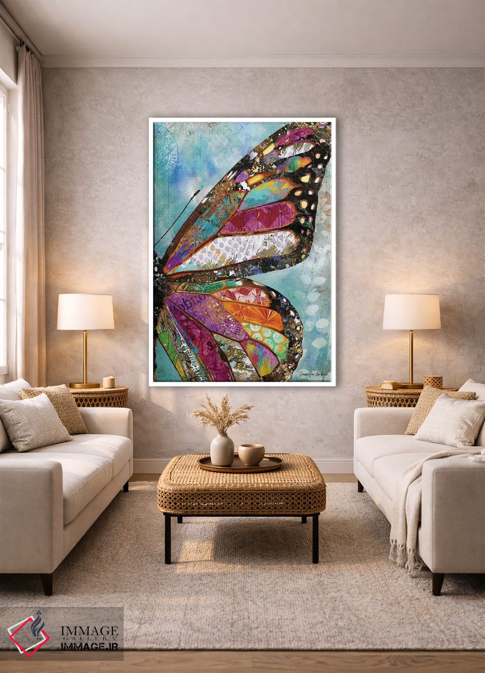 تابلو دکوراتیو پروانه جنگلی اثر جنیفر لمباین - نمای روبه‌رو روی دیوار