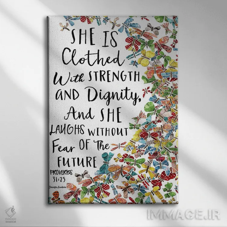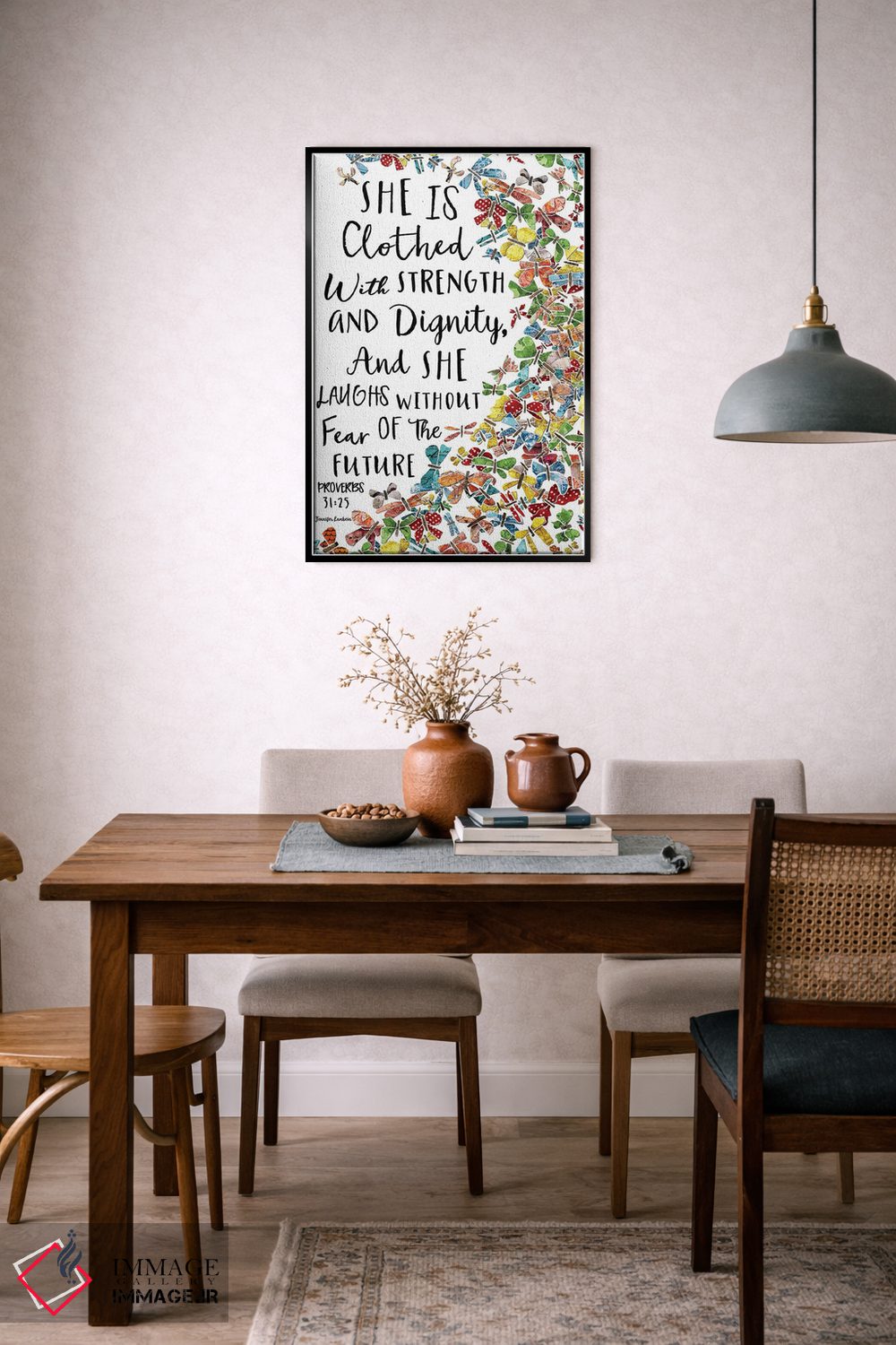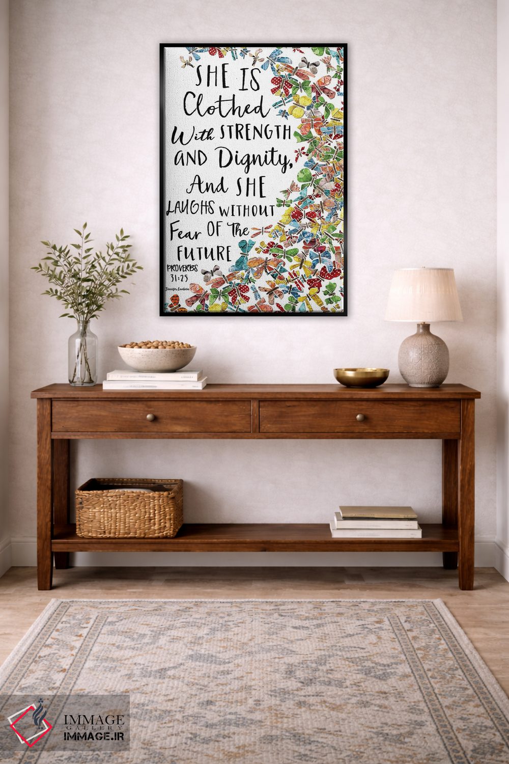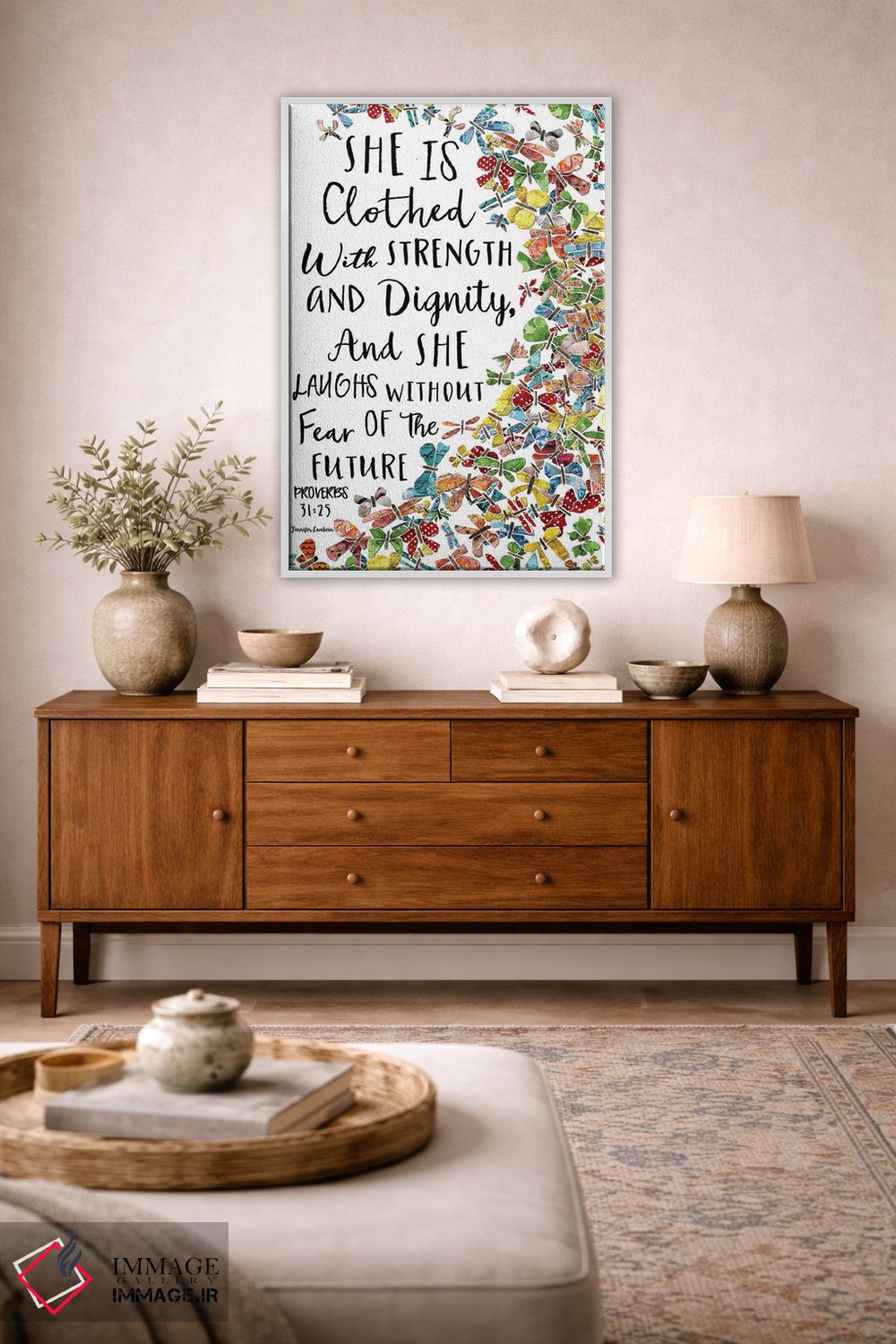 در این اثر، «او با پروانهها پوشانده شده است» اثرِ «جنیفر لمباین» یک حس «تمامشده و پرداختشده» ایجاد میکند؛ برای دیوار بالای کنسول یا شومینه پیشنهاد میشود. اگر میخواهید مهمانها مکث کنند، این اثر دلیل خوبیست.