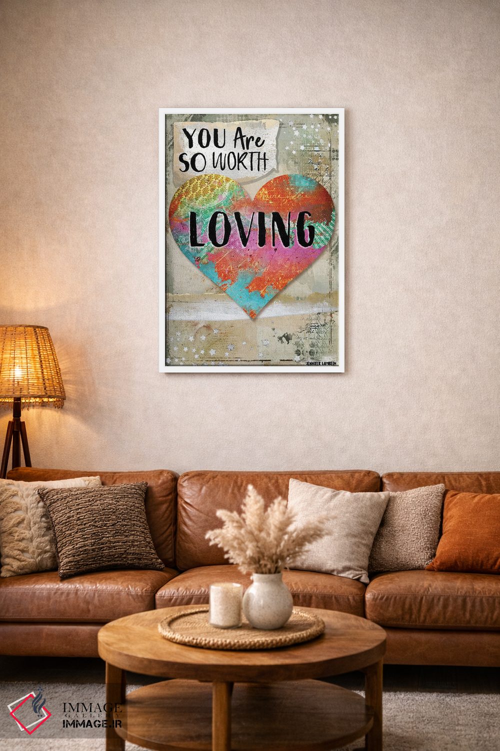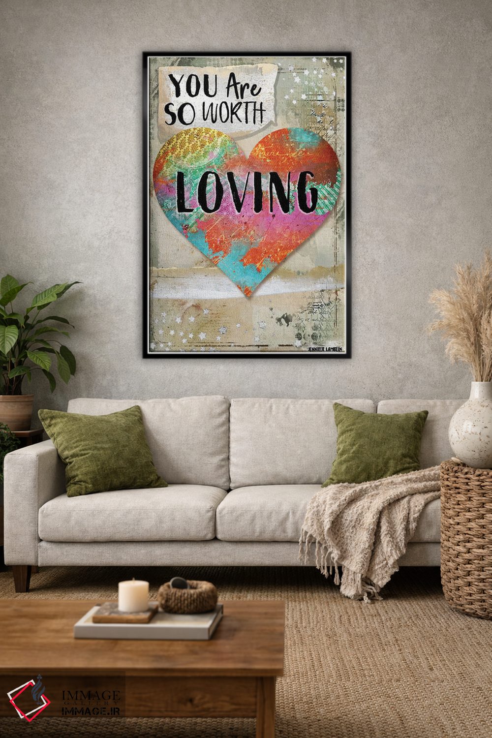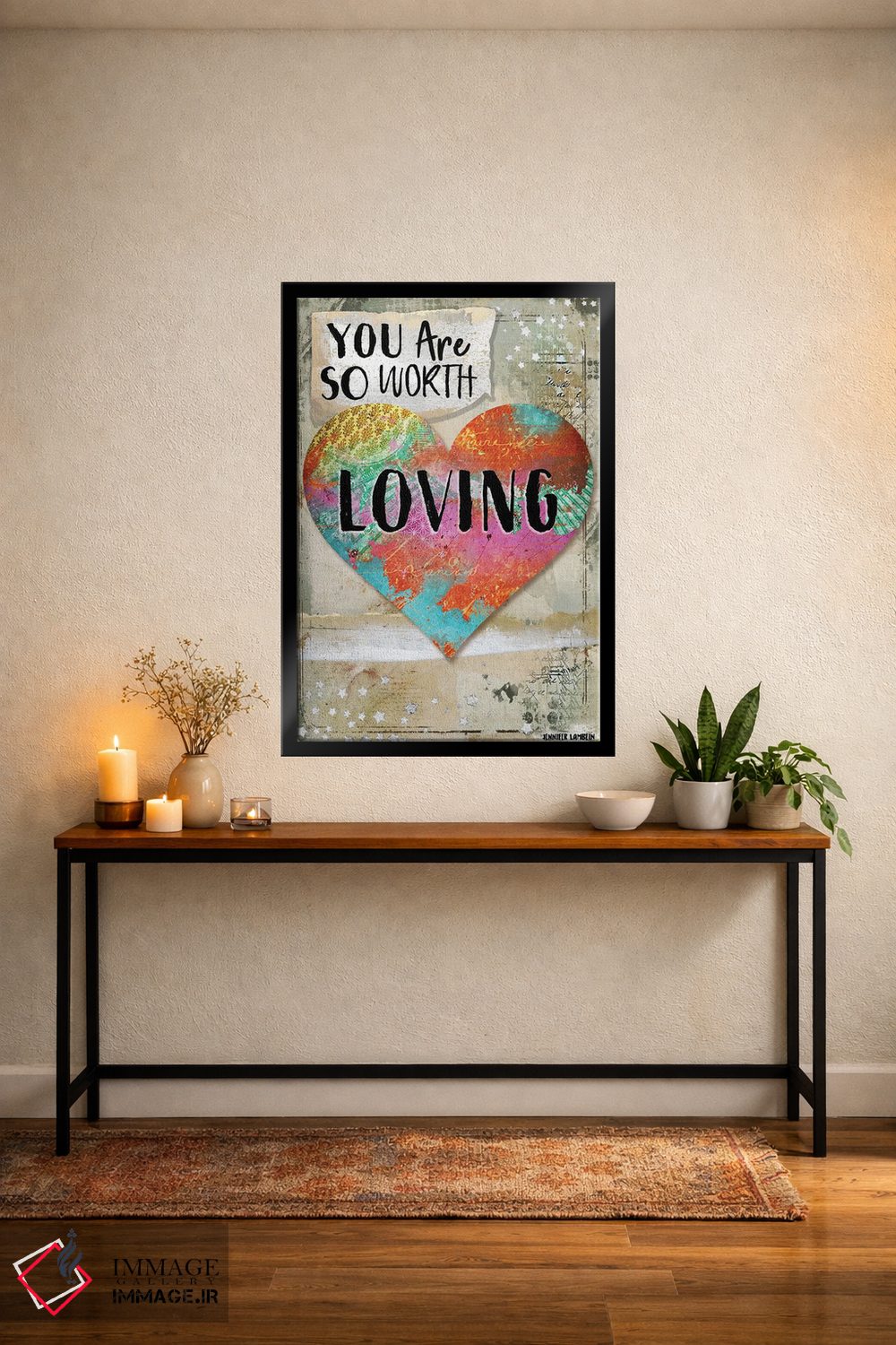 «تو ارزش دوست داشته شدن را داری» اثرِ «جنیفر لمباین» انتخابیست برای زمانی که تضادهای رنگی را خوشقوارهتر میکند؛ برای دیوارهای گالریوار و ترکیب چند اثر انتخابی عالی است. در کنار گیاهان آپارتمانی هم جلوهٔ لطیفی پیدا میکند.