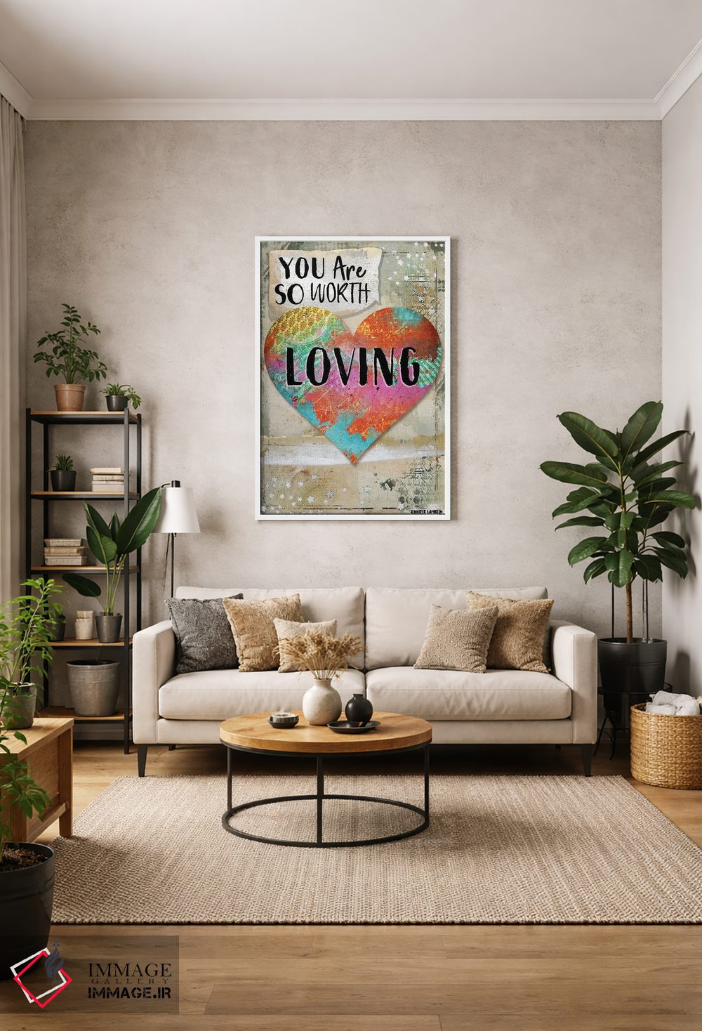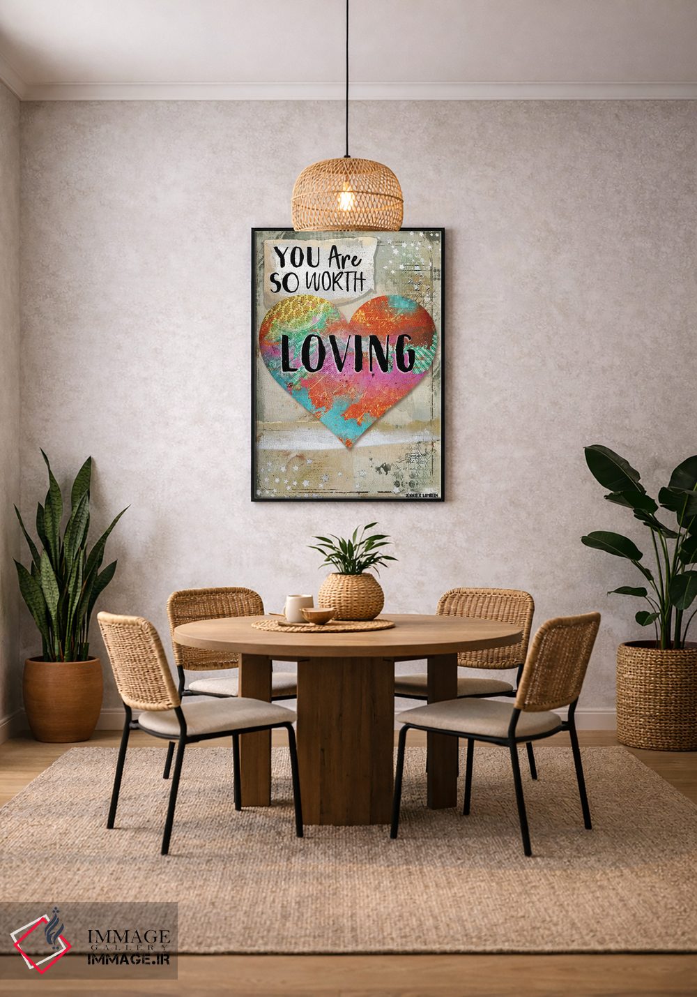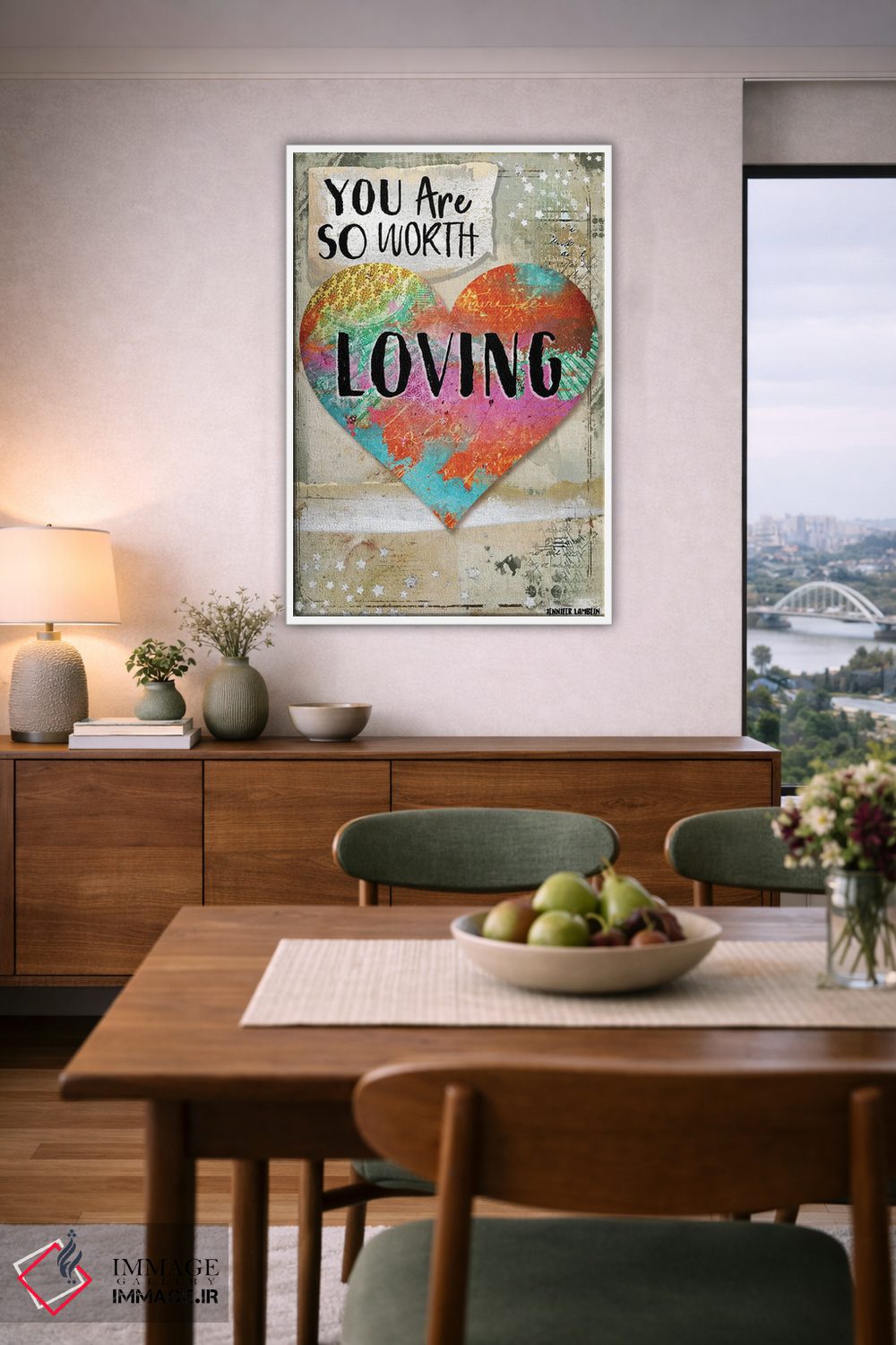 «تو ارزش دوست داشته شدن را داری» اثرِ «جنیفر لمباین» انتخابیست برای زمانی که تضادهای رنگی را خوشقوارهتر میکند؛ برای دیوارهای گالریوار و ترکیب چند اثر انتخابی عالی است. در کنار گیاهان آپارتمانی هم جلوهٔ لطیفی پیدا میکند.