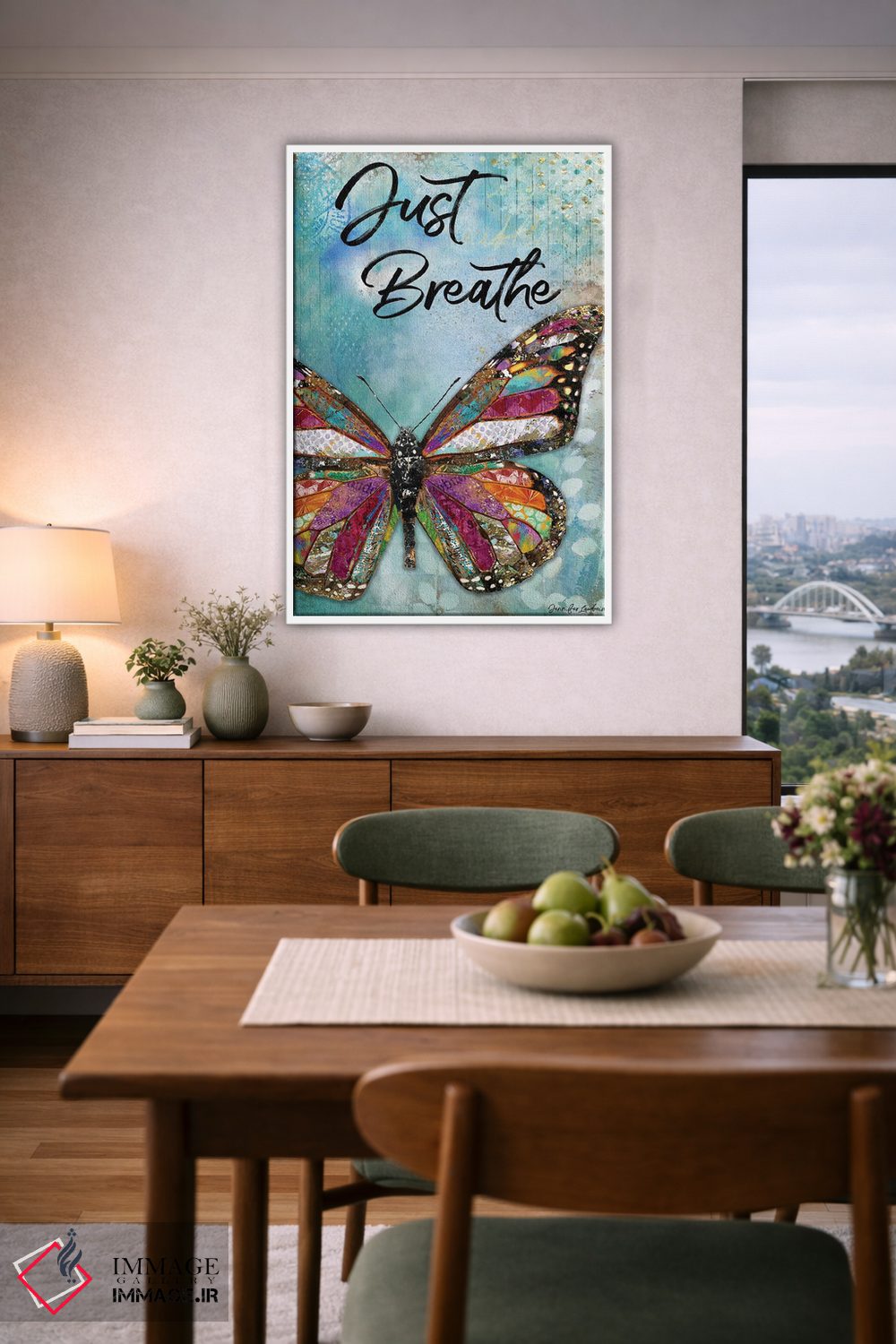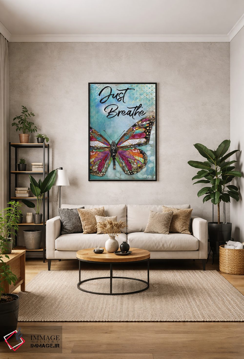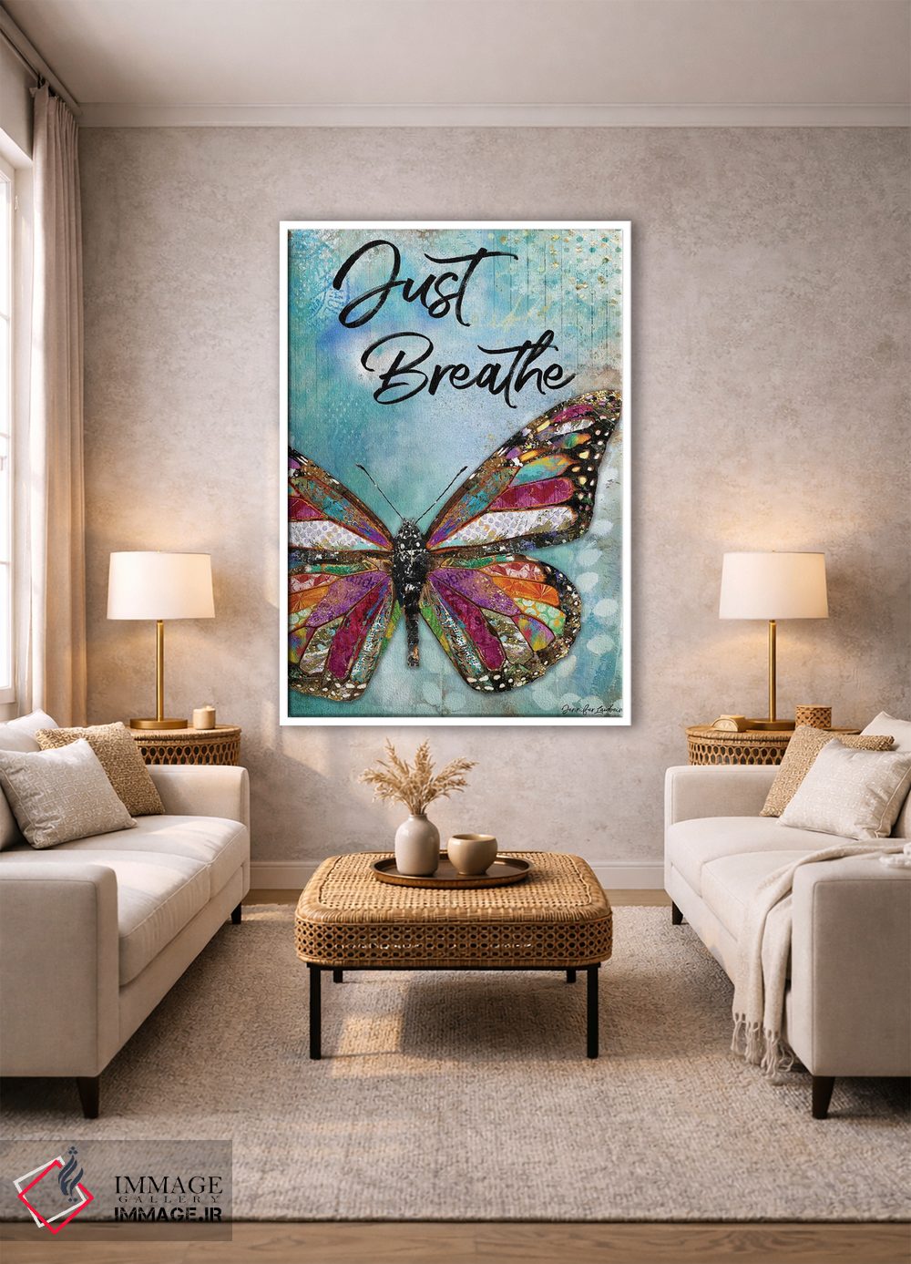 تابلو دکوراتیو فقط نفس بکش، پروانه اثر جنیفر لمباین - نمای روبه‌رو روی دیوار