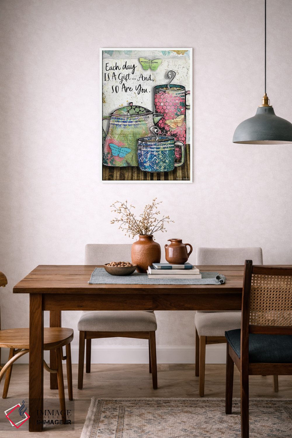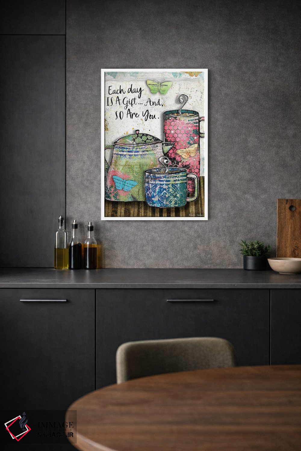 «هر روز یک هدیه است» اثرِ «جنیفر لمباین» بهخاطر ساختار گرافیکیاش، کنار رنگهای خنثی و دکور صنعتی هم خوب جلوه میکند.
