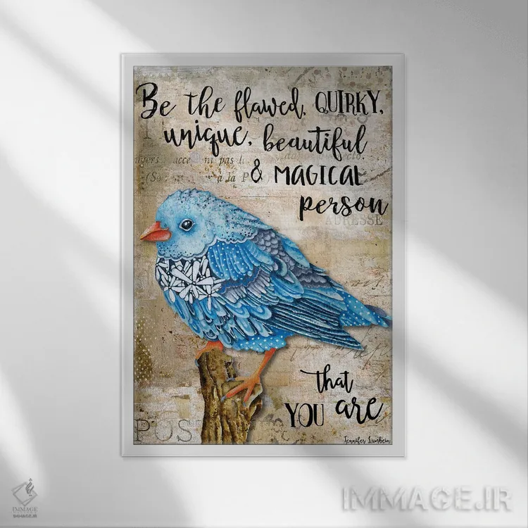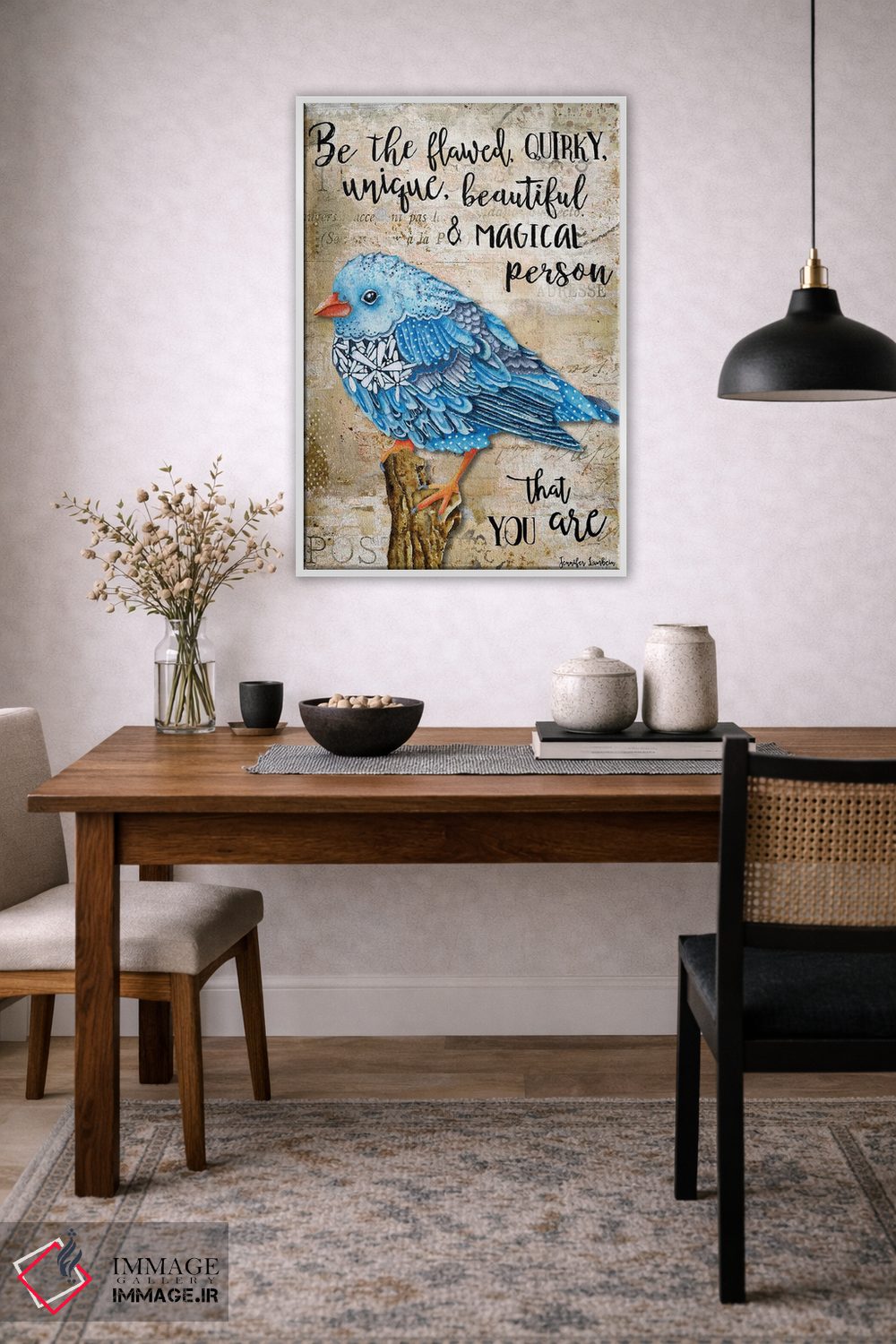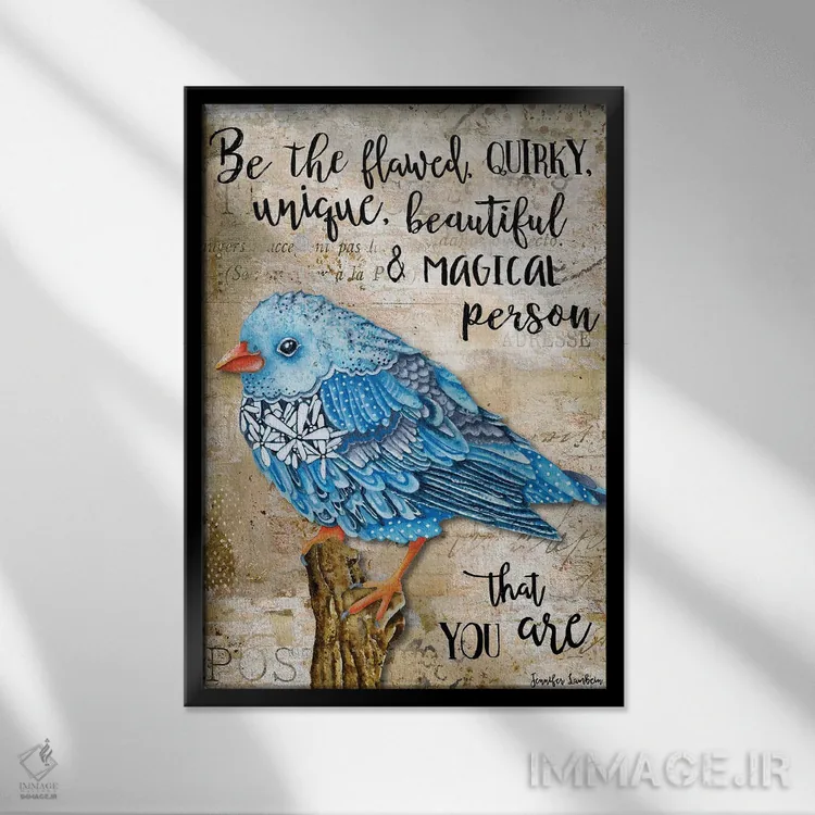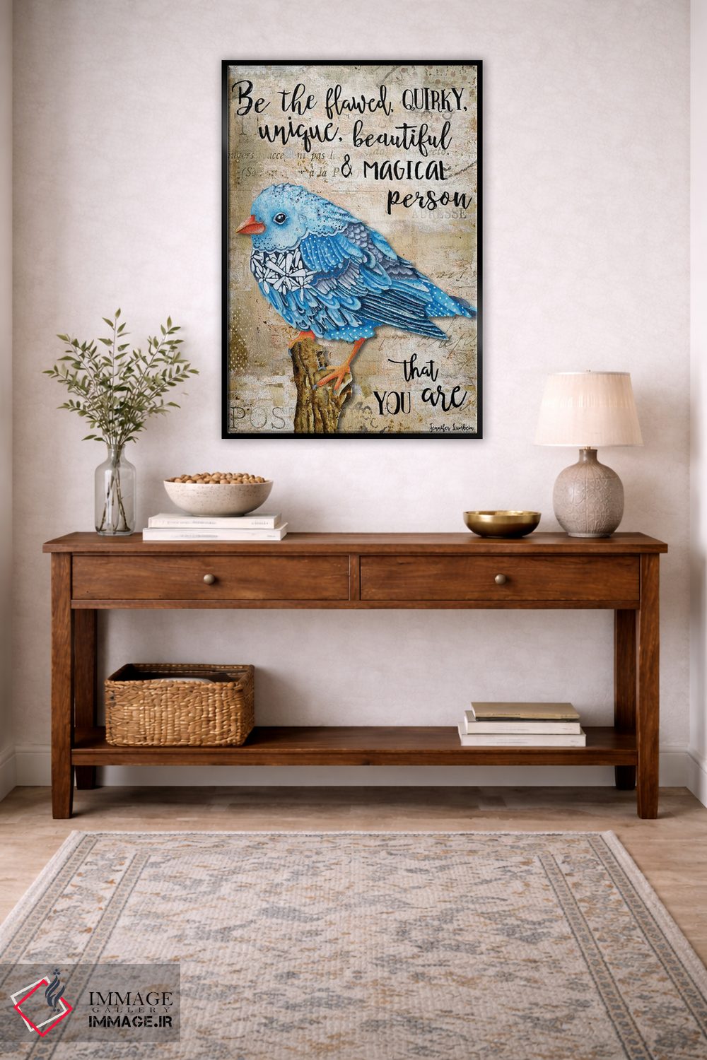 در «همان پرندهٔ ناقص باش» اثرِ «جنیفر لمباین»، تاکید روی خوانایی و ریتم حروف است؛ مناسب برای فضاهای پررفتوآمد مثل راهرو و ورودی.