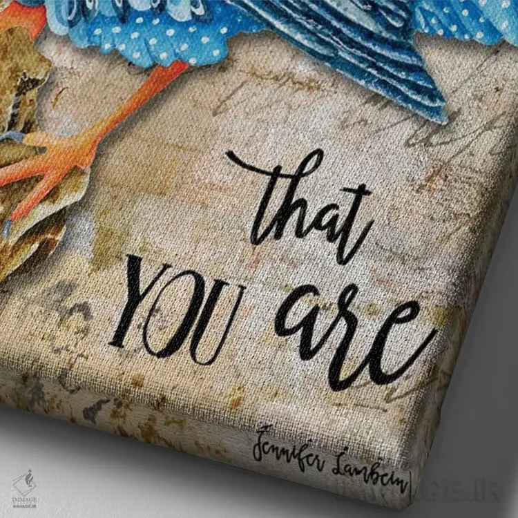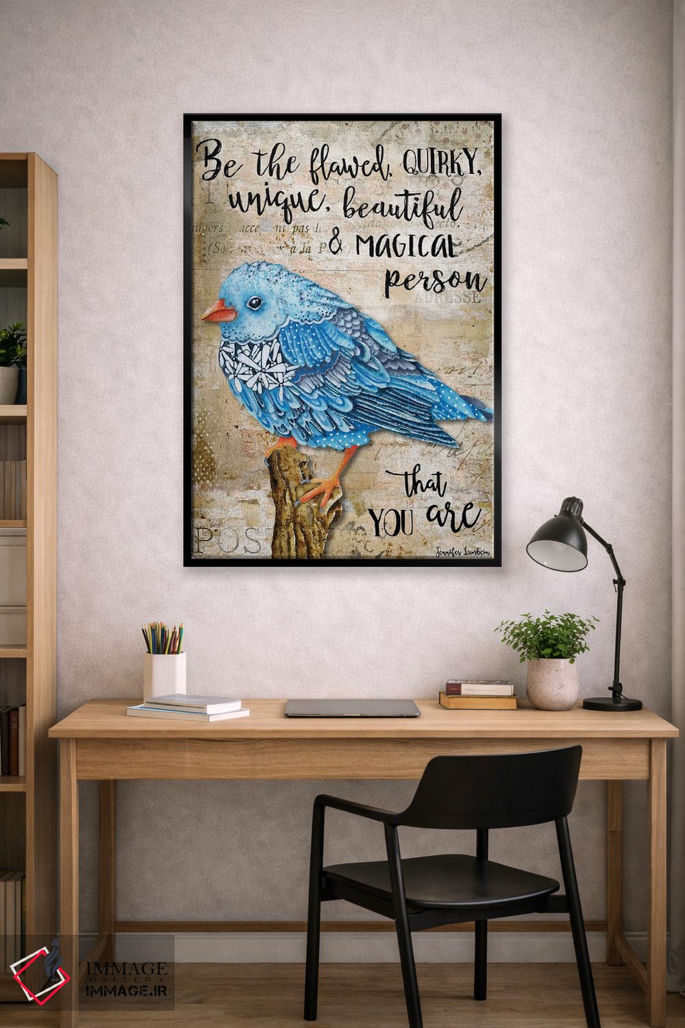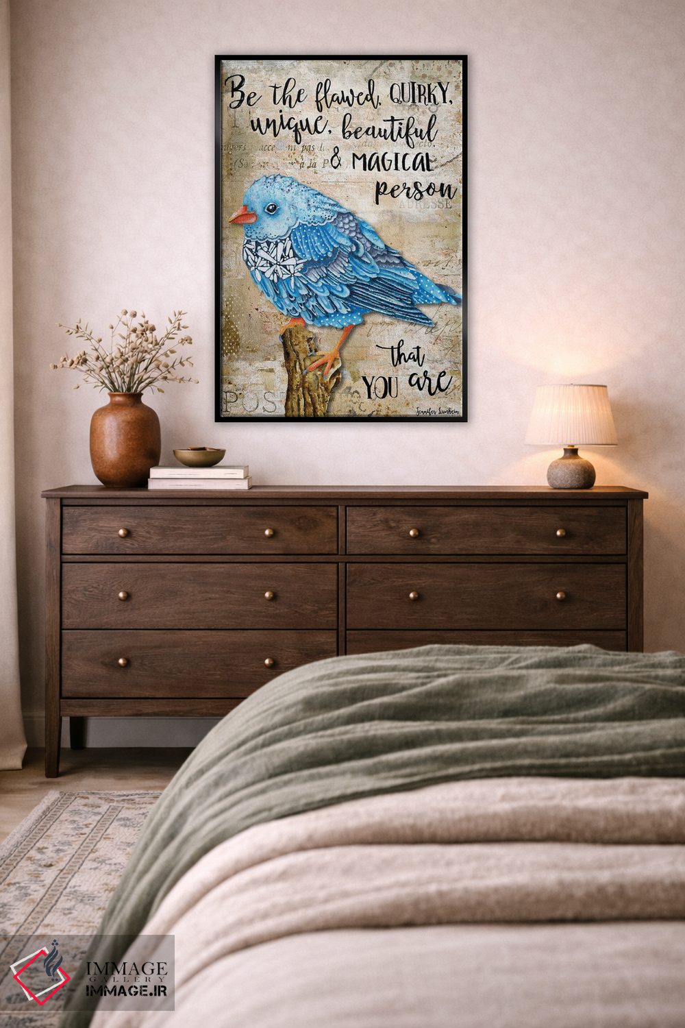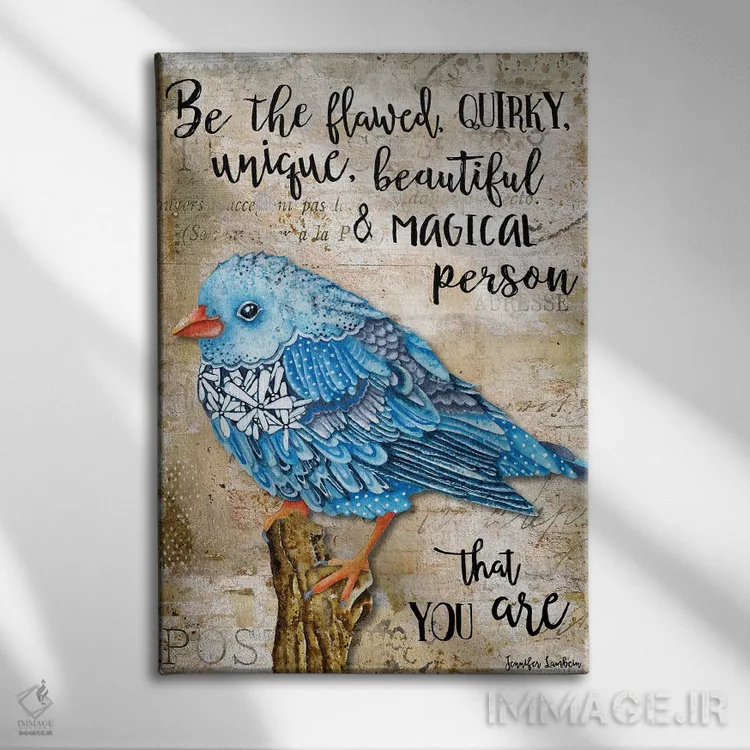 در «همان پرندهٔ ناقص باش» اثرِ «جنیفر لمباین»، تاکید روی خوانایی و ریتم حروف است؛ مناسب برای فضاهای پررفتوآمد مثل راهرو و ورودی.