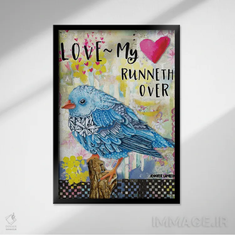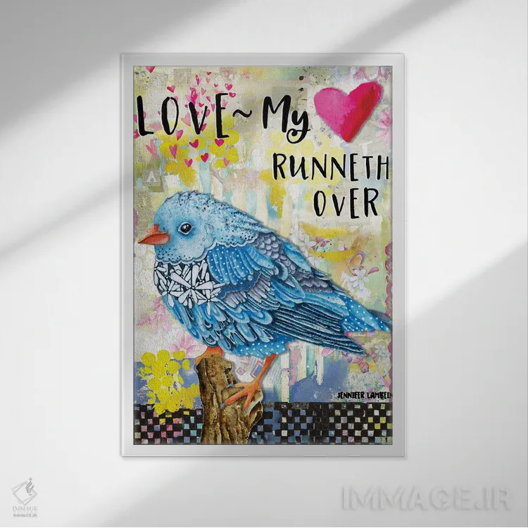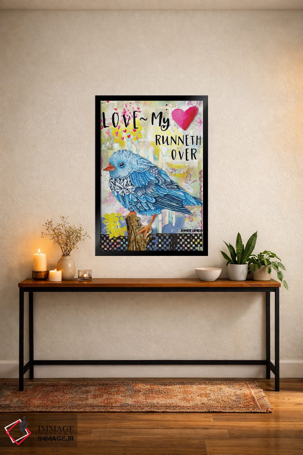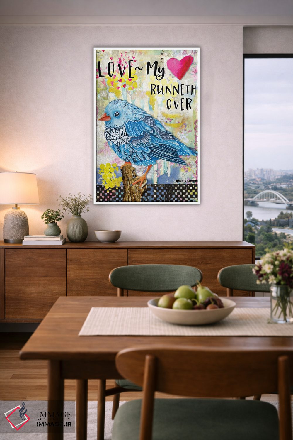 «My Cup Runneth Over، عشق، جام حیاتم لبریز است» اثرِ «جنیفر لمباین» یک قاب تایپوگرافیک است که ریتم فضا را منظم نگه میدارد؛ برای دیوارهای سفید و چیدمانهای ساده، گزینهی خوبی است.