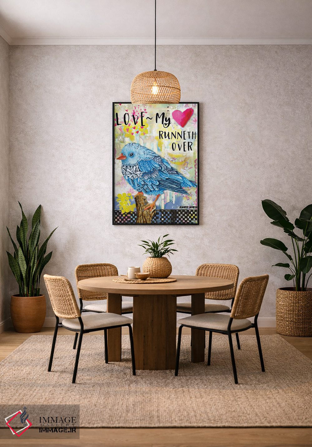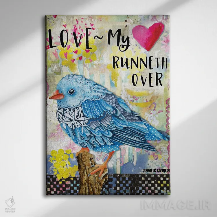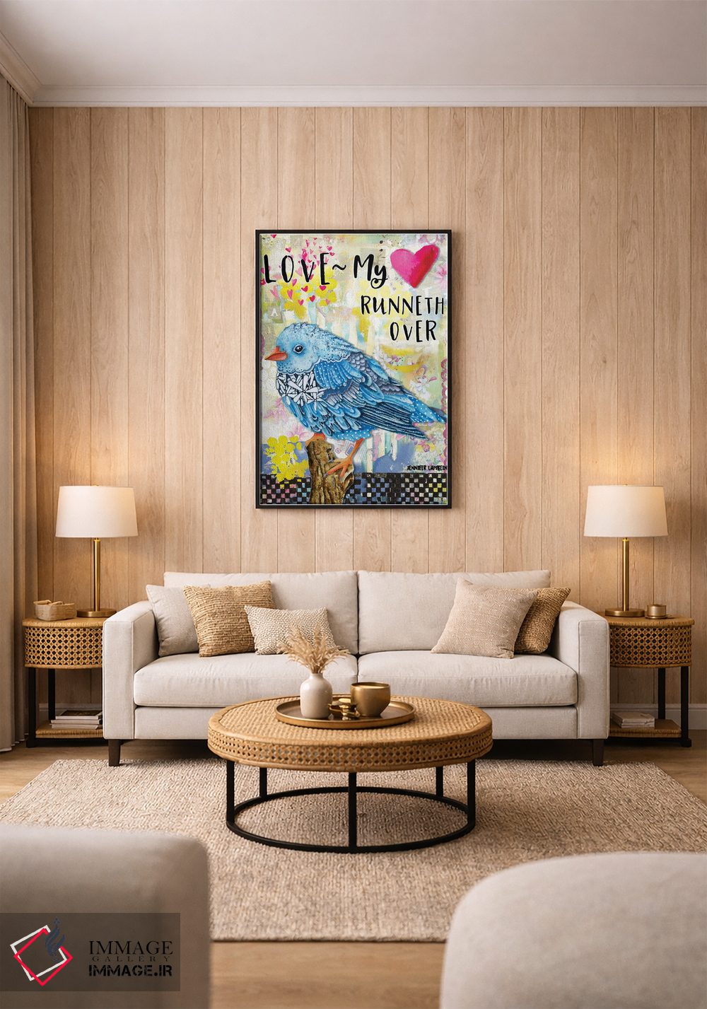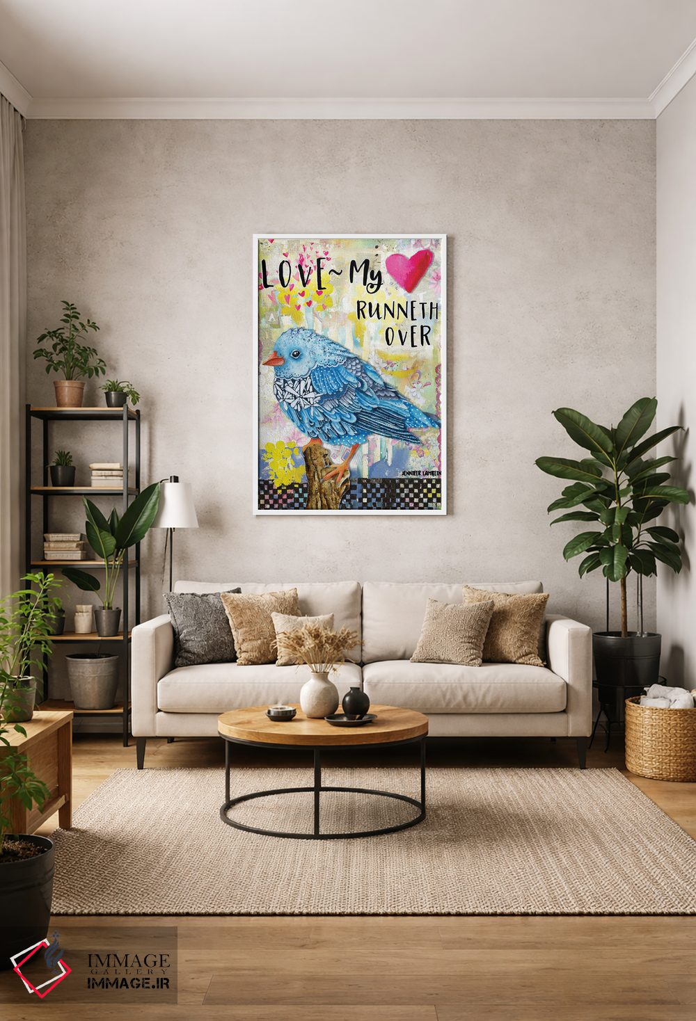 «My Cup Runneth Over، عشق، جام حیاتم لبریز است» اثرِ «جنیفر لمباین» یک قاب تایپوگرافیک است که ریتم فضا را منظم نگه میدارد؛ برای دیوارهای سفید و چیدمانهای ساده، گزینهی خوبی است.